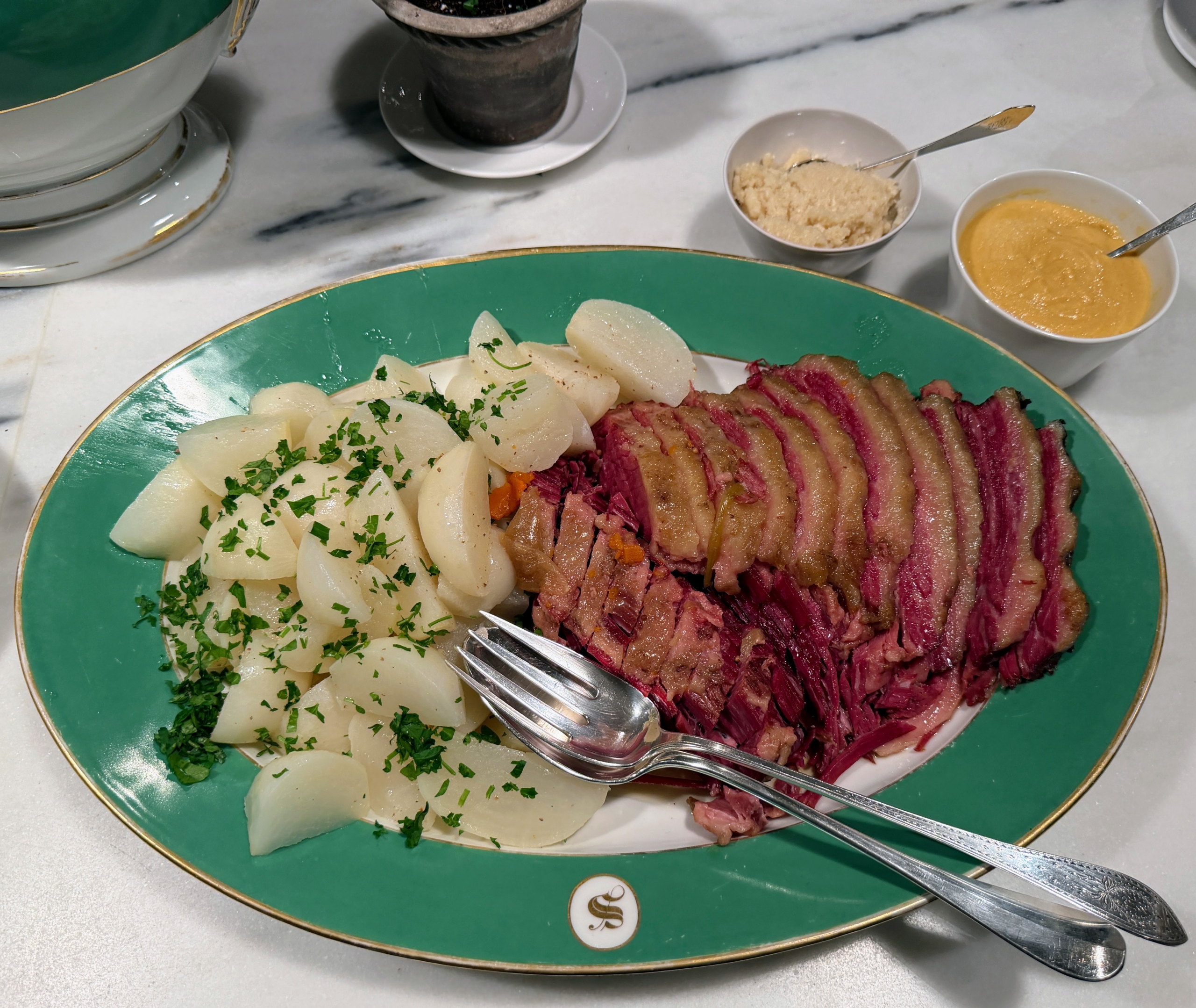 - This is a platter of turnips and corned beef. In Ireland, beef was a meat reserved only for the wealthy. The Great Famine resulting from potato blight caused a mass migration of the Irish to the new world. In America, corned beef was readily available to Irish immigrants and became a favored comfort food.