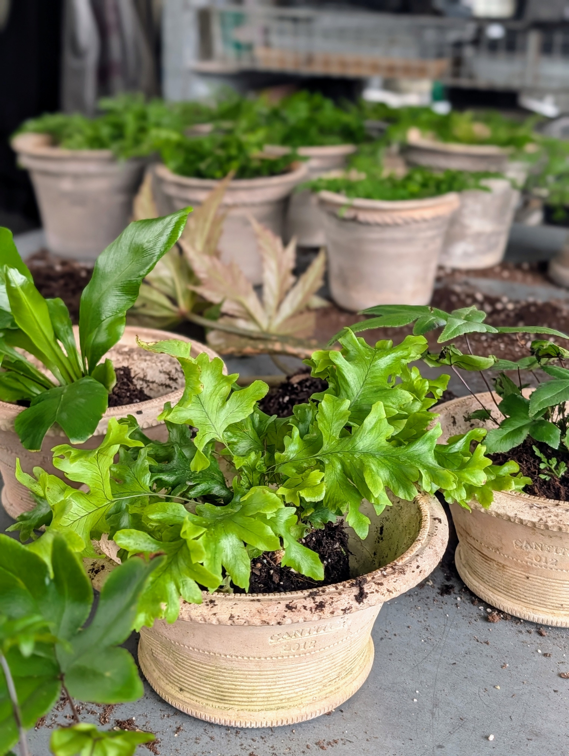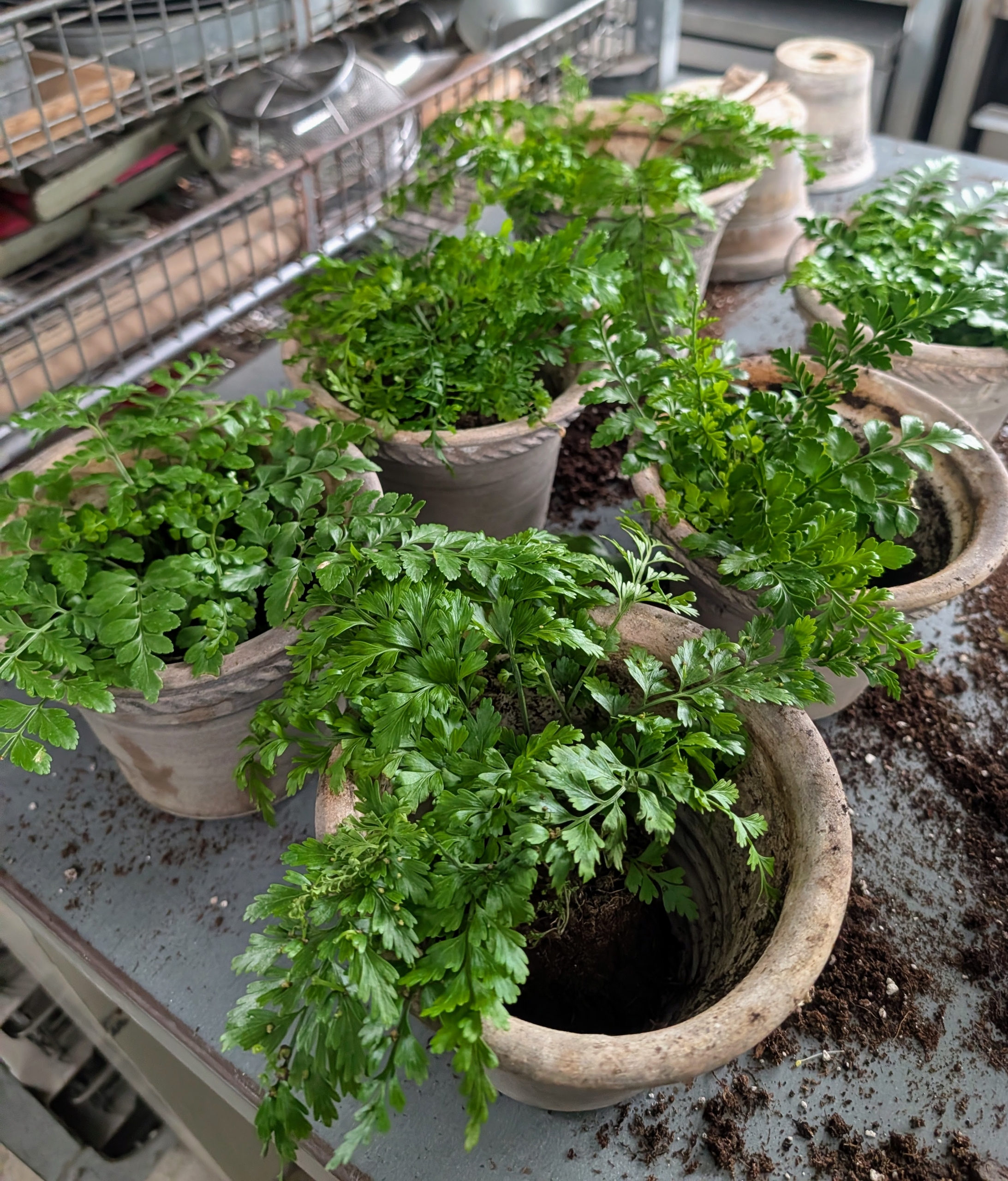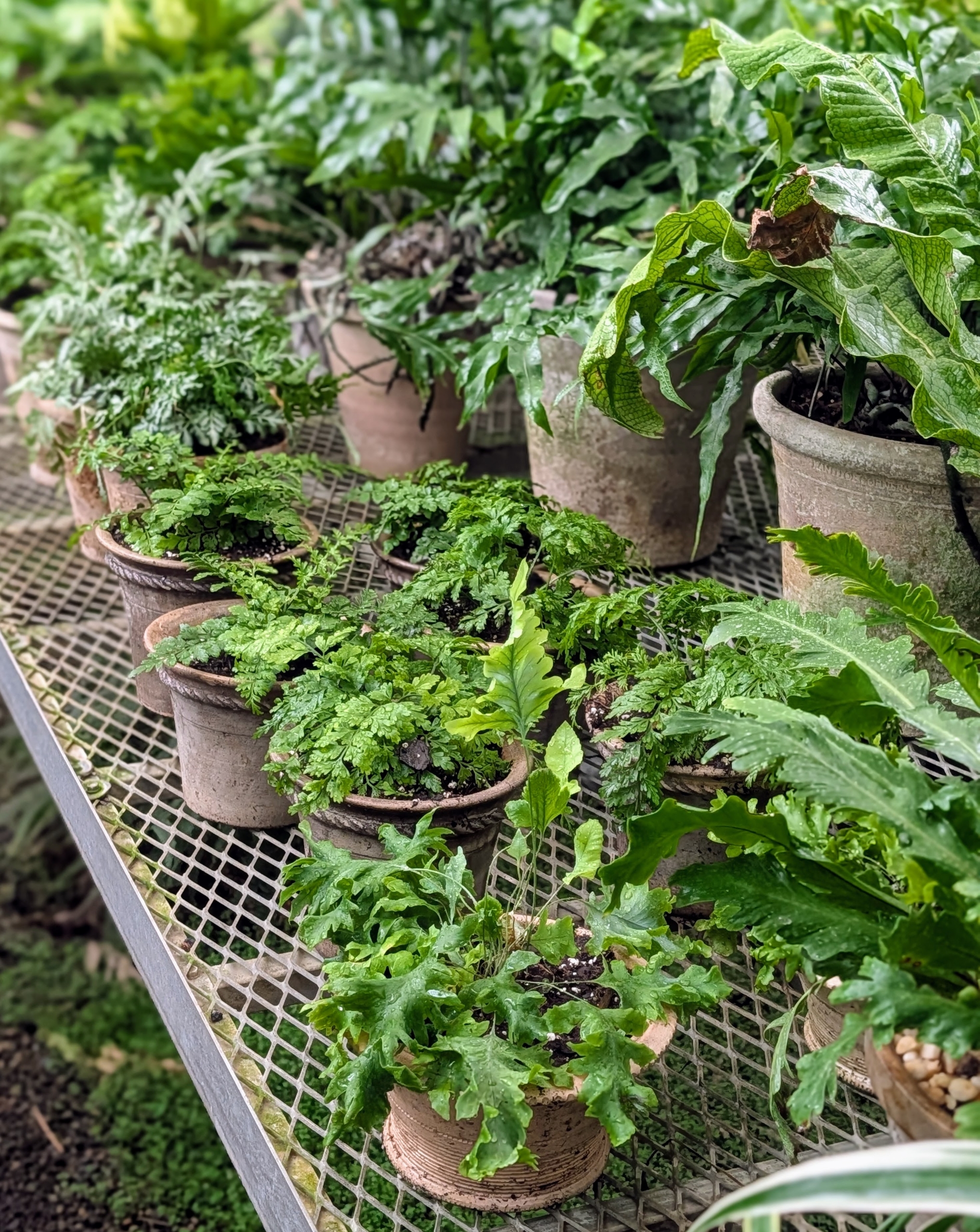 Walking through my greenhouses, one sees potted plants of all sizes - gorgeous giant agaves, palms, and other tropicals that I display outdoors during summer. And smaller tabletop container plants that I bring into my home whenever I entertain. These plants look beautiful arranged in my enclosed porch, set on various surfaces in my sitting room, or lined up as centerpieces on my dining room table. Among them - lush ferns with their interesting frond shapes and textures. My head gardener, Ryan McCallister, just potted up some new additions.