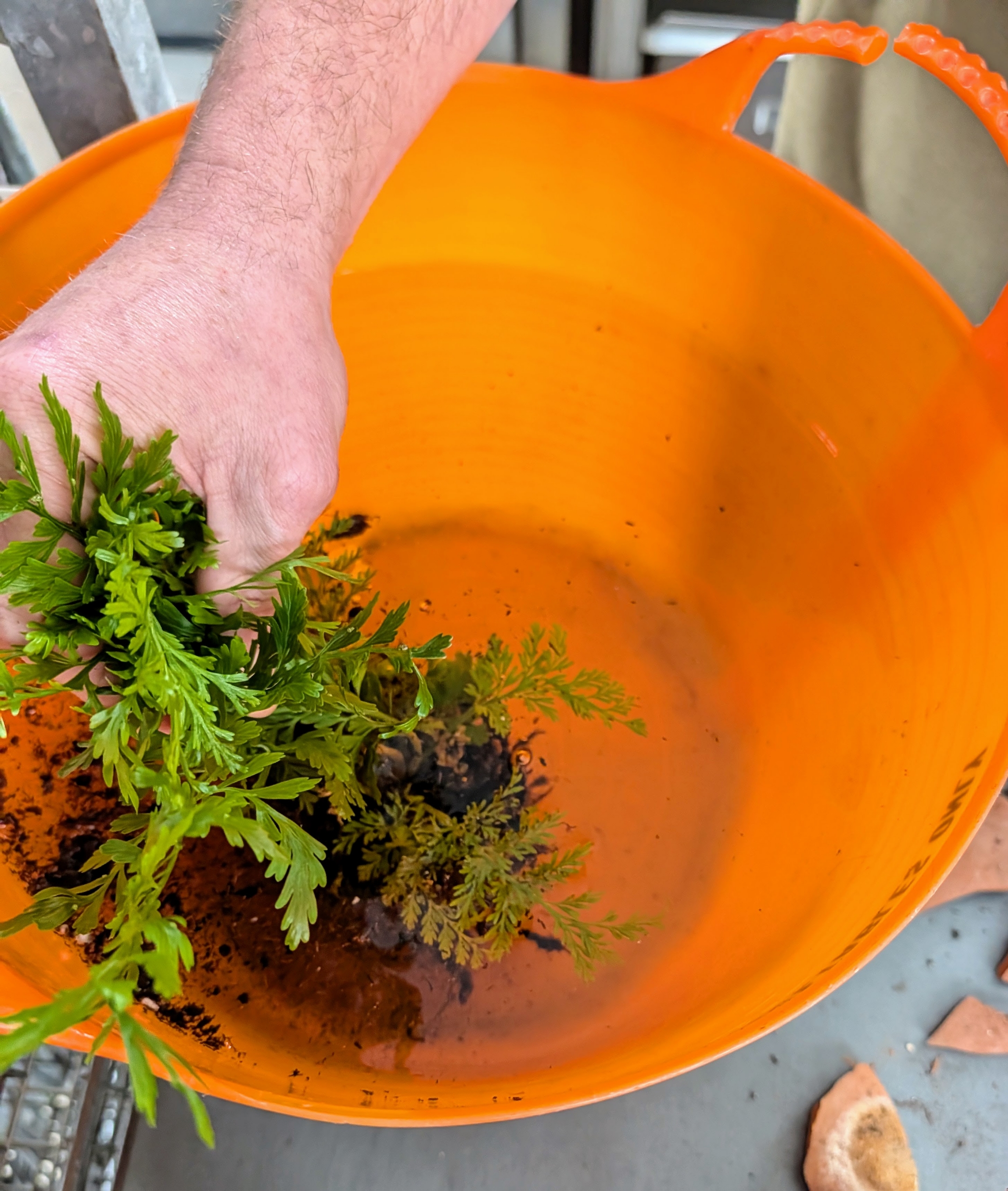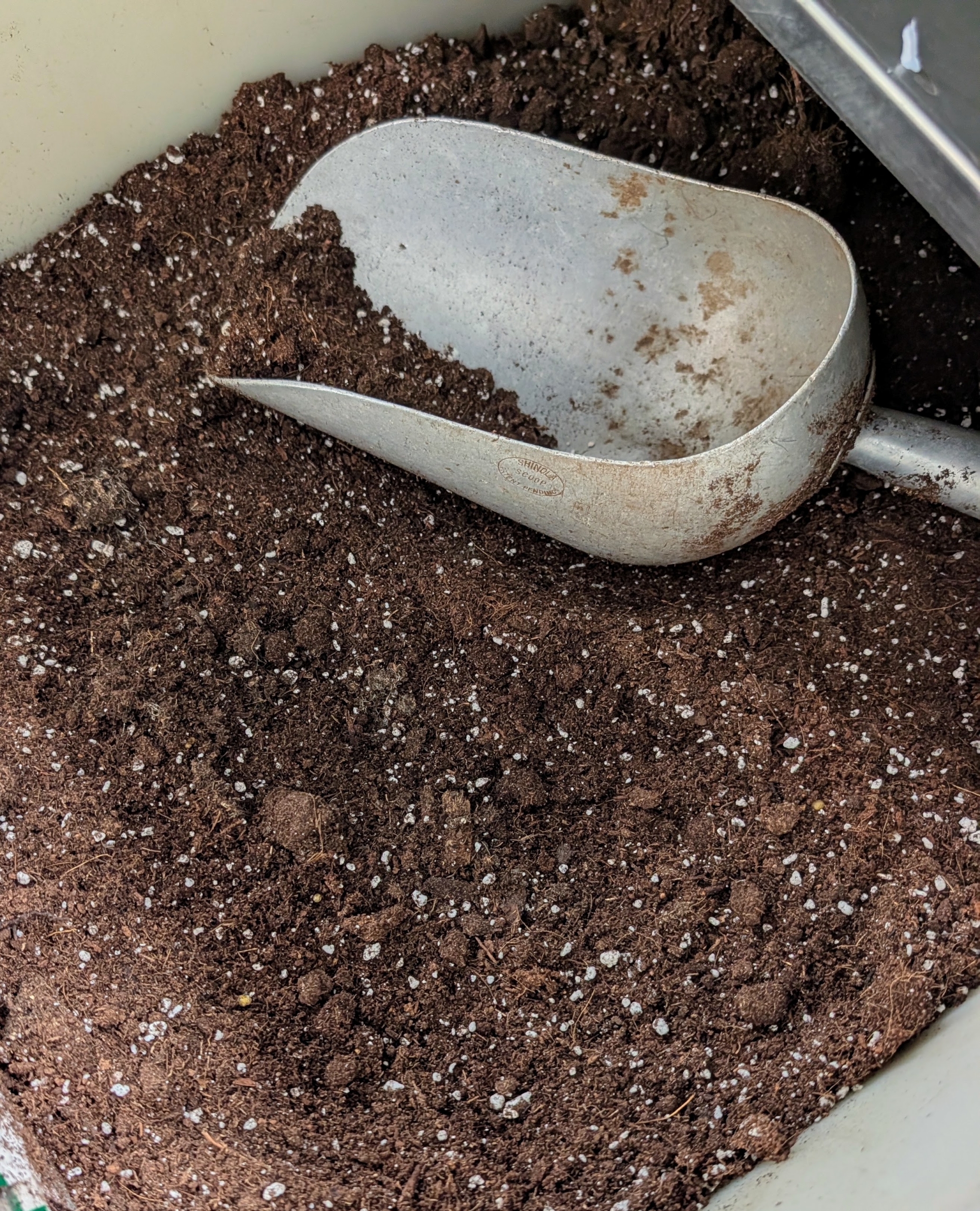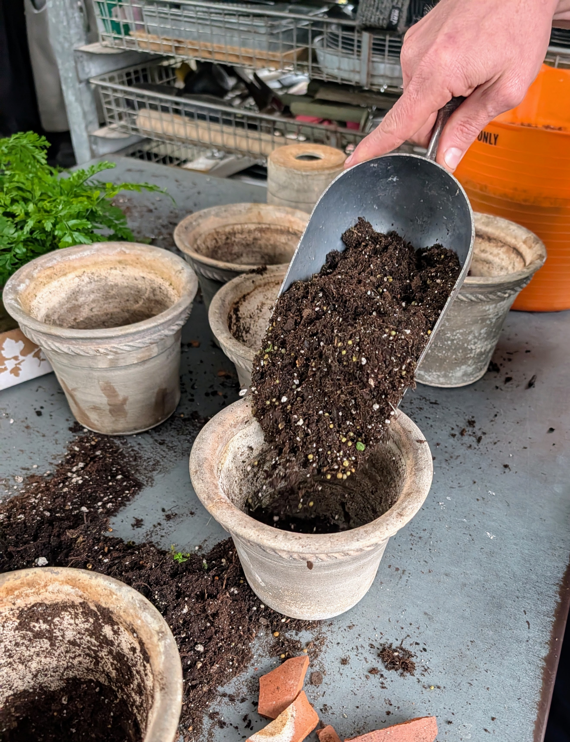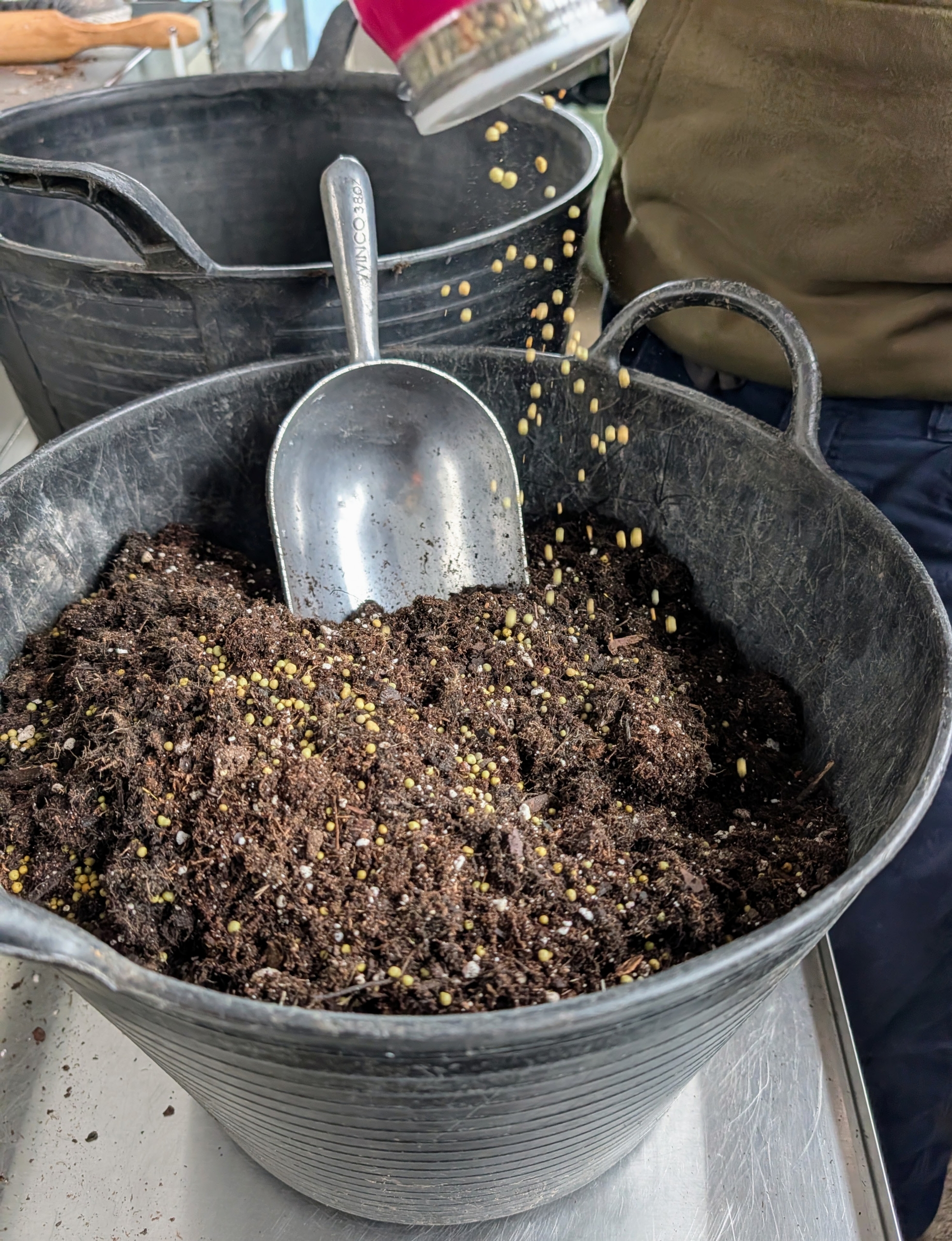 - Ryan thoroughly combines enough of the elements in a trug bucket, so he can fill all the pots.