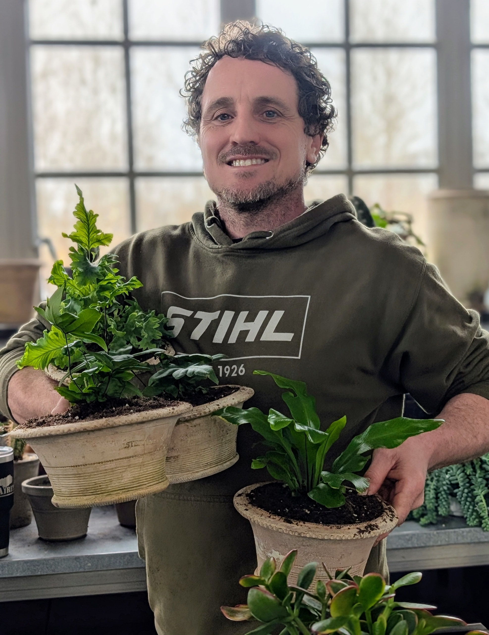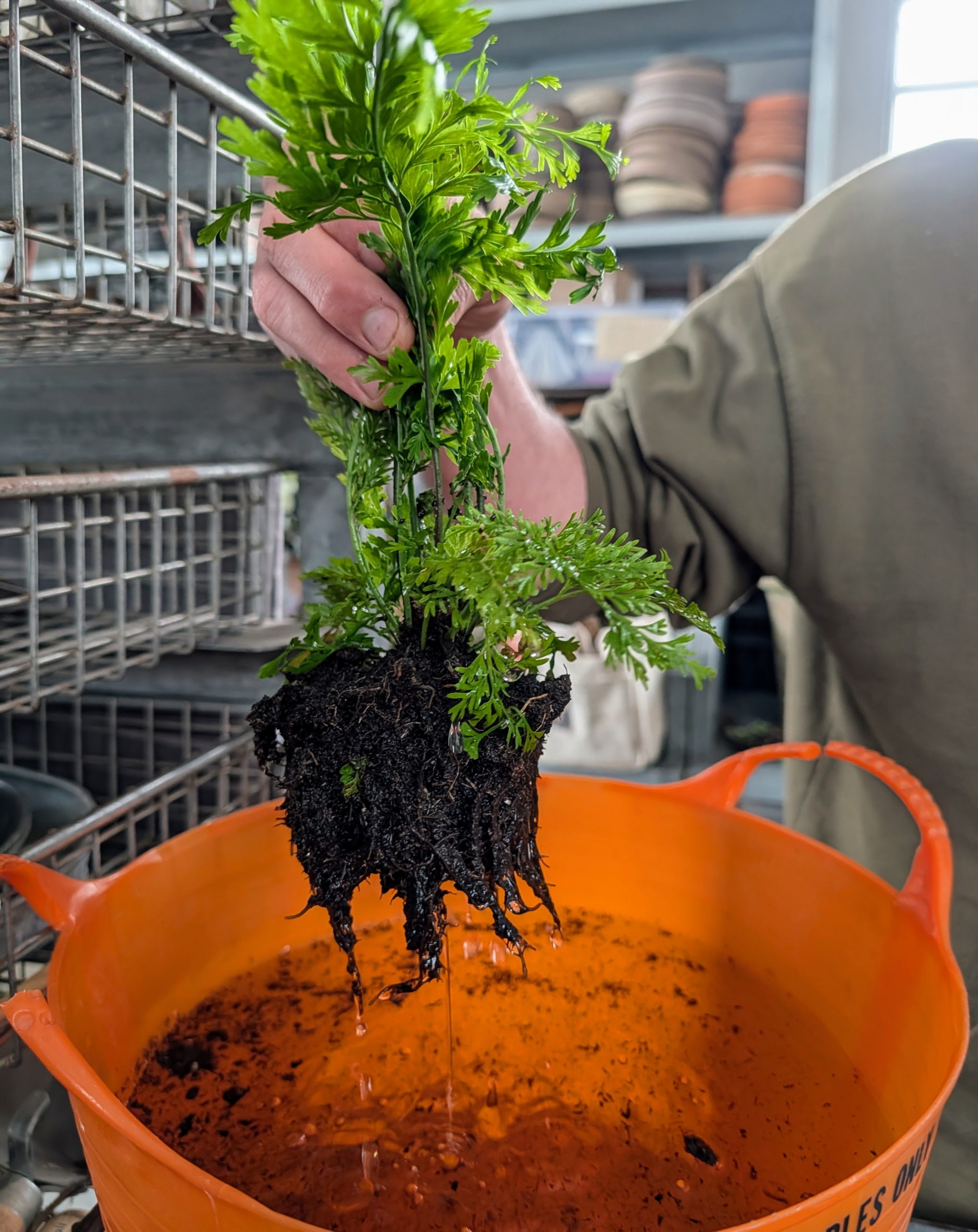 - Ryan gathers finished potted plants and takes them to the greenhouse for another thorough drink.