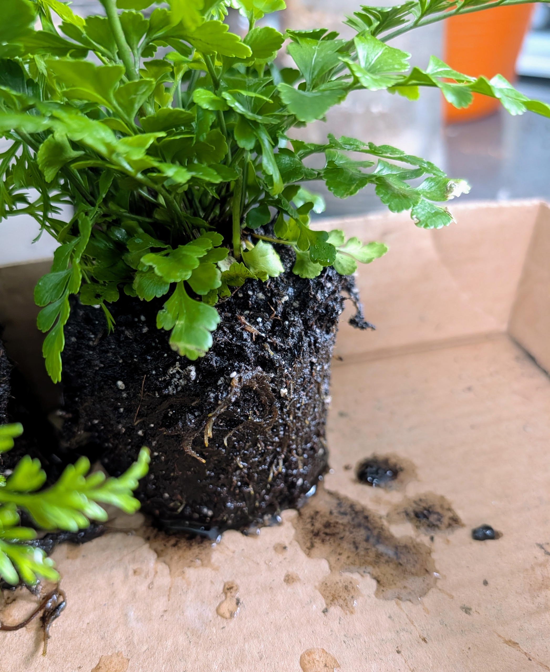 - Then each root ball is placed into a cardboard box to drain slightly until it is potted.