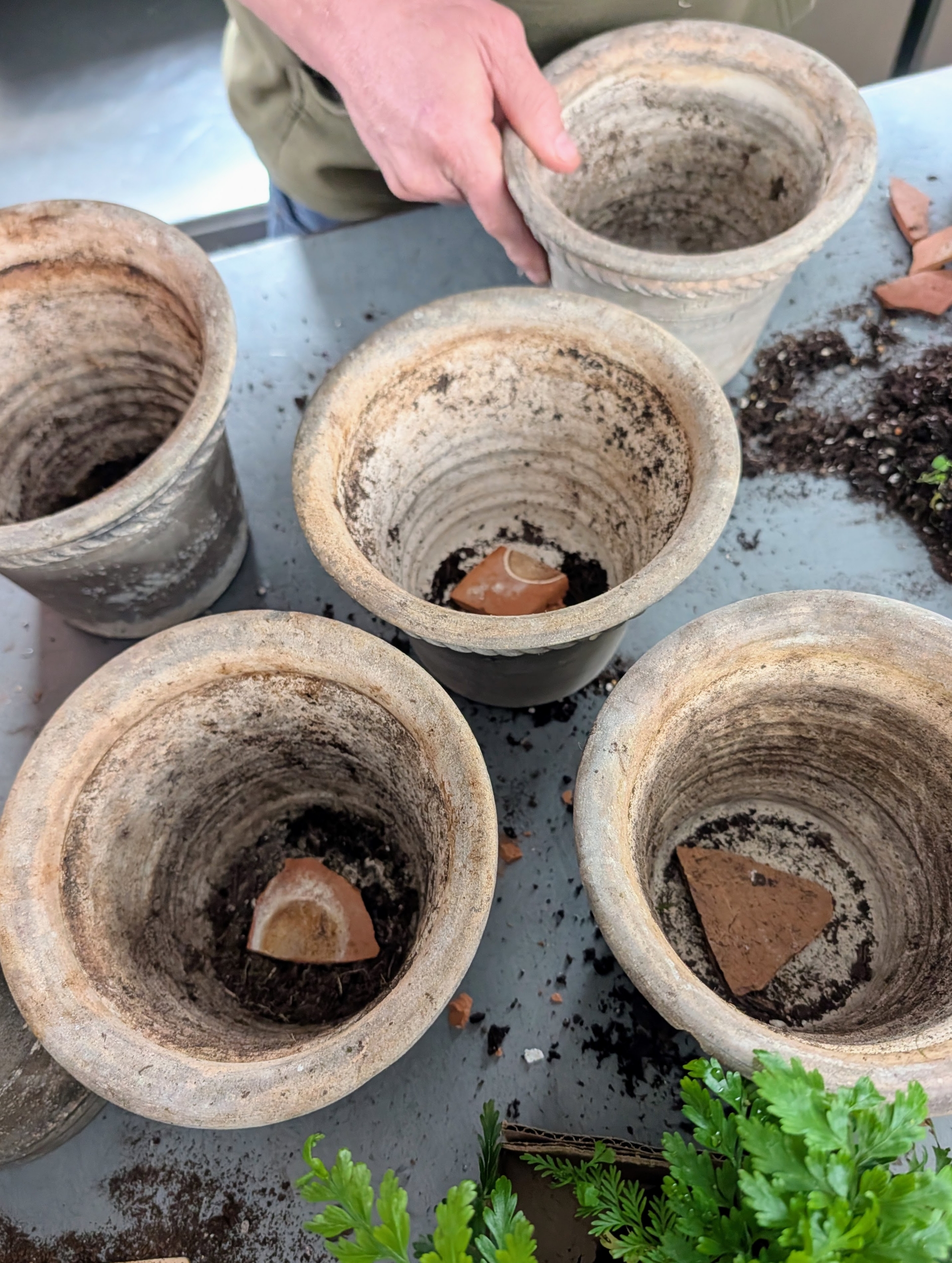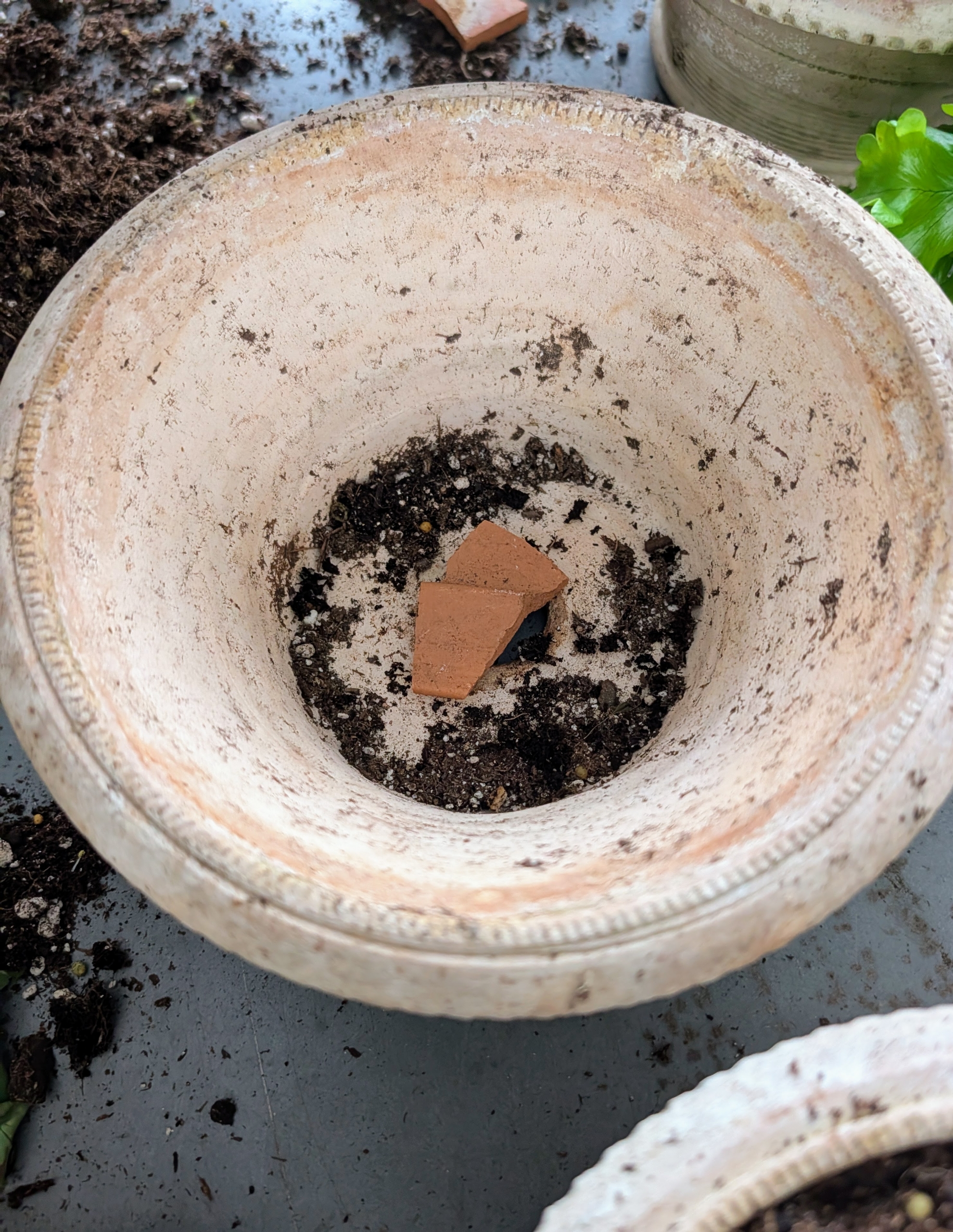 - Each pot has a drainage hole. A clay shard is placed over the hole to help with drainage. I also like to use clay pots because they allow proper aeration and moisture to penetrate through the sides and to the plant.