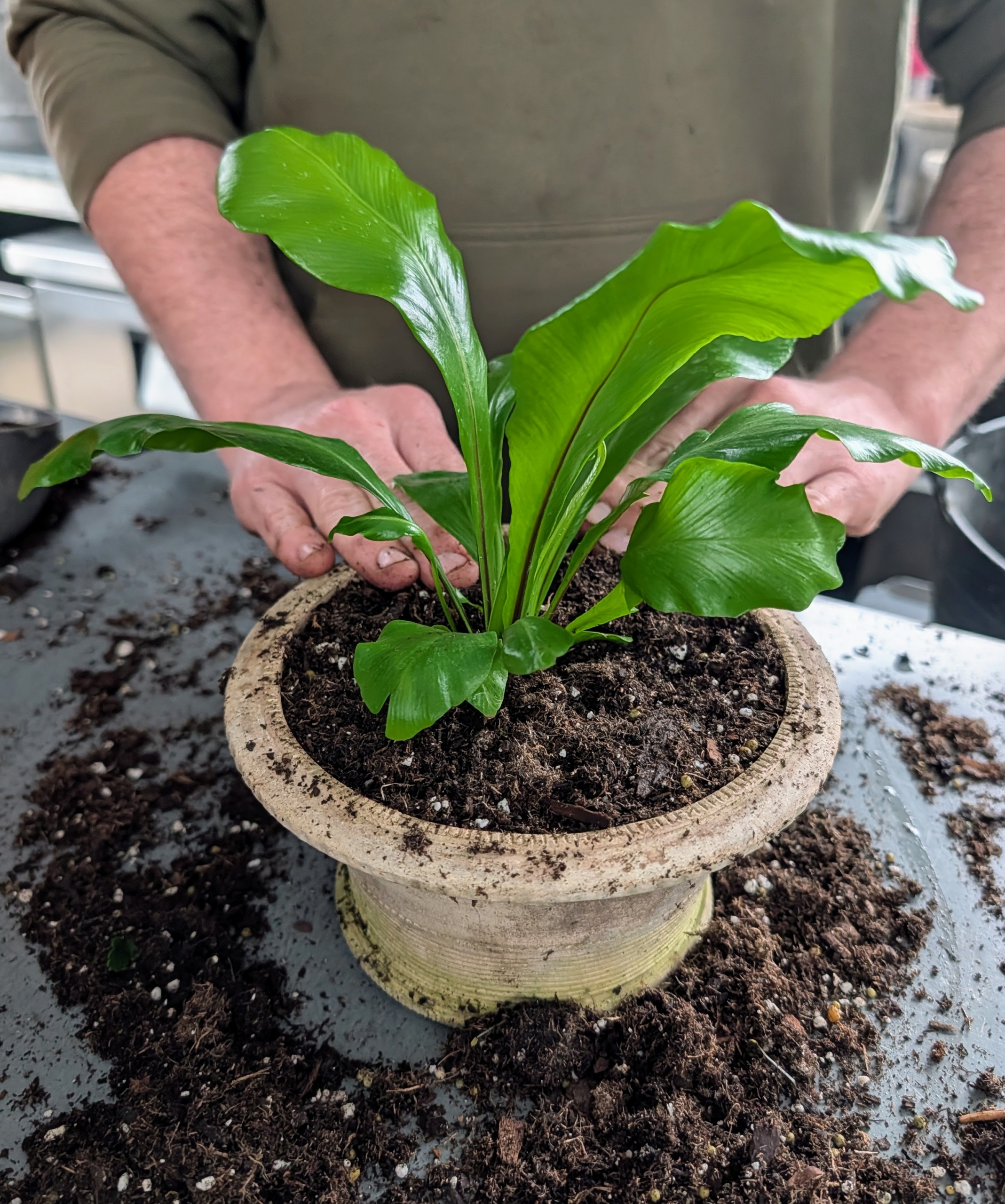 - Ryan places the plant in the pot at the same height it was previously.