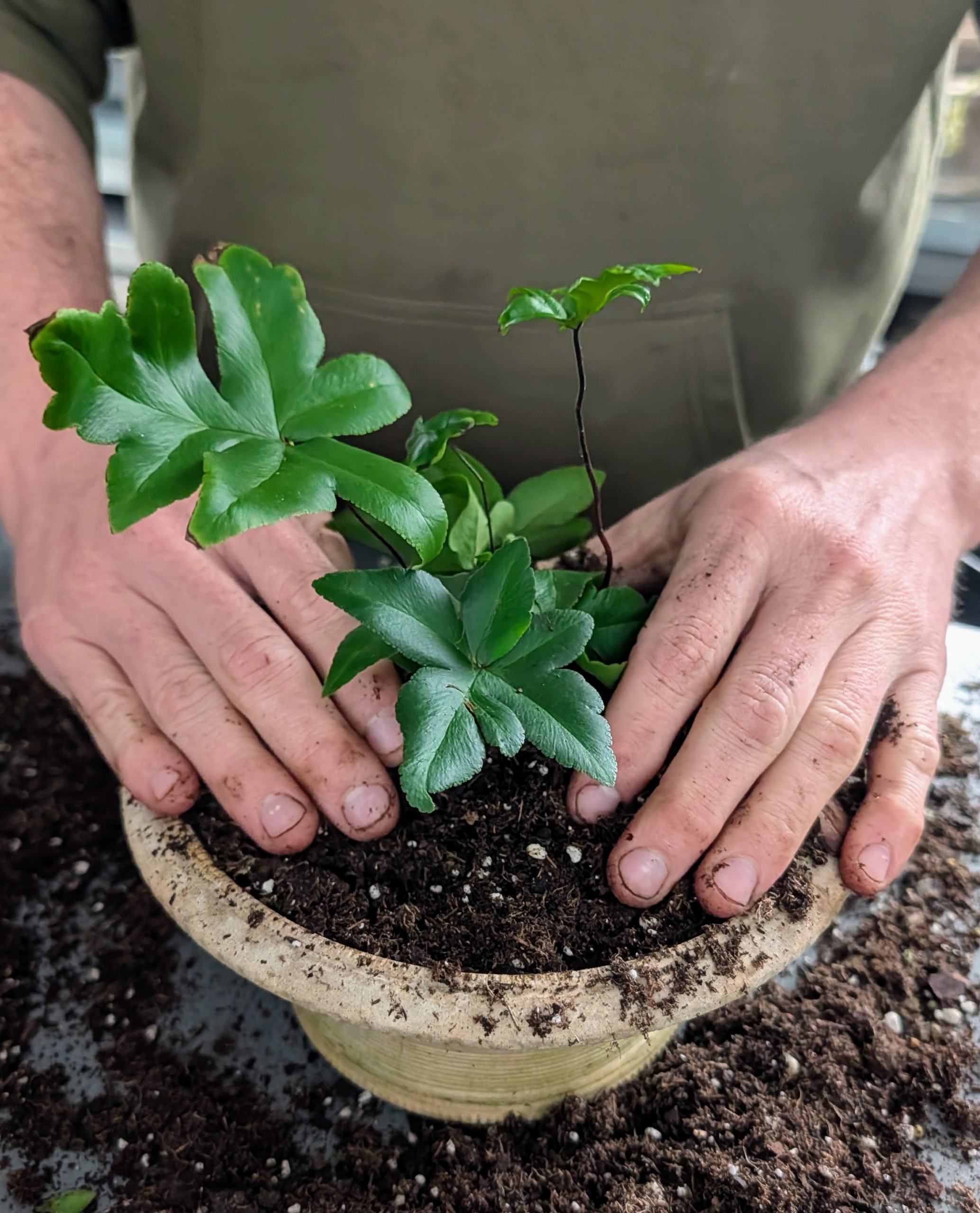 - Once potted and backfilled, Ryan presses down slightly on the soil to ensure there is good contact between the plant and the potting mix.