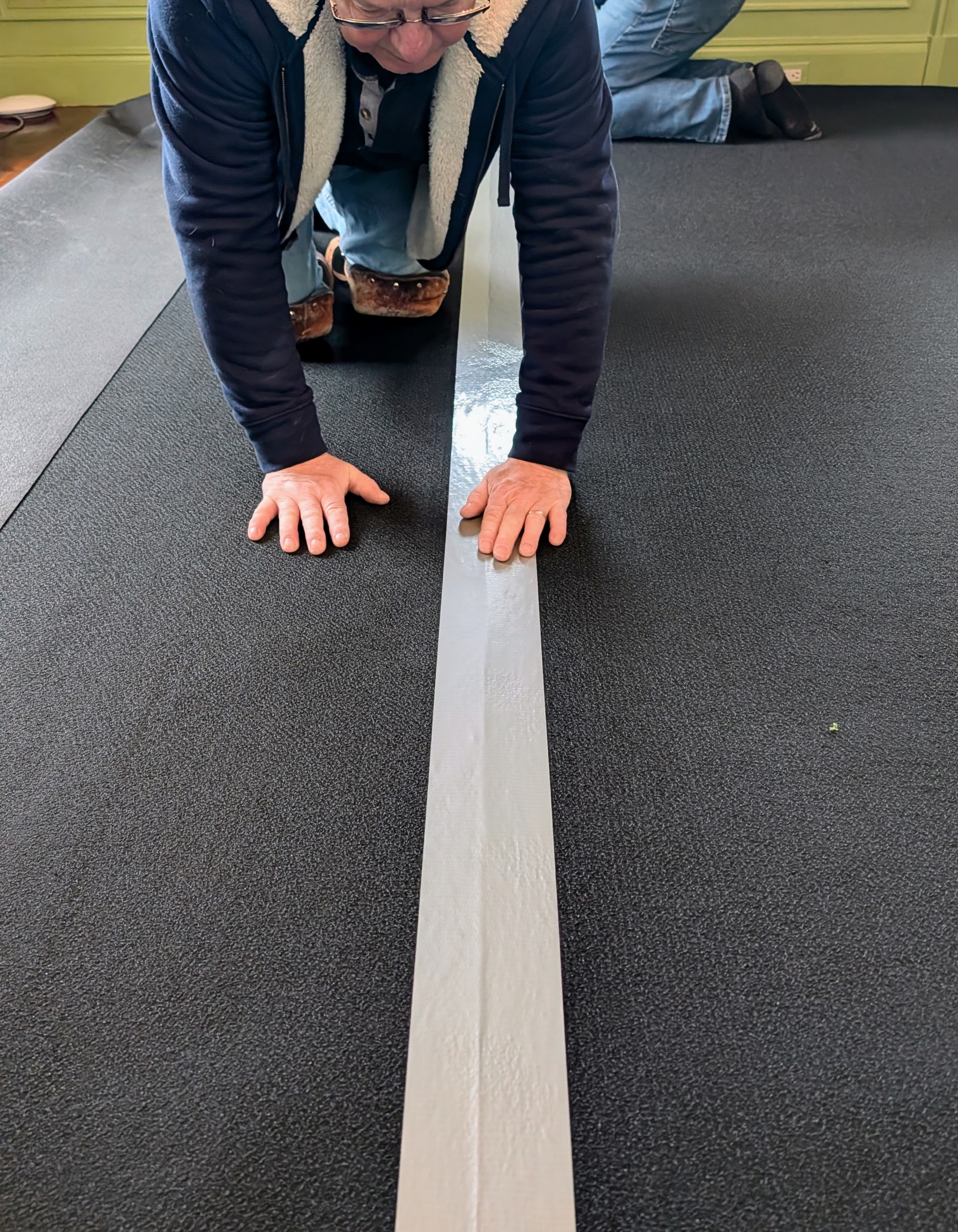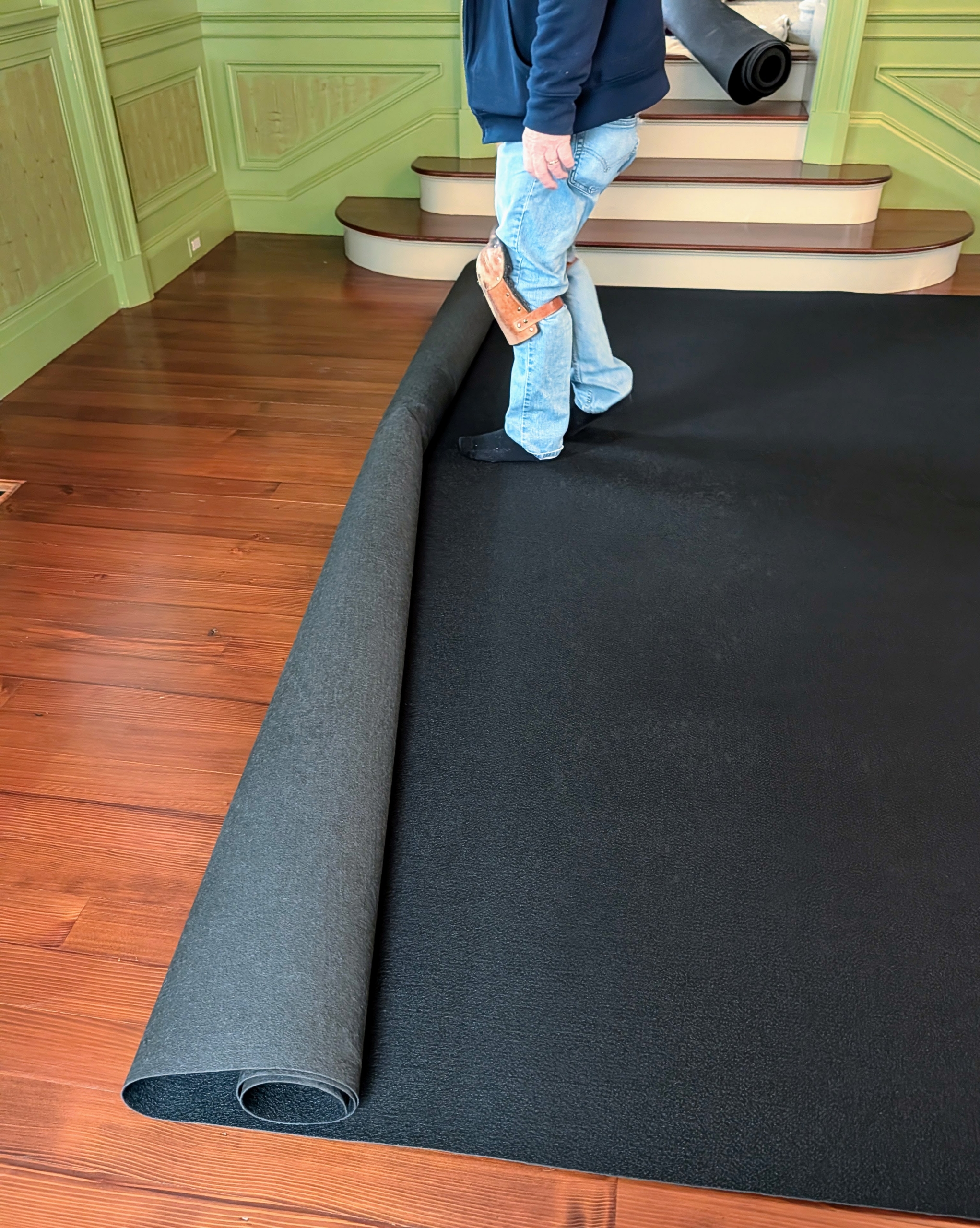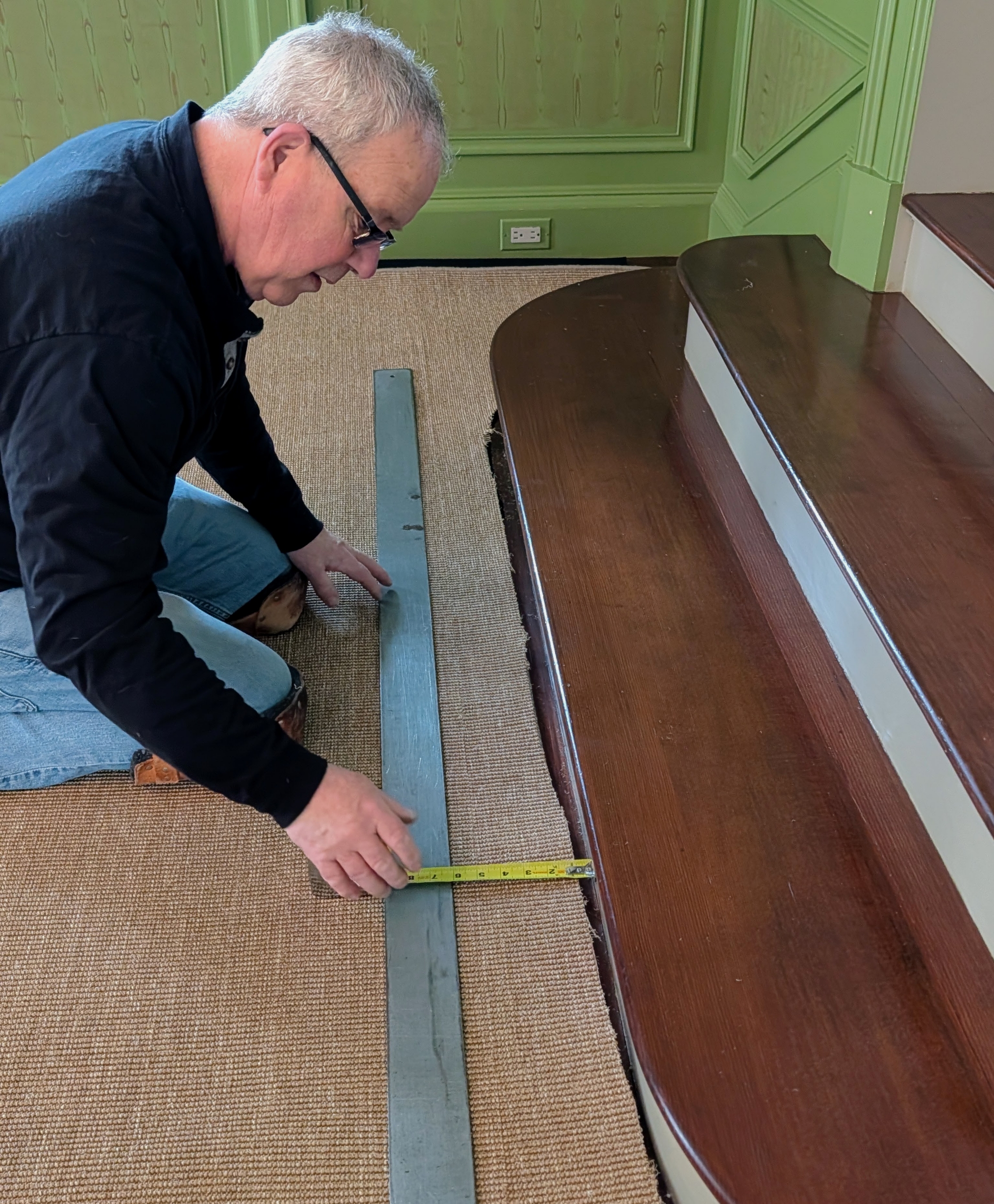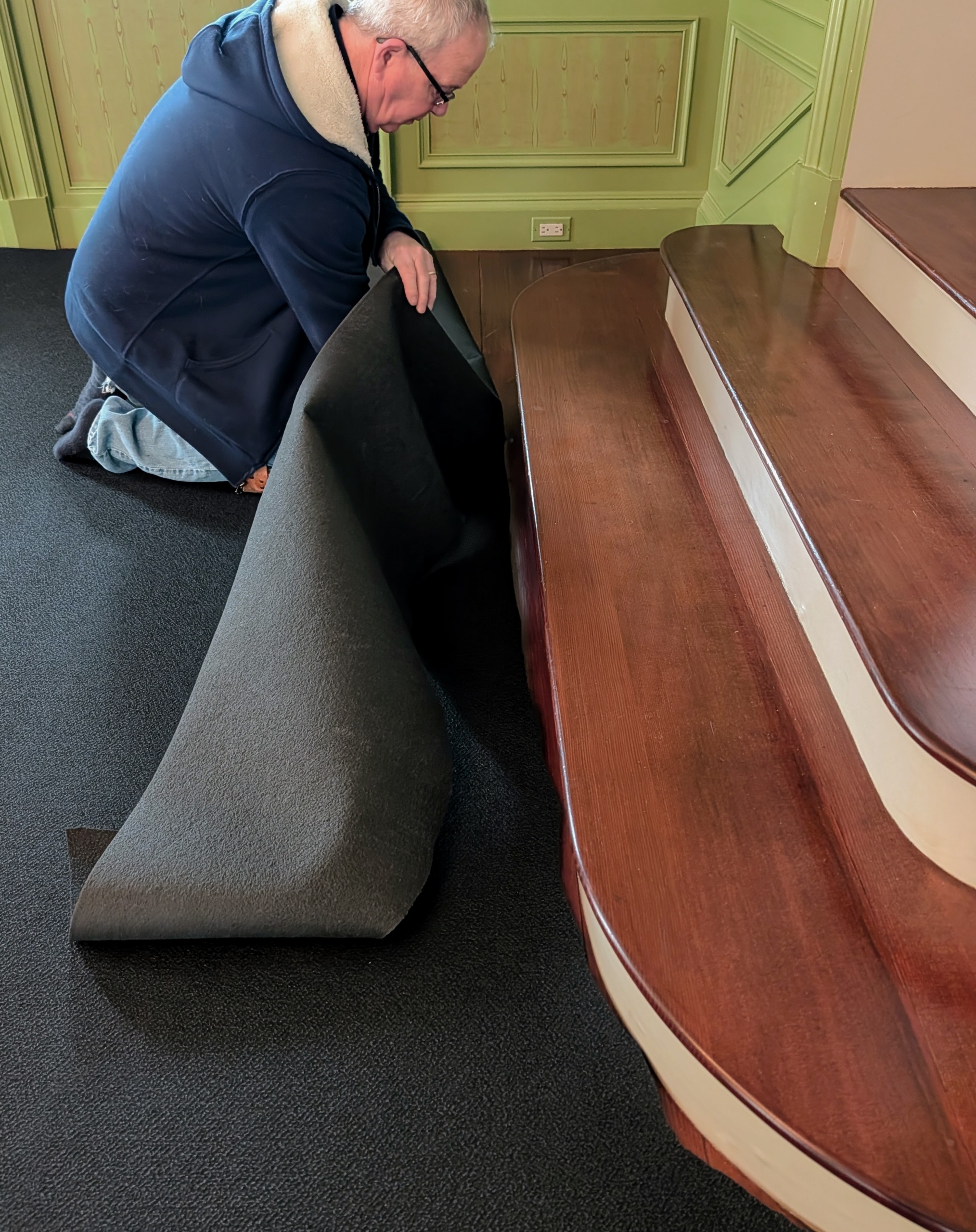 - Here, Dave carefully cuts the padding to fit around the stairs into the parlor.
