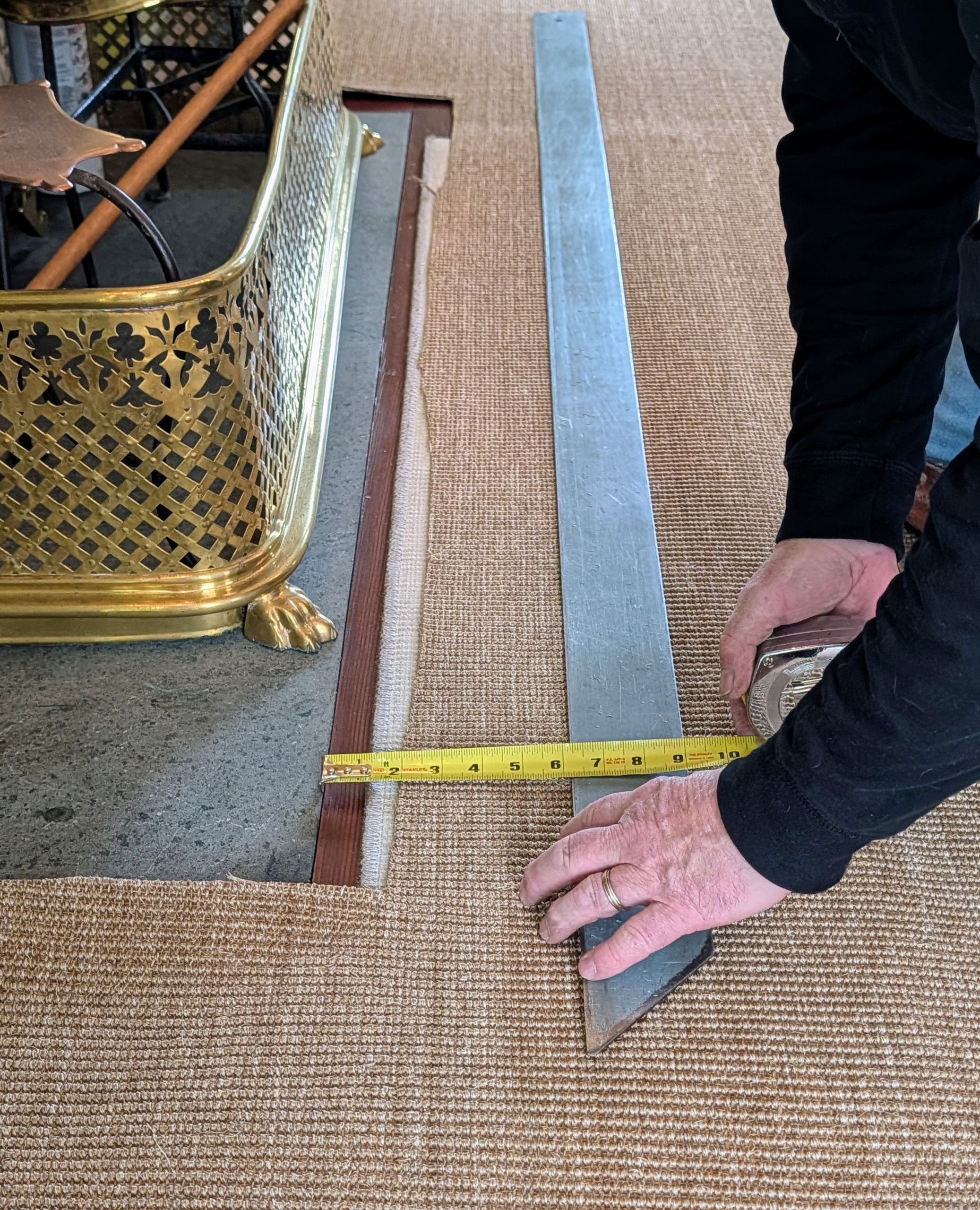- Because the carpet is cut slightly smaller than the space to expose the wood floors, the area between the carpet edges and the walls must be measured several times. This carpet is about four-and-a-half inches from the wall along every side.