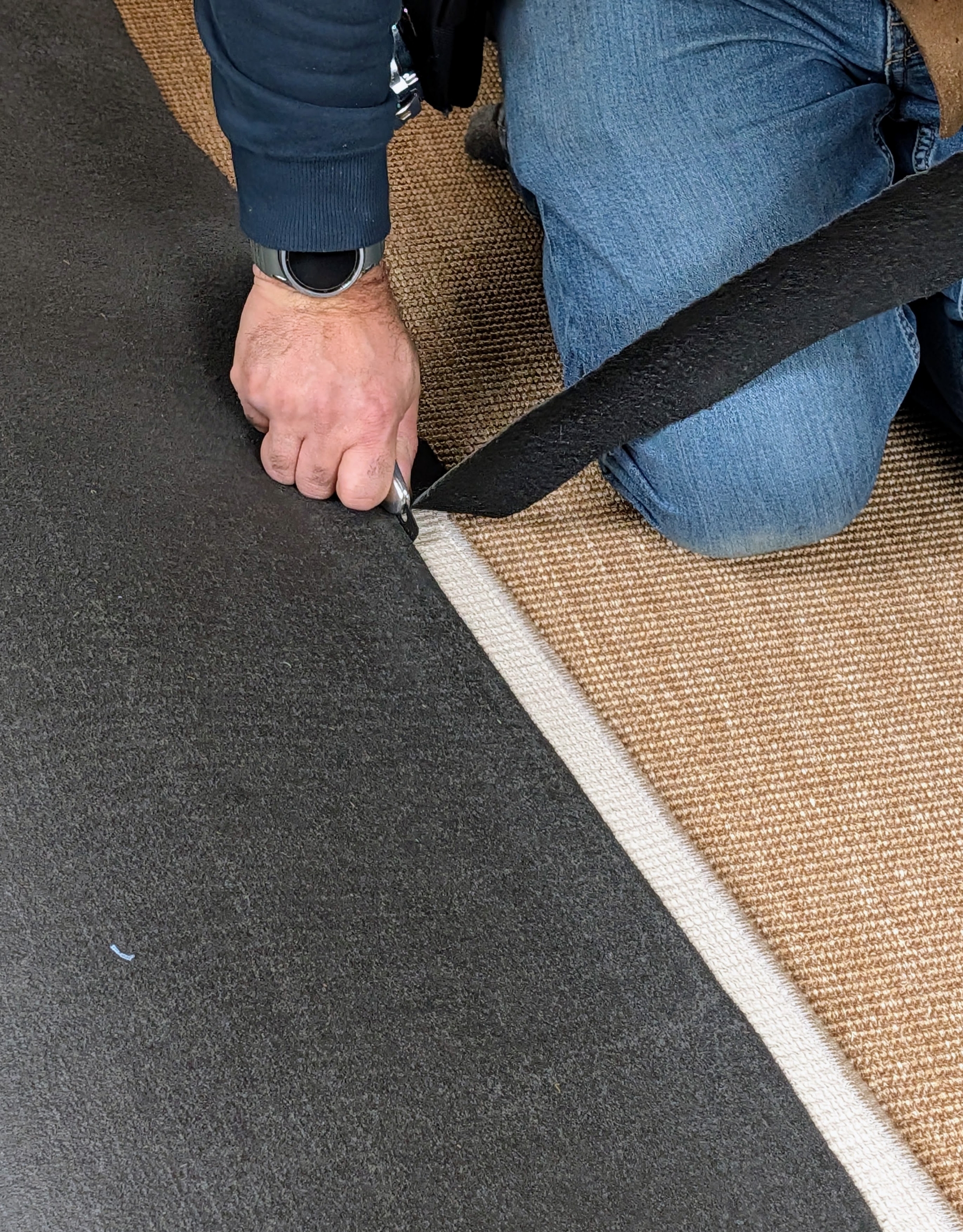 - Then the carpet is slowly rolled over the padding and the floor. Every effort is made to roll it out as straight as possible, so adjustments are minimal.