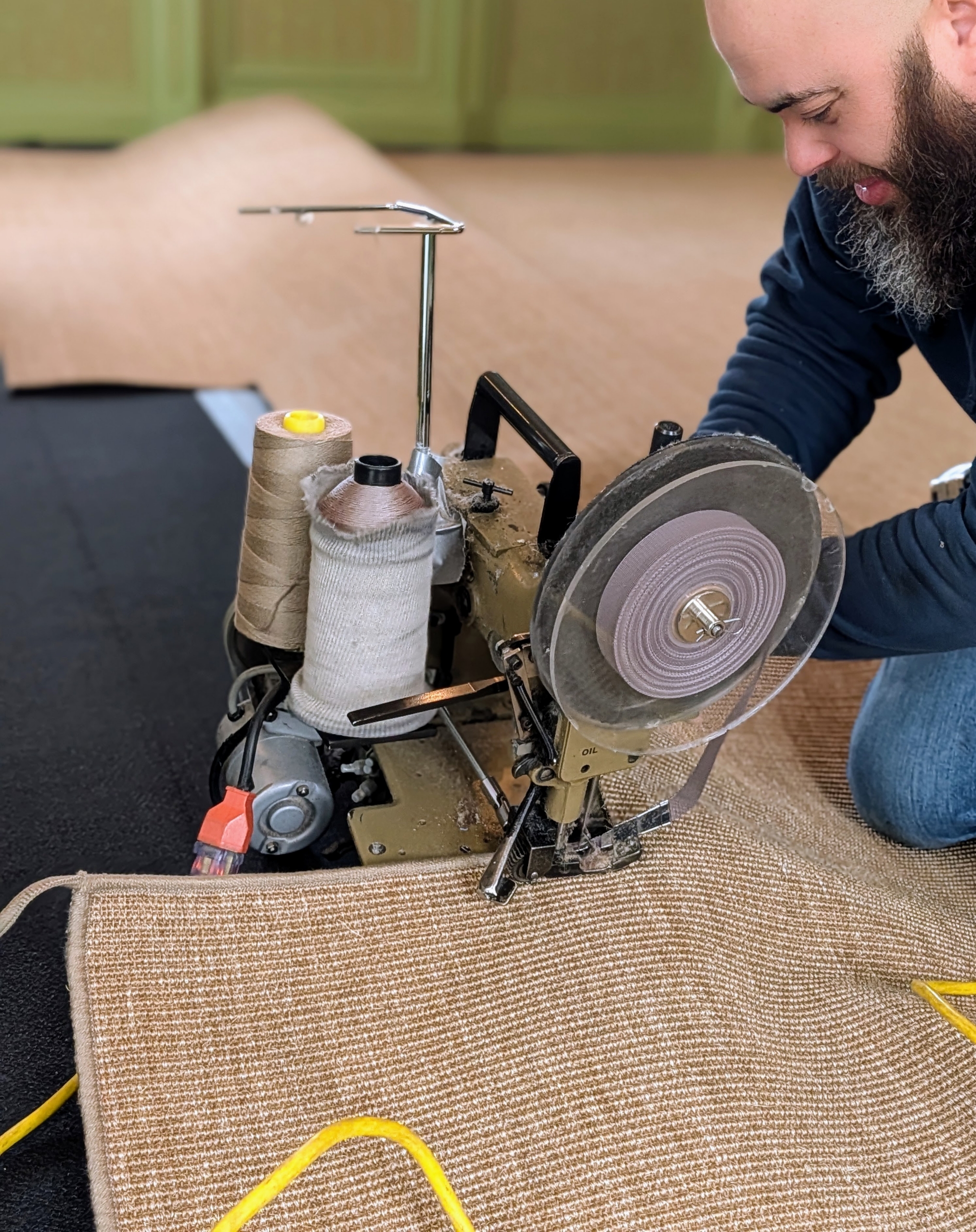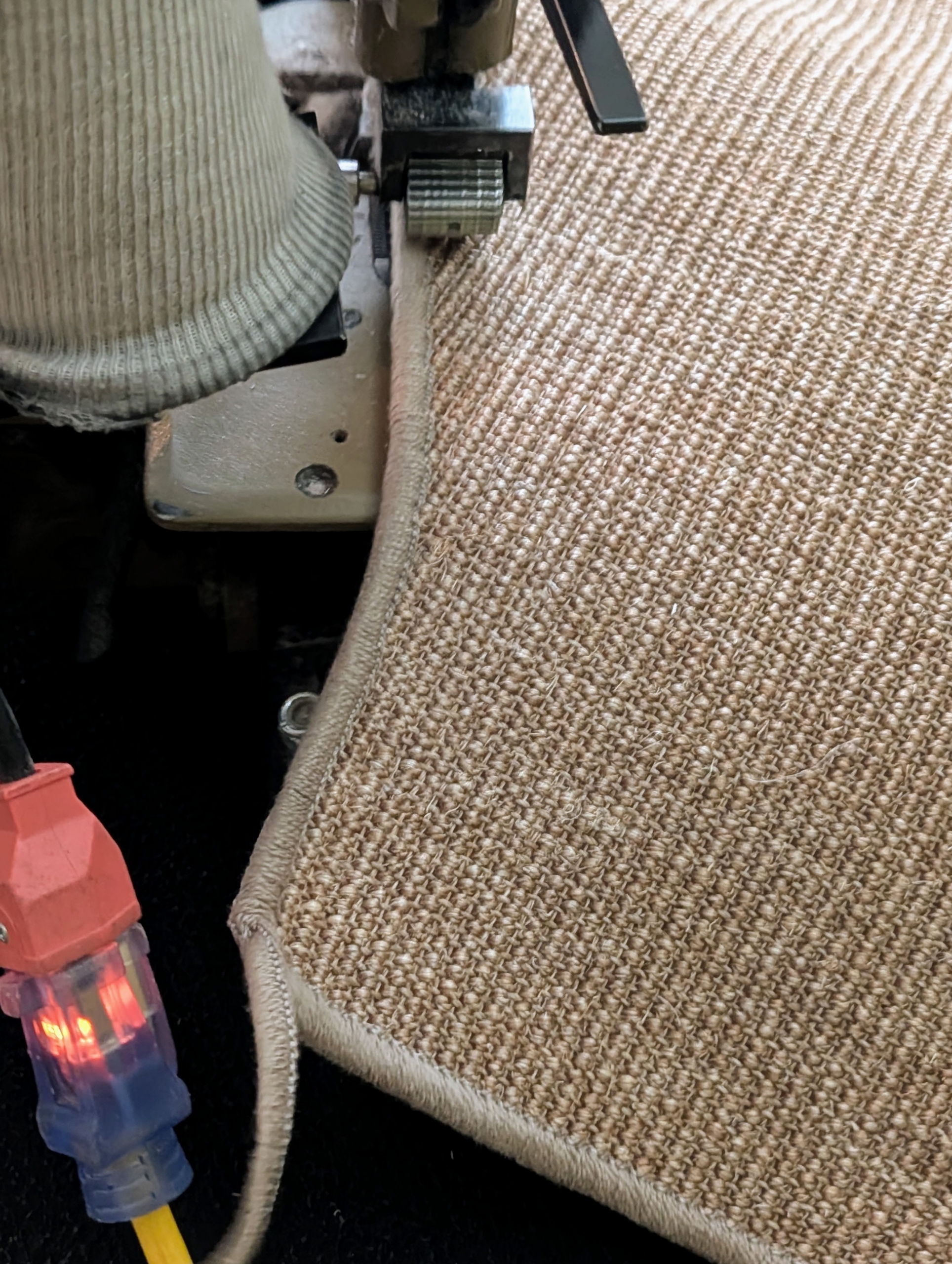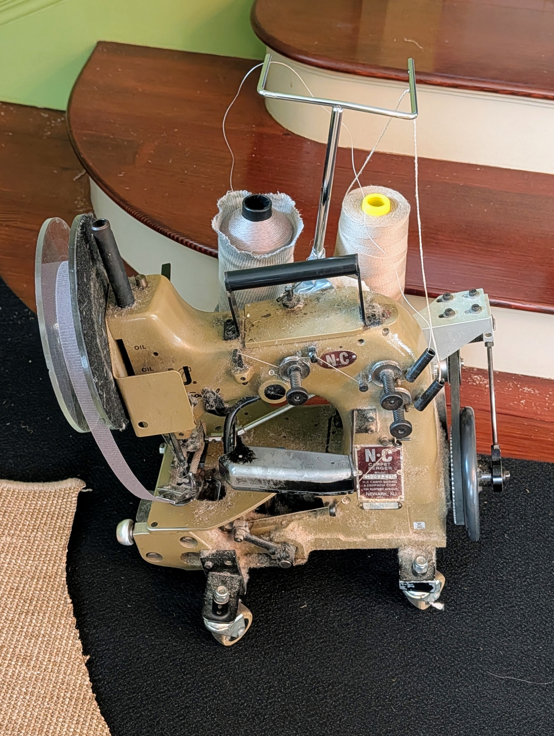 - This is a carpet edge serger machine, or carpet-binding machine. It is used to quickly and easily sew a border around the perimeter of a carpet.