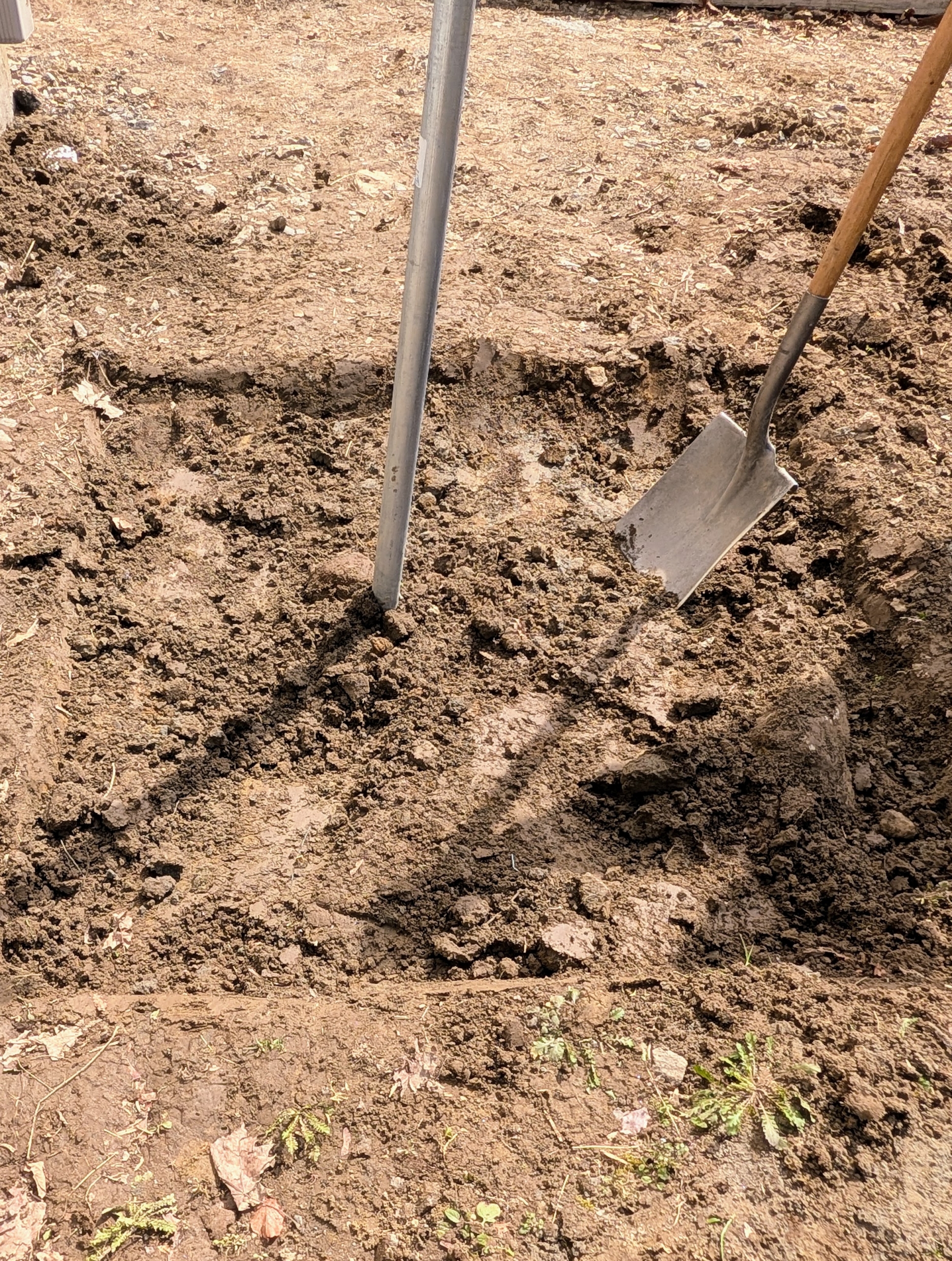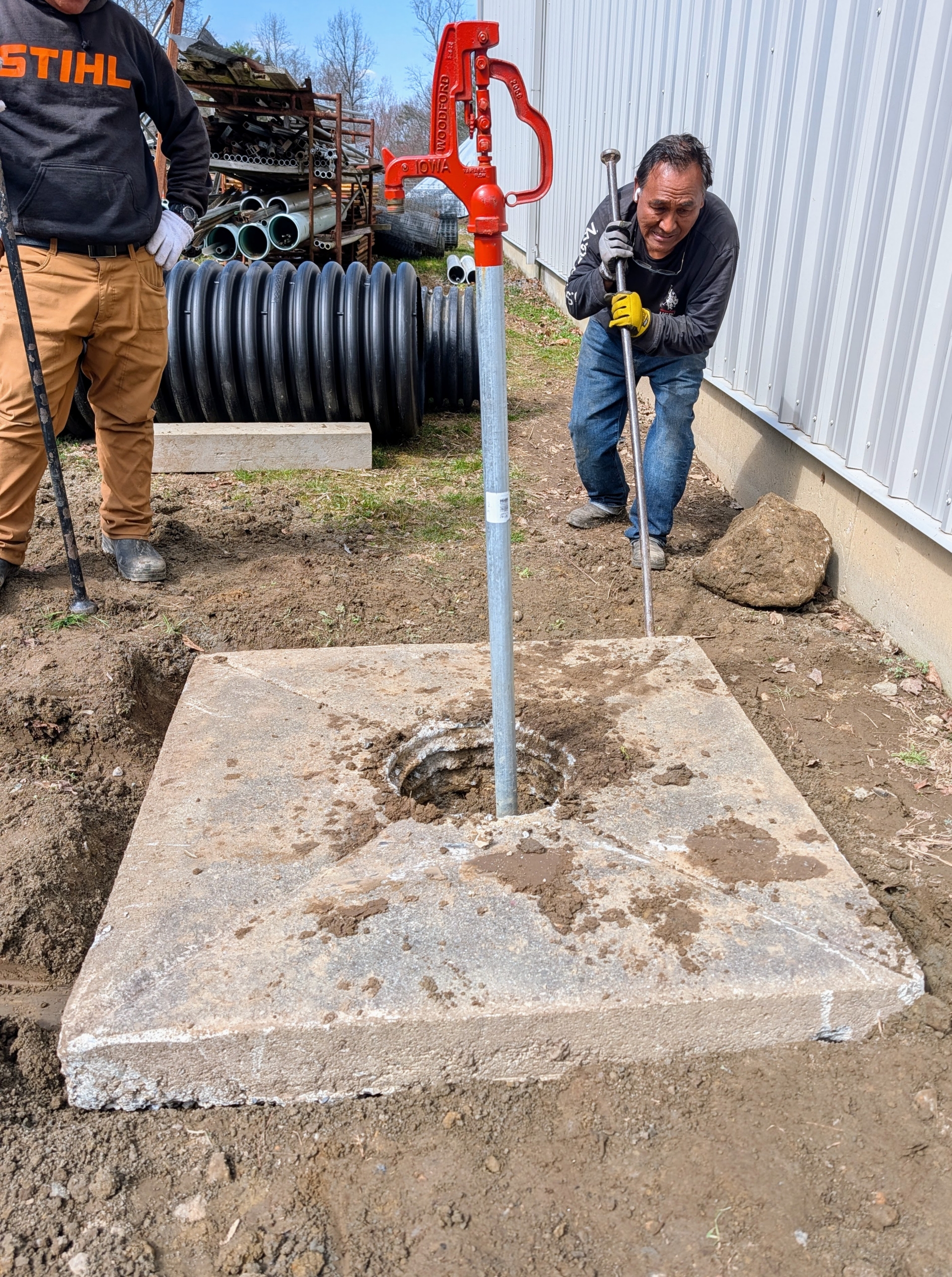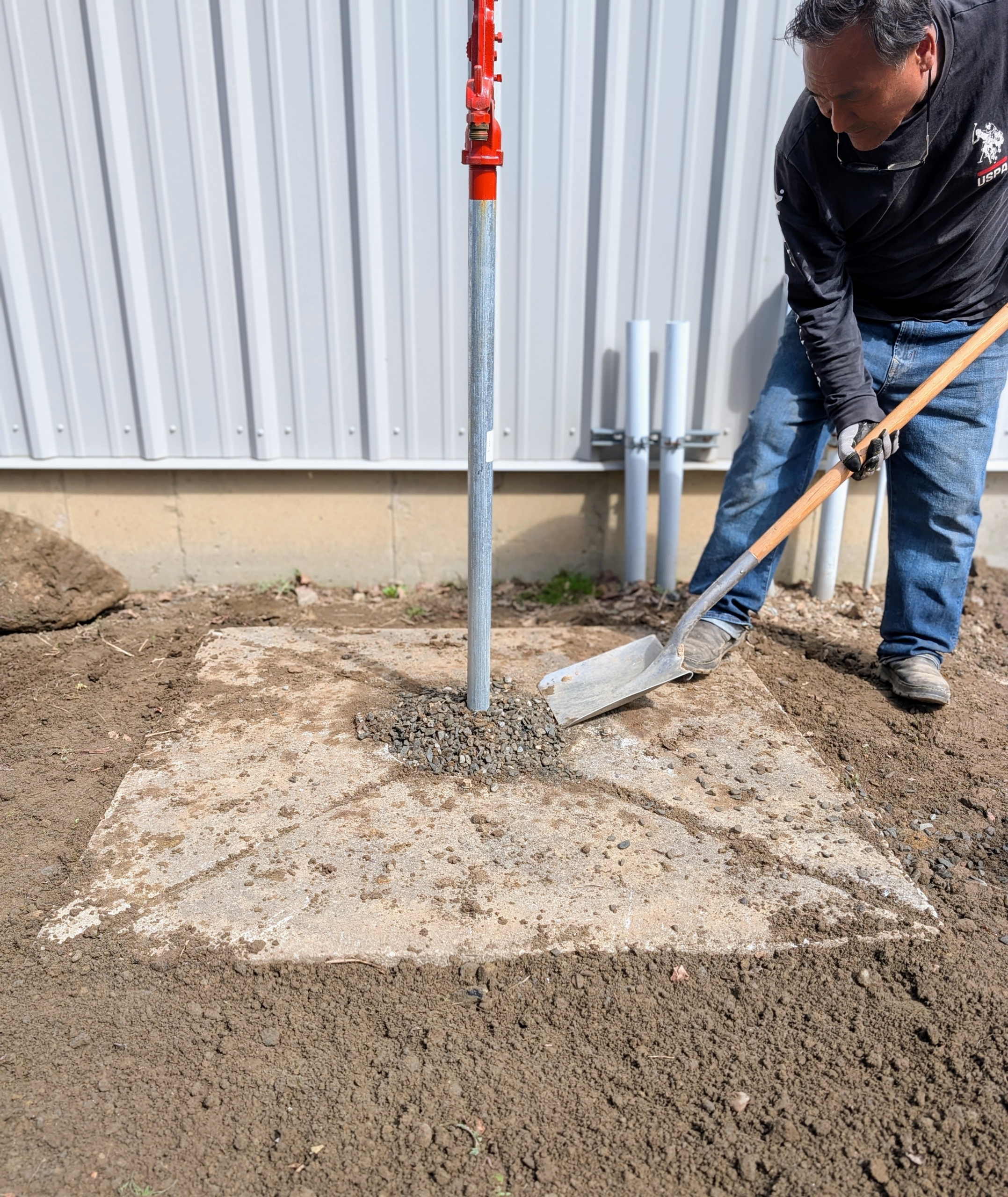 - Pete thought it would work well as a base for this existing free standing hose bib. Here’s Phurba digging a level space to fit the concrete square.