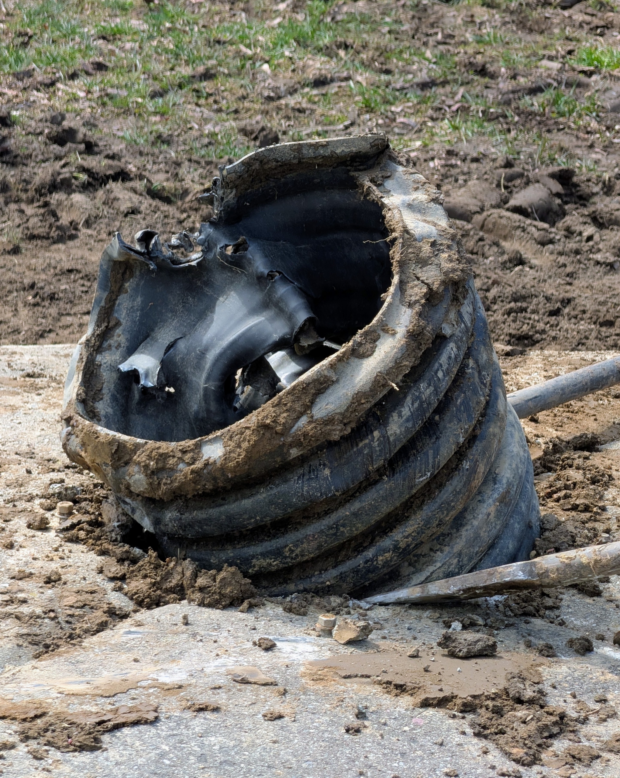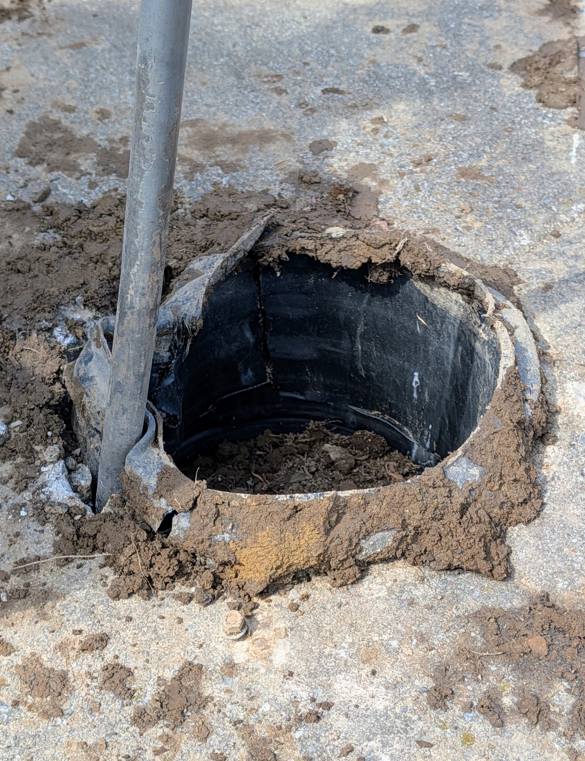 - Meanwhile, using a steel digging bar Pete removes the underground drainage pipe from center of the piece.