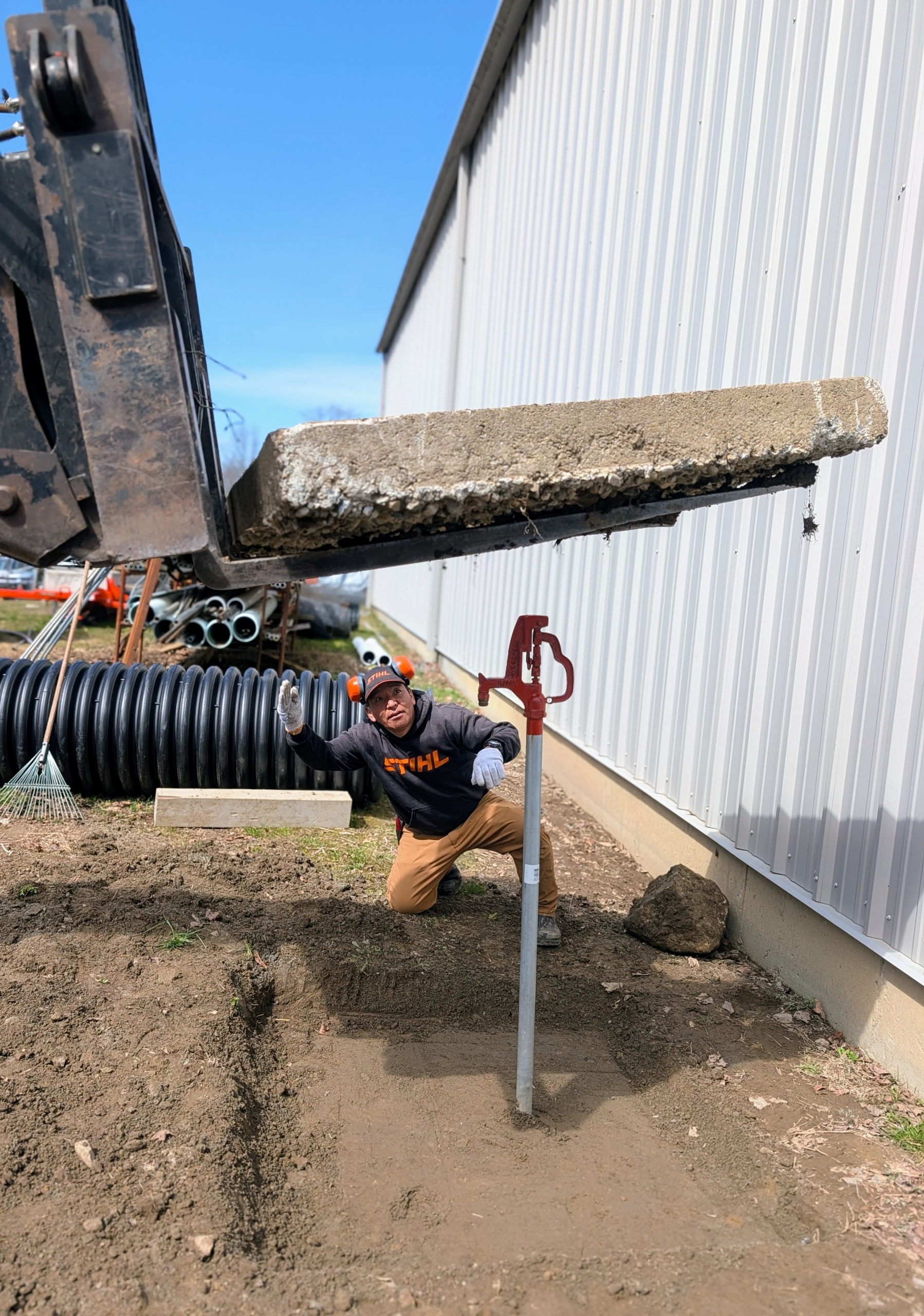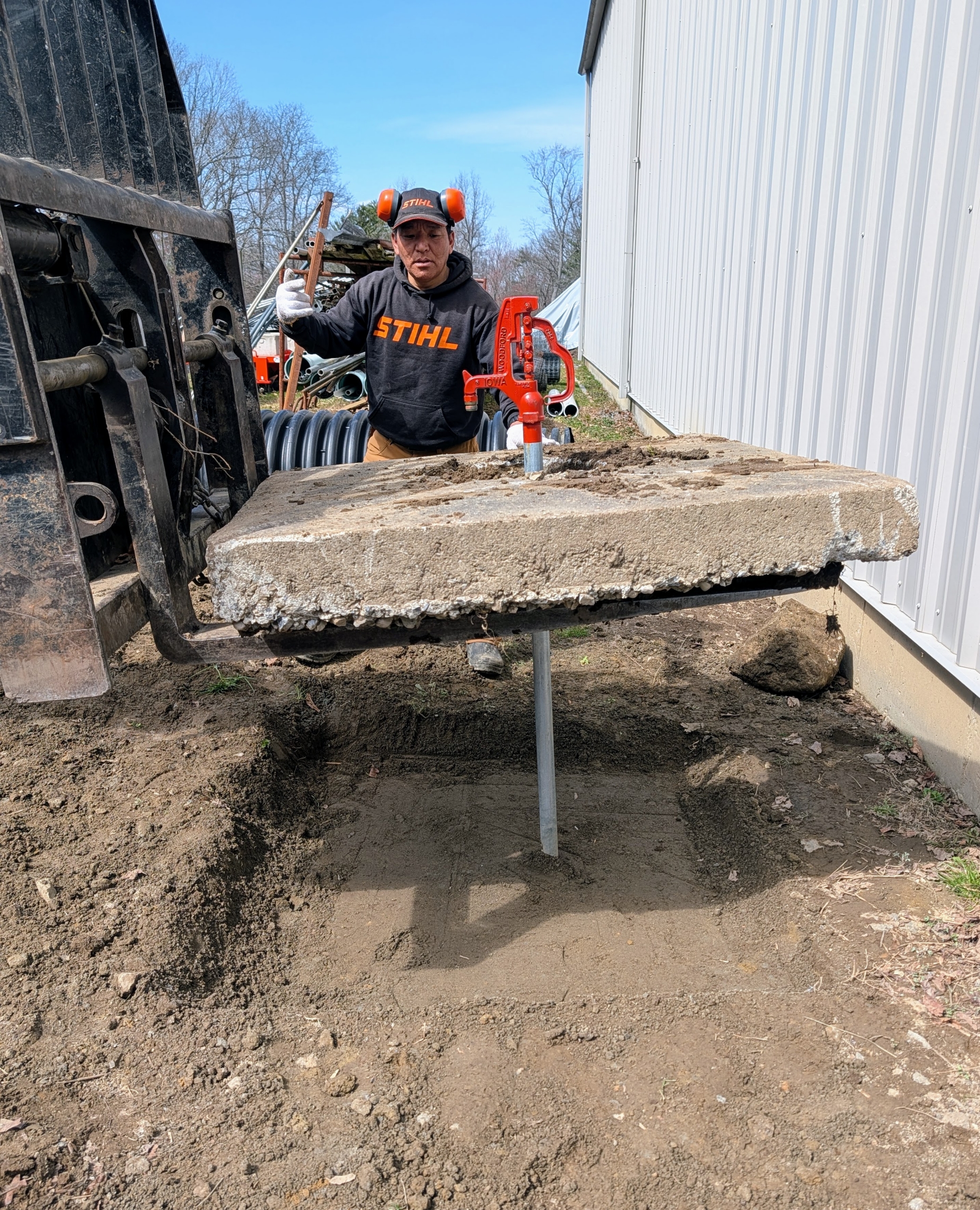- Next, Pete uses the fork of the Hi-Lo to transport the concrete to the faucet.