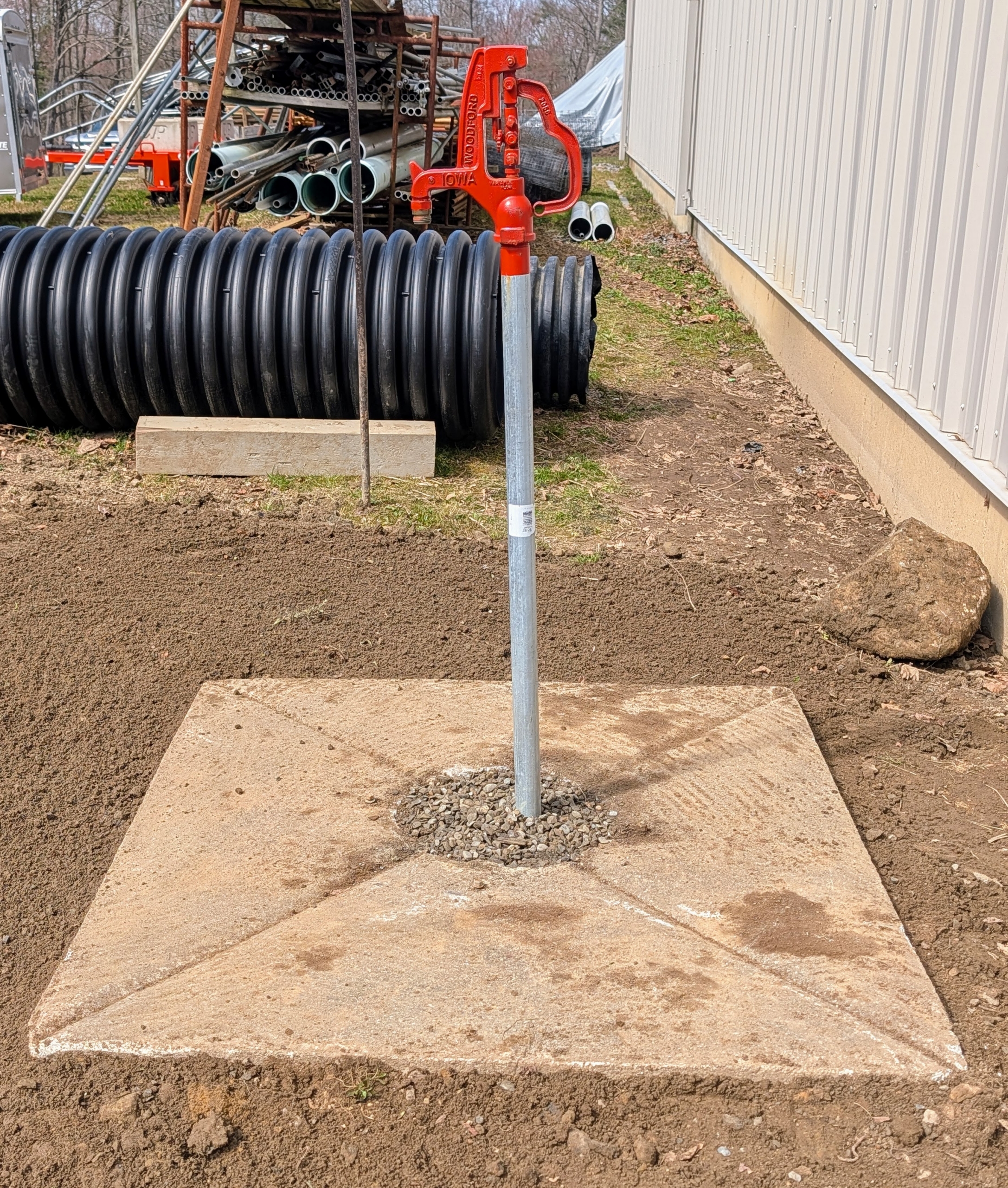 Now that the weather is warmer, I asked Pete Sherpa from my outdoor grounds crew to clean and organize an area in the back of one of my fields where I store various building materials including wooden stakes and boards, metal framing for our protective burlap structures, spare wire fencing, etc. Soon after starting the project Pete found an old concrete slab once used as a base for an automatic horse waterer and thought it would make a good foundation for the outdoor faucet in this space.