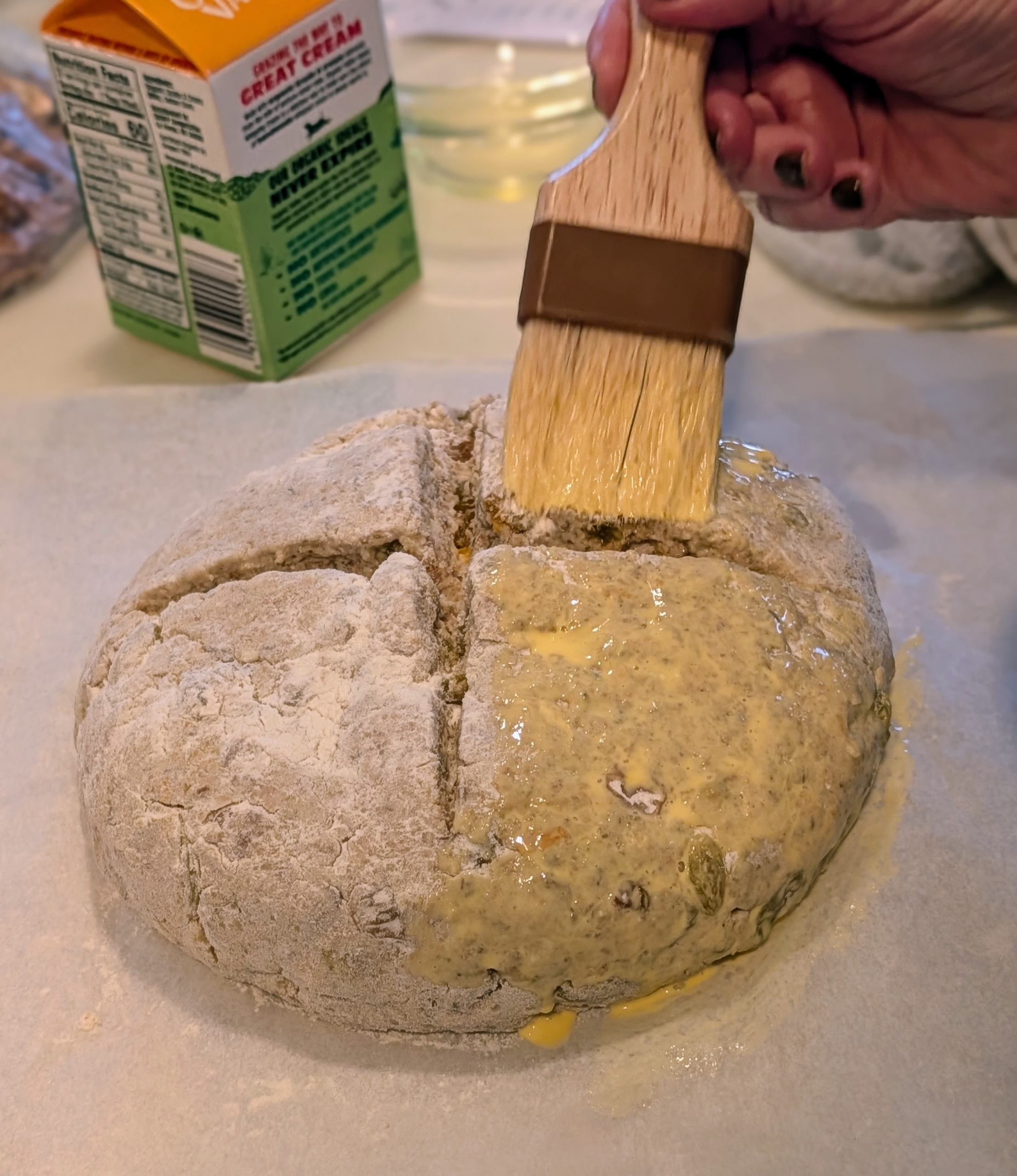 - Here I am buttering the top of this loaf before it goes into the oven. I used a serrated knife to make the “x” about an inch deep into the top of each loaf. Legend has it that, in some areas of Ireland, a cross was cut on the top of the Irish soda bread with a knife to ward off the devil and protect the household.