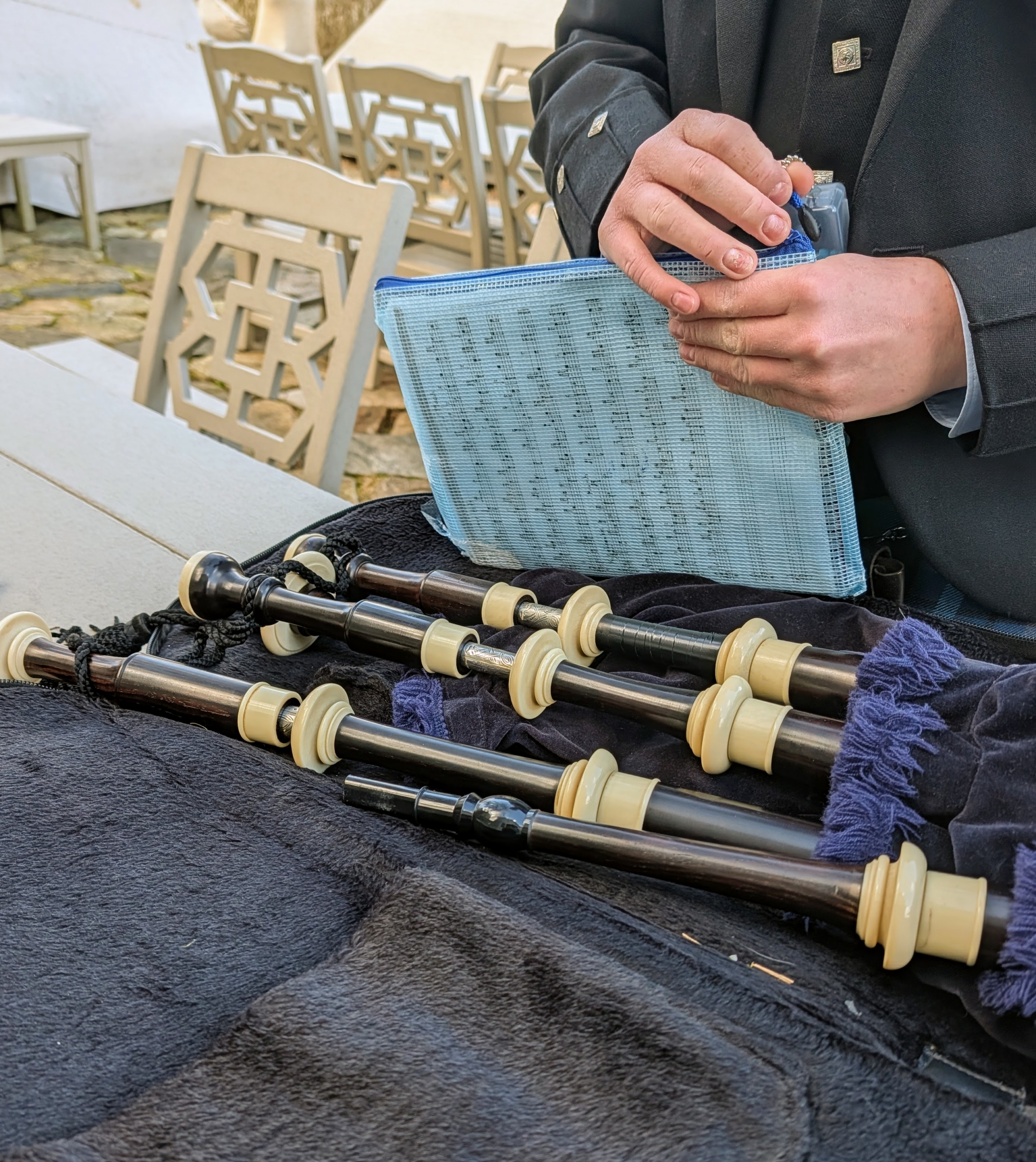 - Here’s Will setting up his bagpipes. Traditionally, bagpipes were made from the skin of animals. The hide would be turned inside out to create the bag, while the pipes were made from hollow reeds or wood. Today, many bagpipes are constructed using synthetic materials.