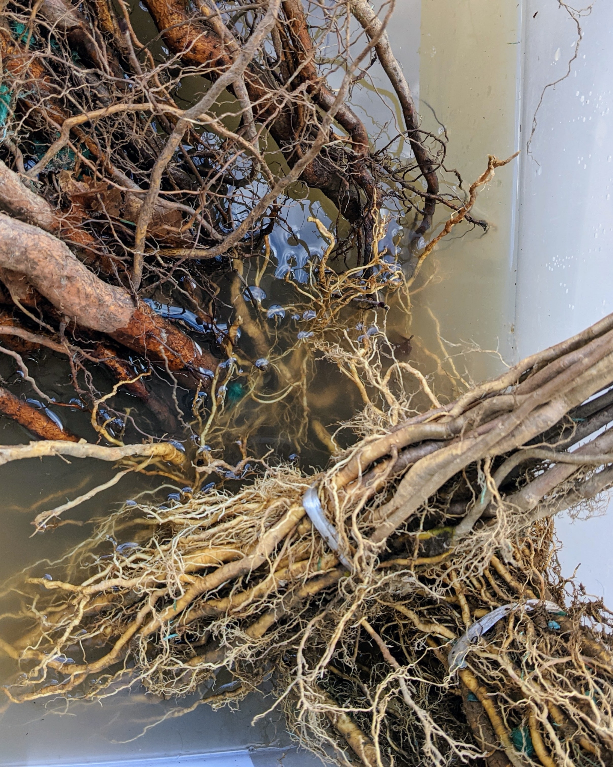 - Once the bare-roots are removed from the box, they are placed in water filled bins until they are potted.