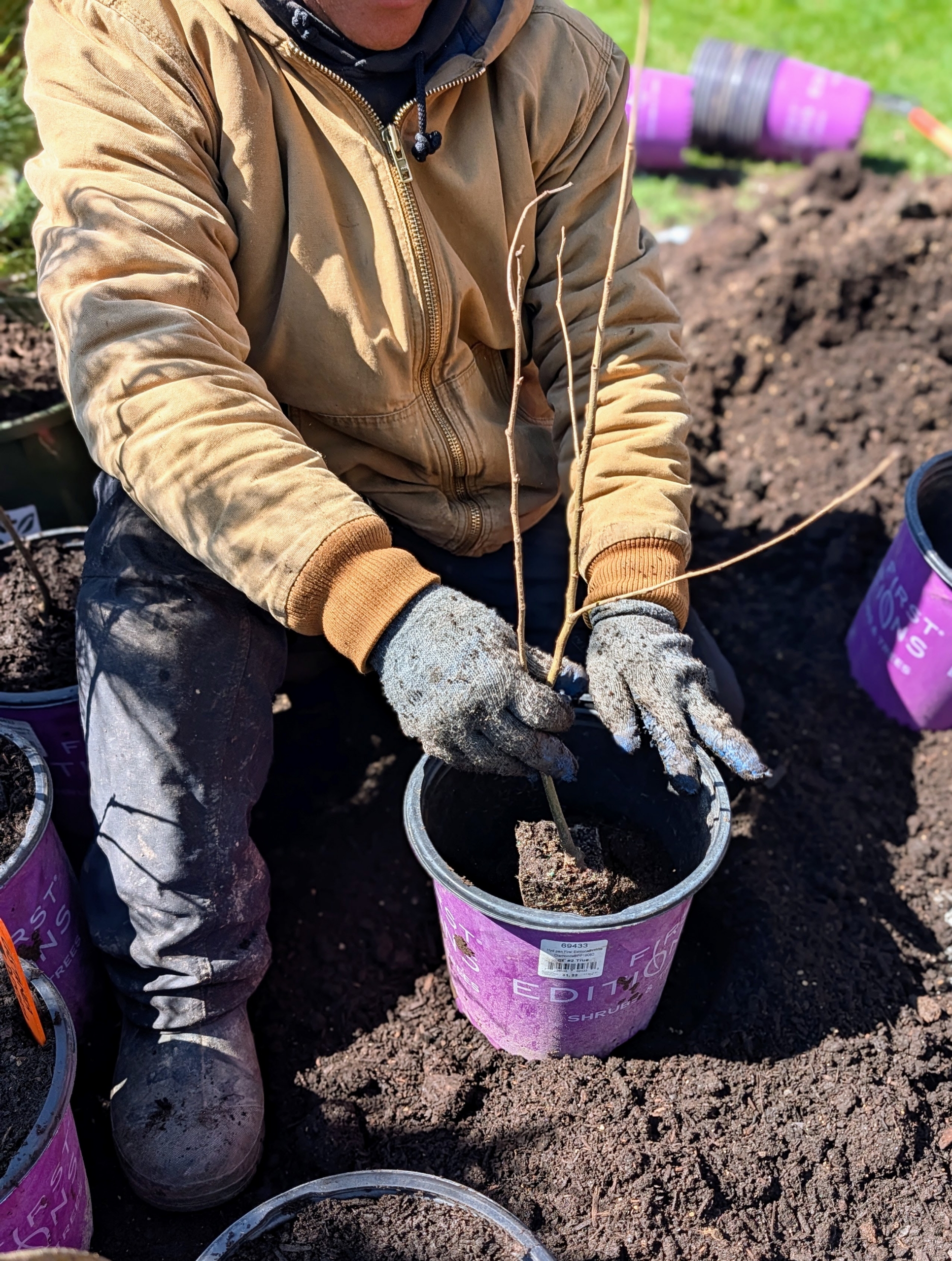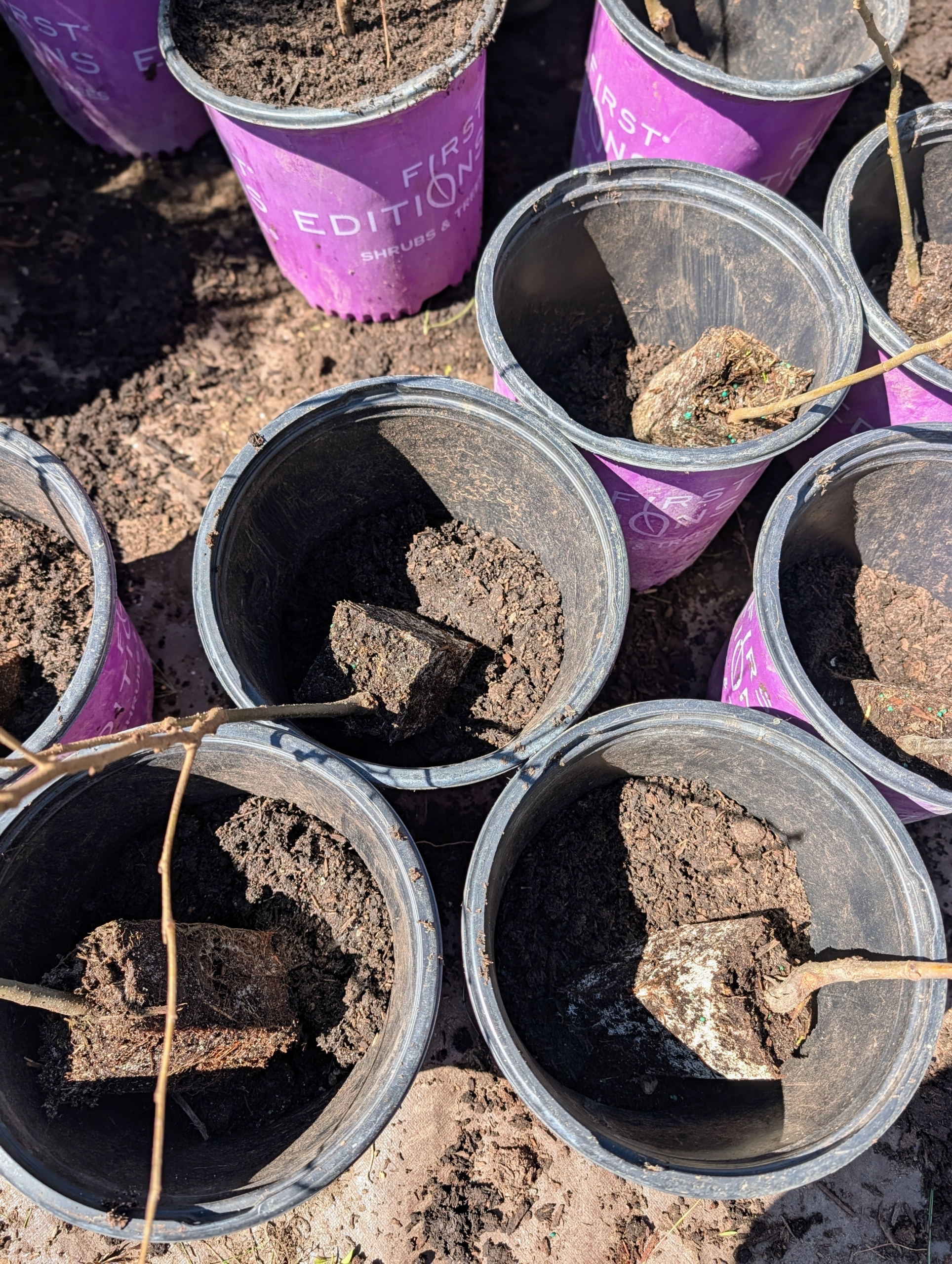 Whenever I get bare-root tree cuttings and seedlings I prefer to plant them in appropriately sized containers first, so they can be watered and carefully monitored until they are planted in the gardens.