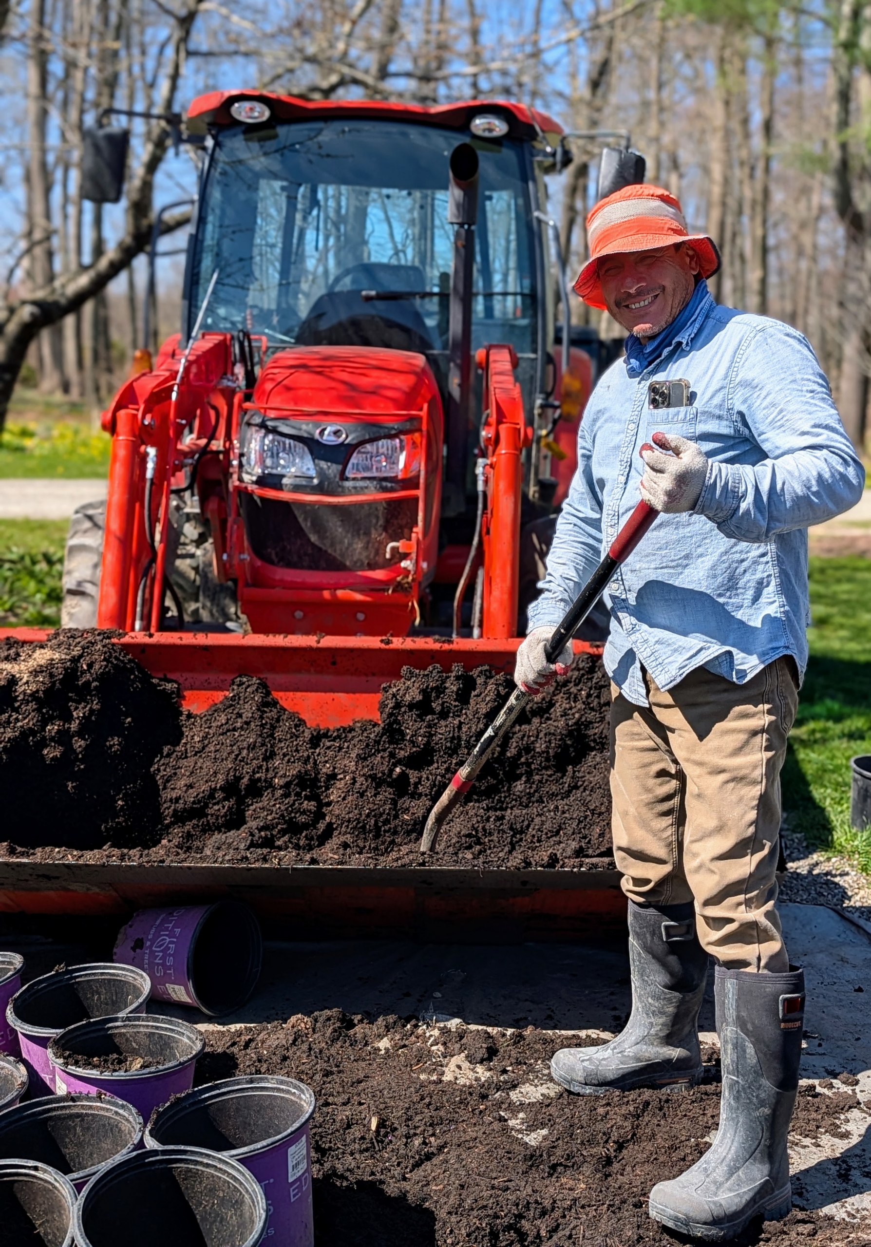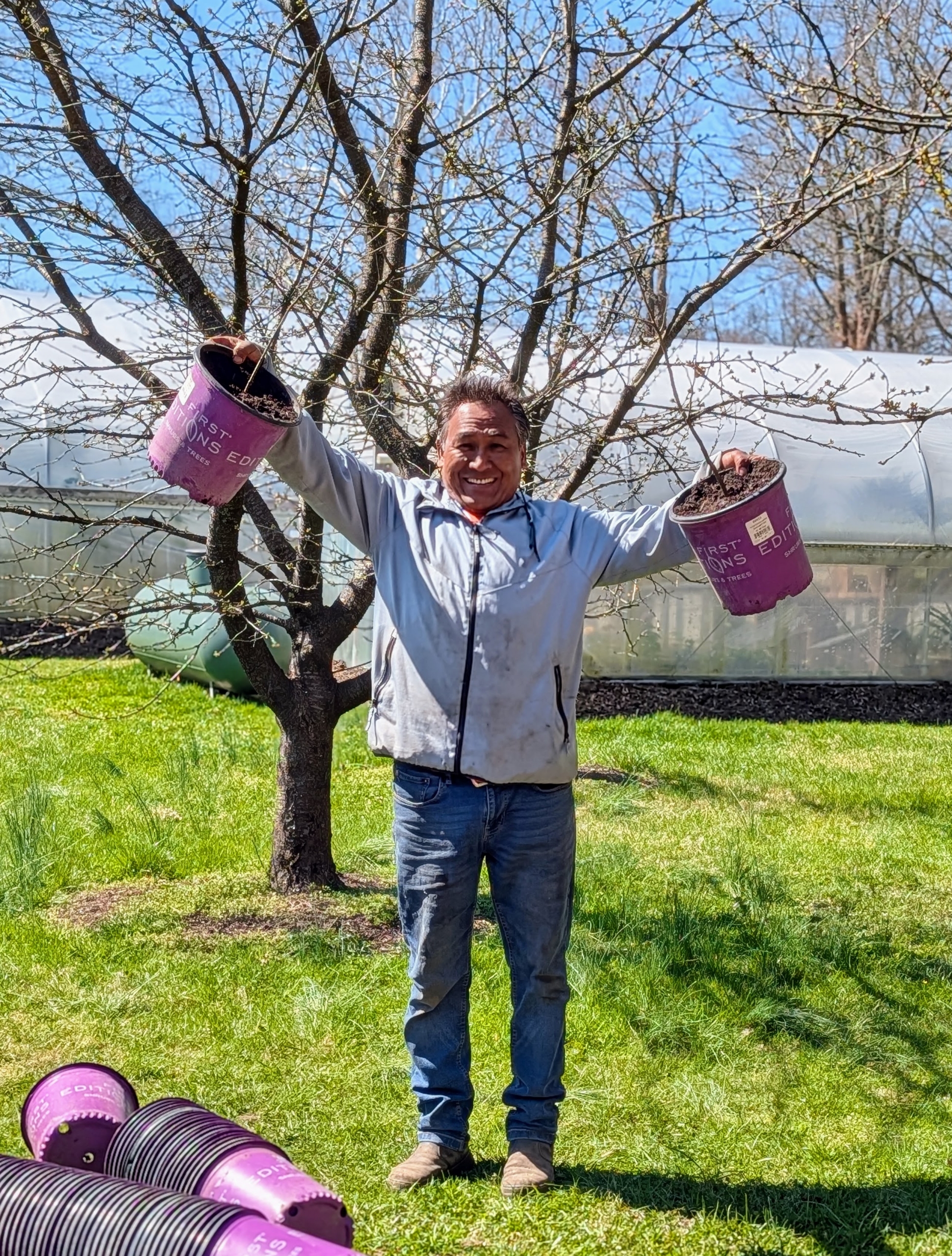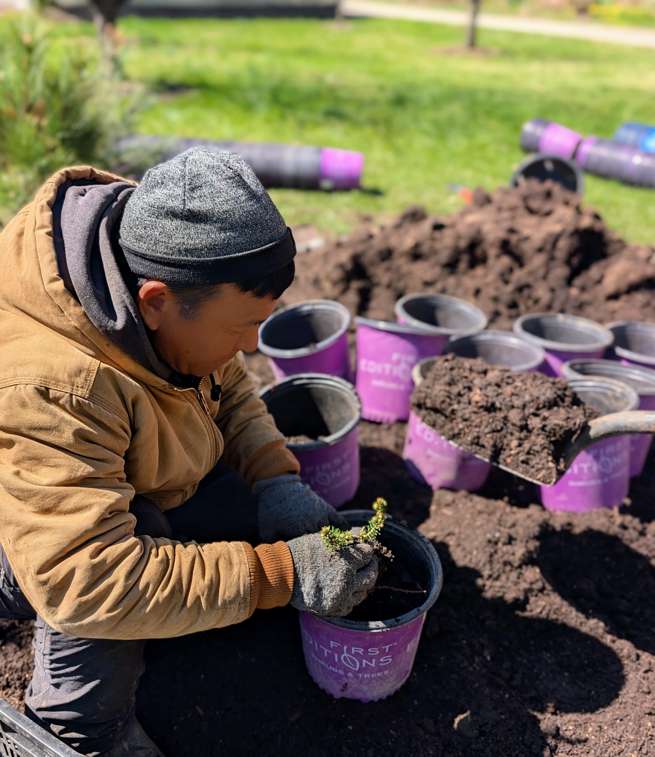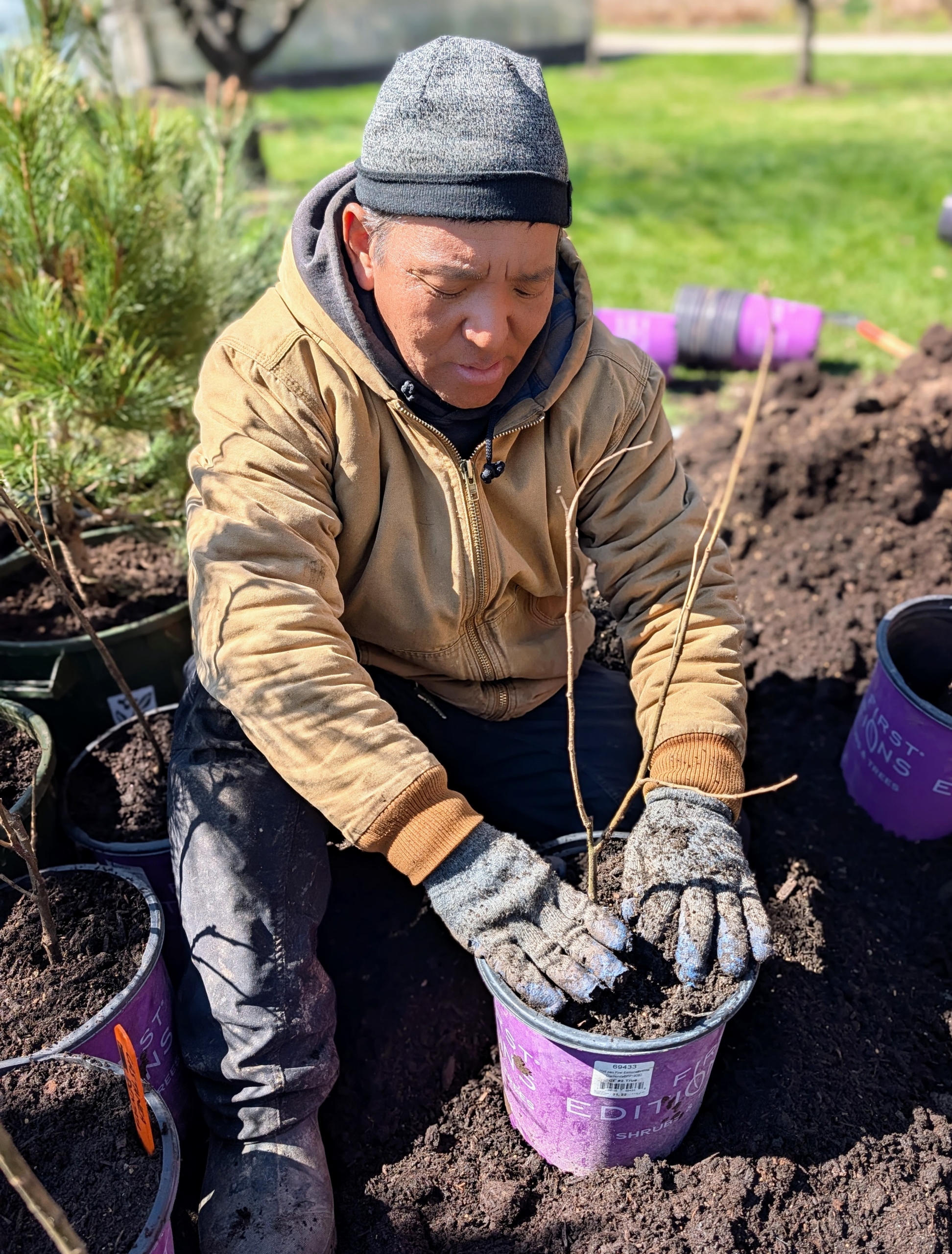 - In order to get all the seedlings potted as quickly as possible, it’s “all hands on deck.” The crew creates a very productive assembly line. While some plant, others load. Here’s Matthew loading potted trees onto the wheelbarrow.