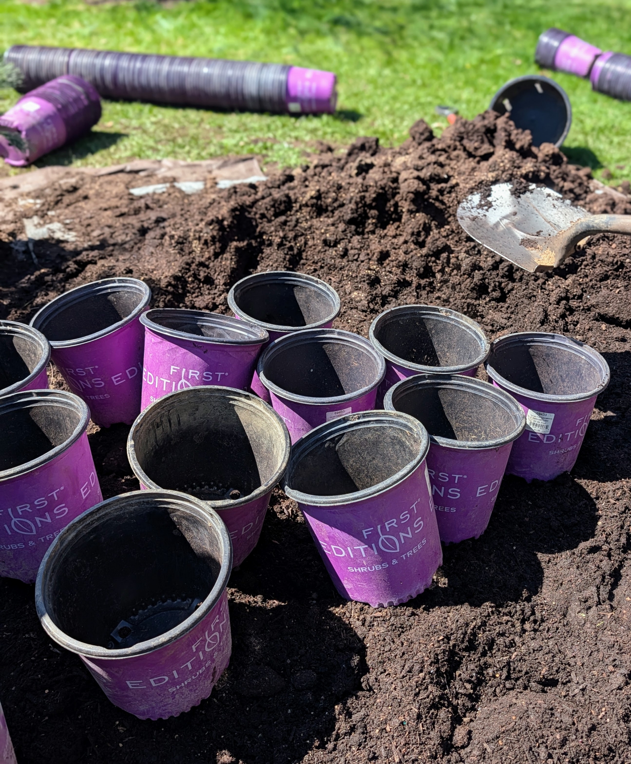 - I save pots whenever I can – they always come in handy for projects like this, and I always encourage the crew to reuse supplies whenever possible. Each pot is prepared with a small layer of soil ready for the tree and backfill.