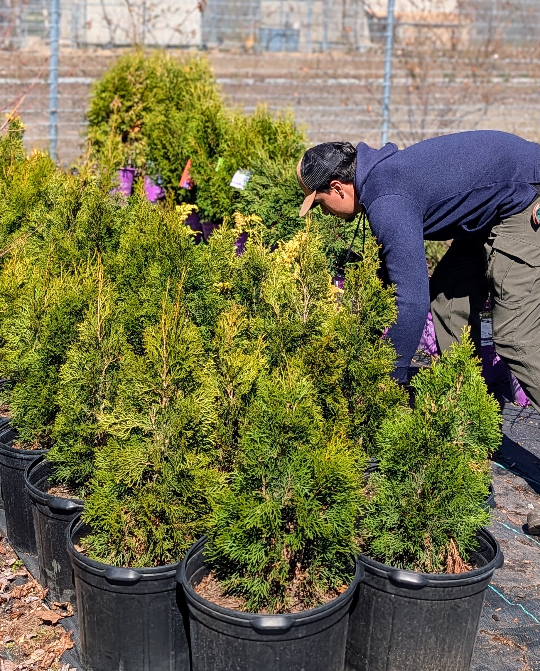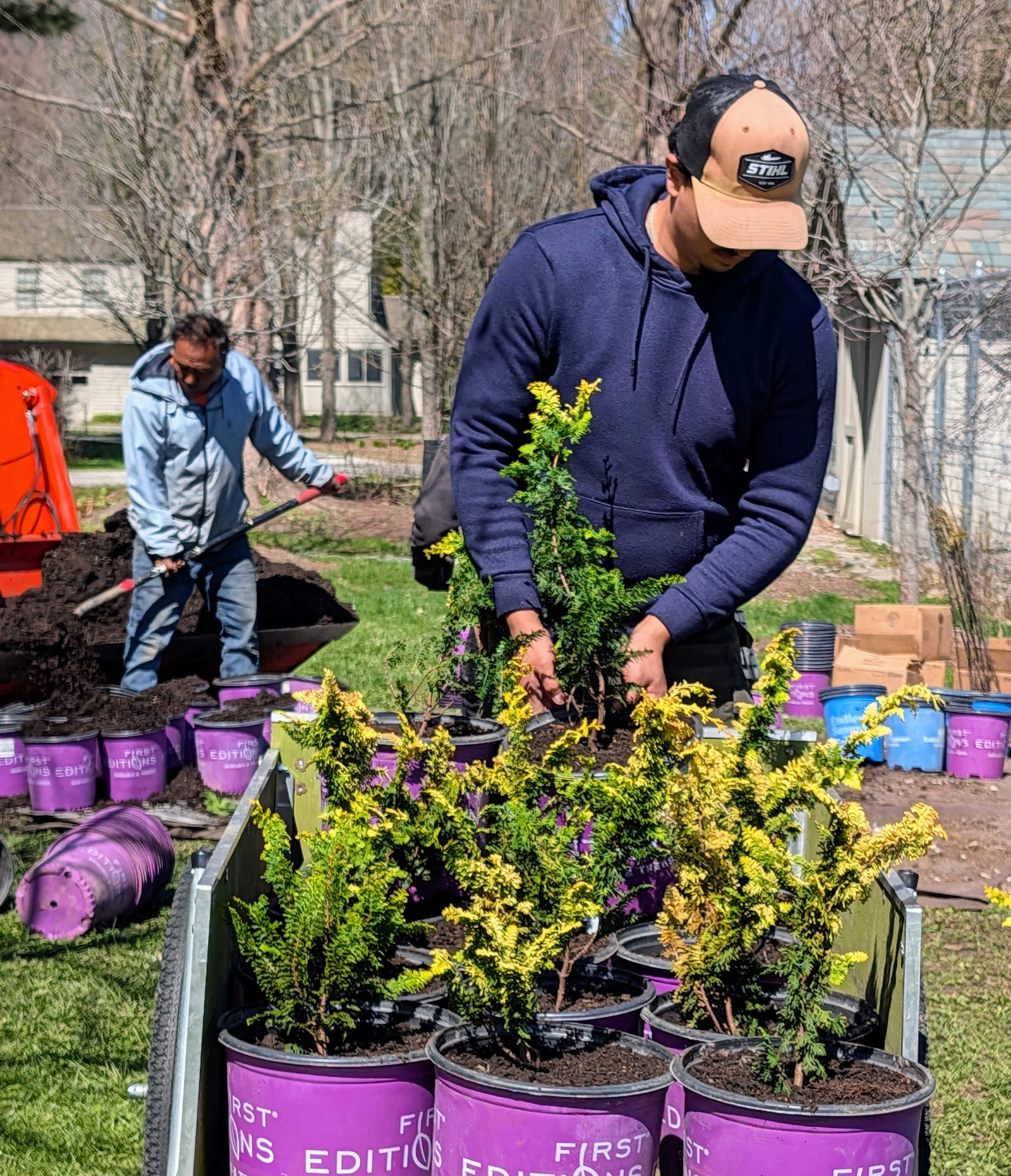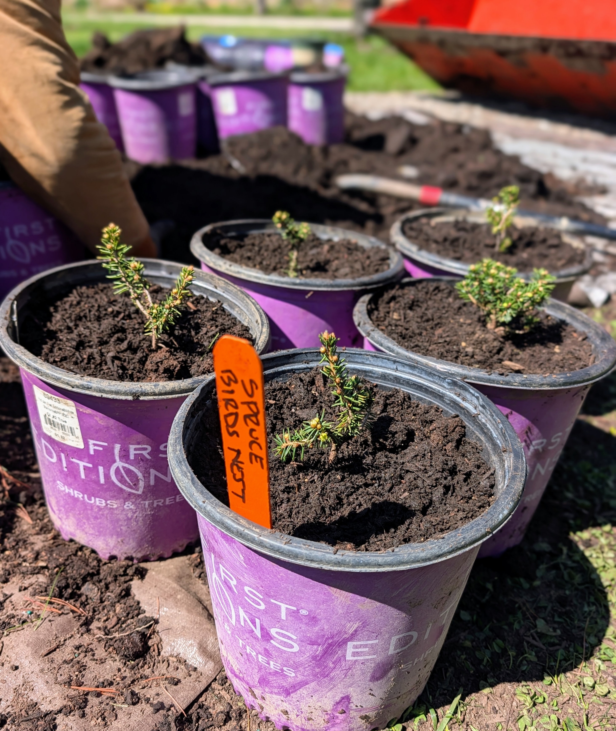 This week, my outdoor grounds crew worked very hard to pot hundreds of young trees, including pine trees, spruce trees, and cedar trees, American chestnuts, willows, buckthorns, and bald cypress. They all came from Musser Forests, Inc., a Pennsylvania-based company specializing in conifers, hardwood seedlings, and transplants.