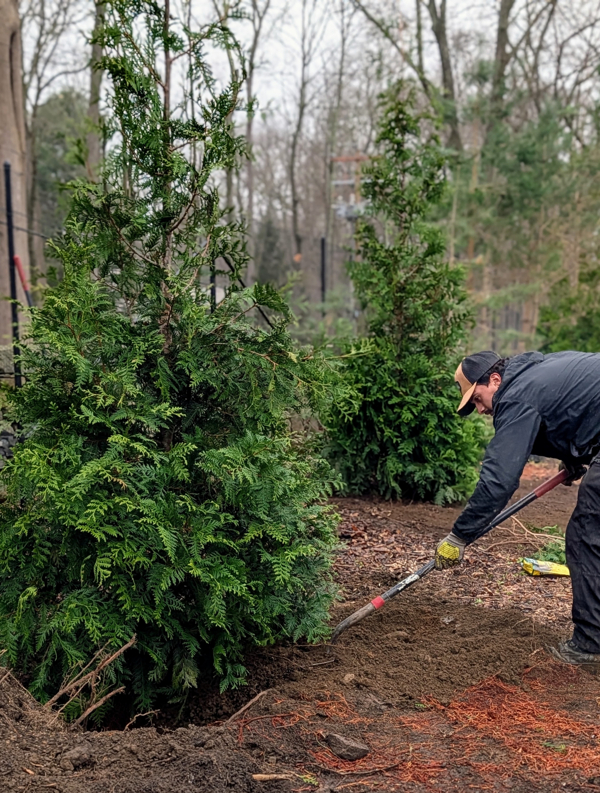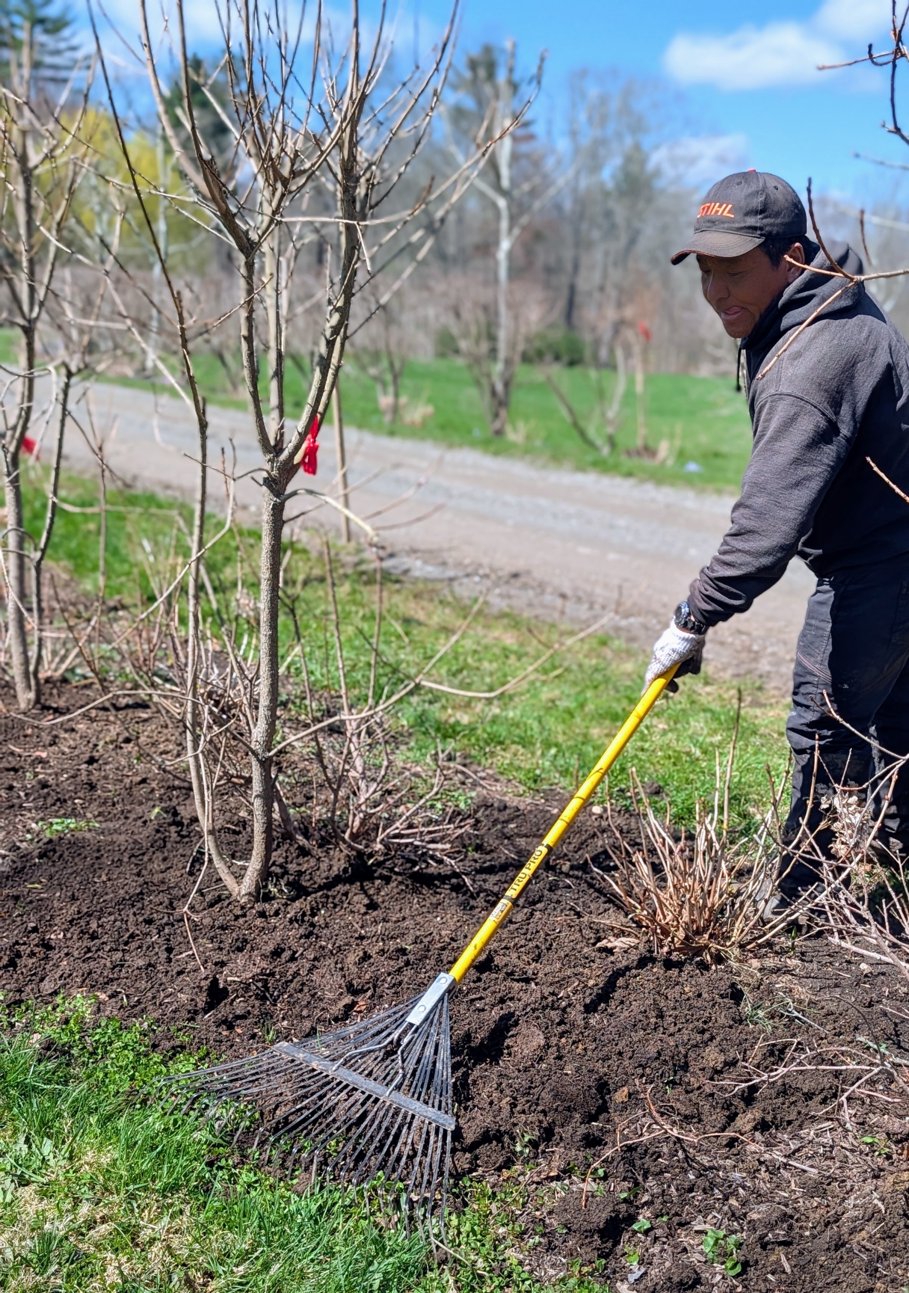 - Phurba rakes the area after the trees are planted, fed, and backfilled.