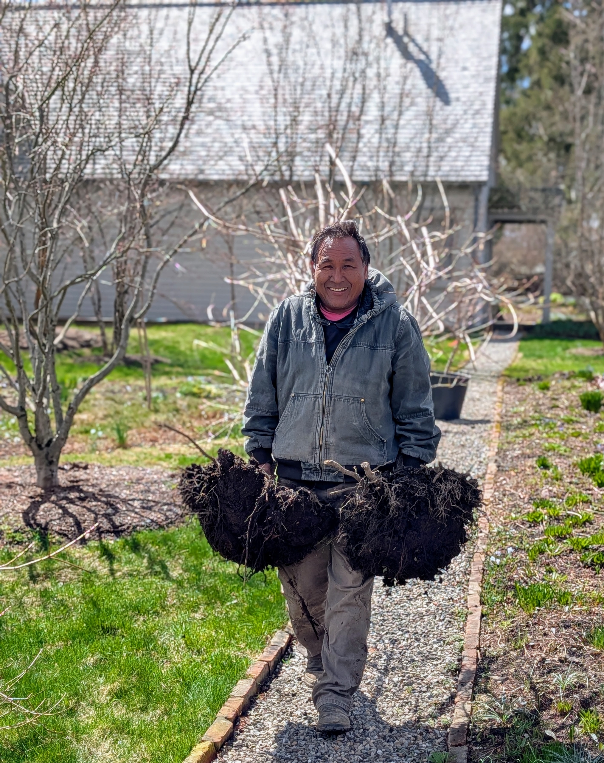 - Here’s Pete moving a group of Cotinus trees that had outgrown their spaces outside my Tenant House. I decided they would do better in the allée of smoke bushes in my middle hayfield.