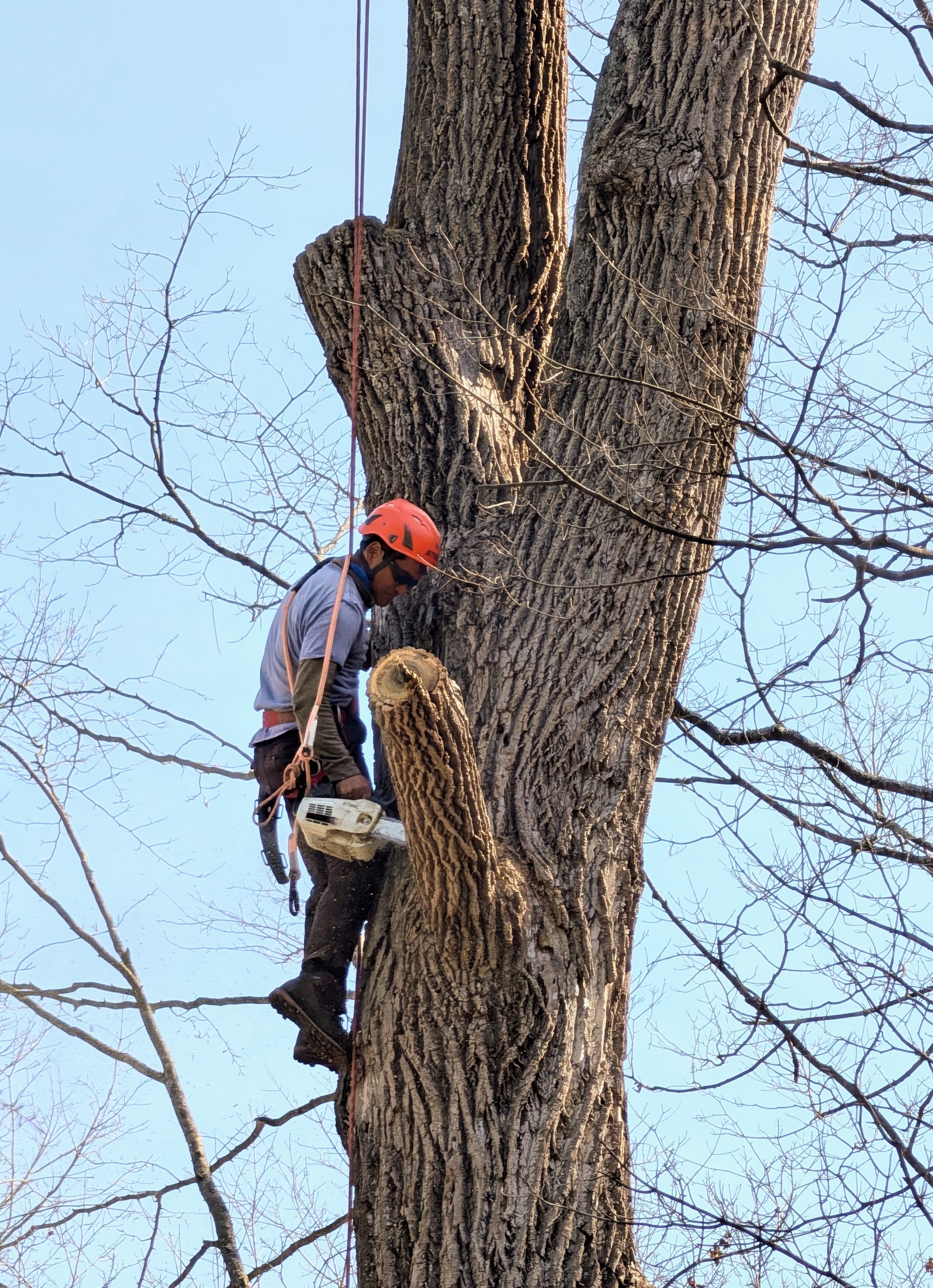- Back in the woodland, Pasang works carefully to cut dead limbs from the trees.