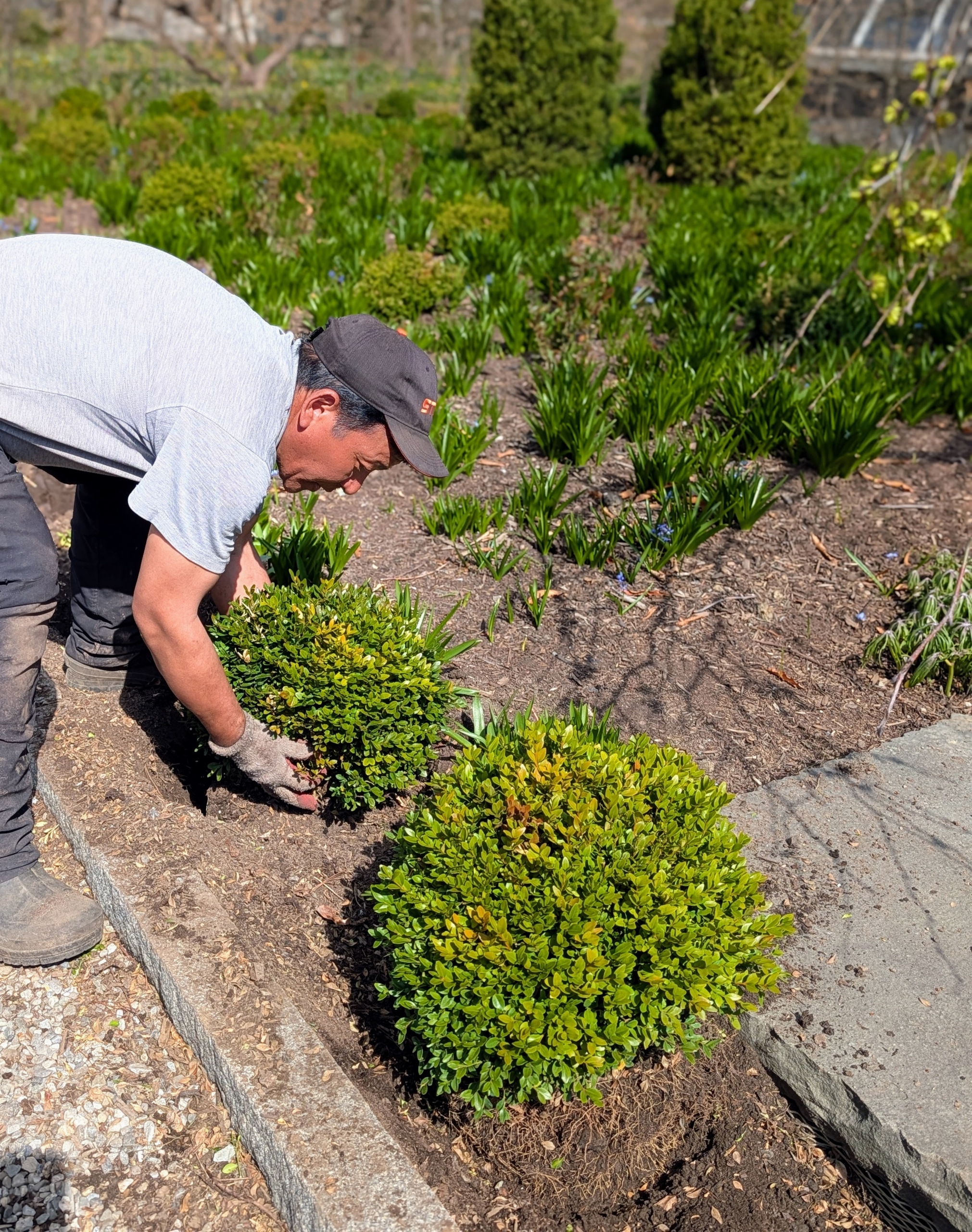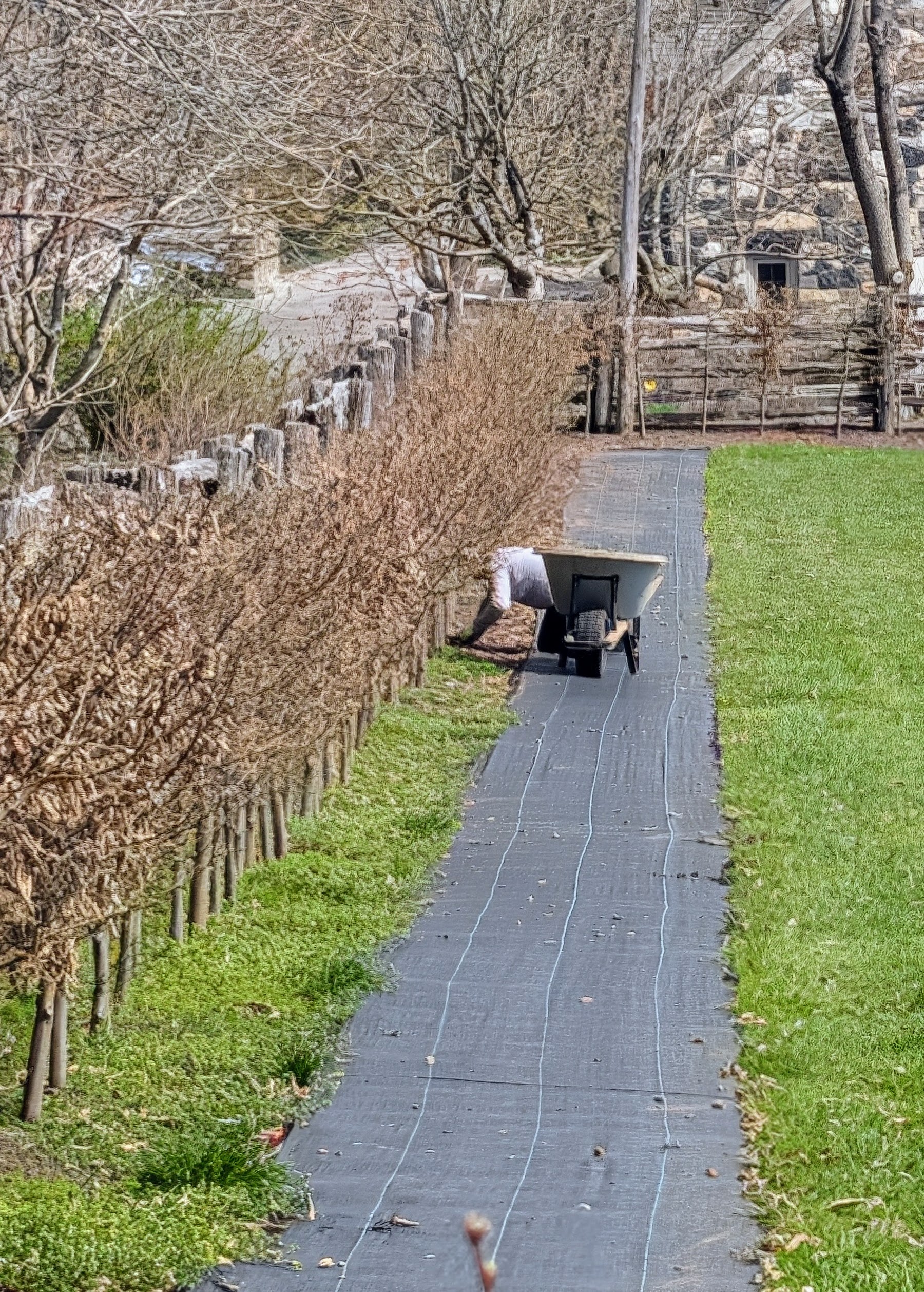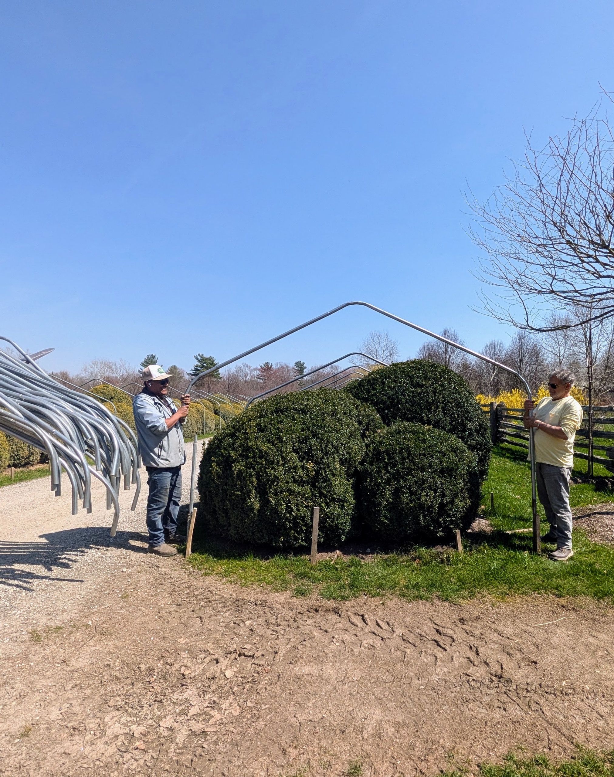 - Another one of our time consuming spring tasks is the removal of all the burlap and metal framing surrounding the boxwood. The burlap fabric was removed a few weeks ago to expose the plantings to the sun, but now the metal framing and wooden supports are dismantled and stored for the season.