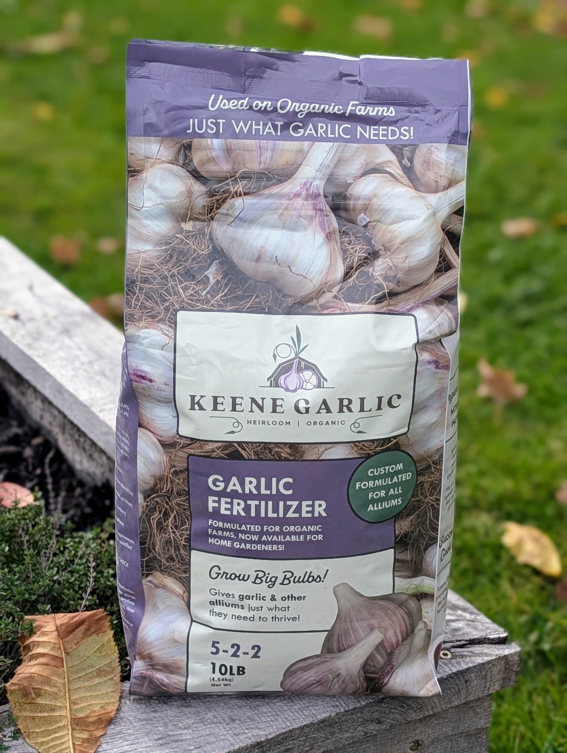 Next, it’s important to feed the bed. Keene Garlic Fertilizer is an organic 5-2-2 formula specially made for garlic and alliums.