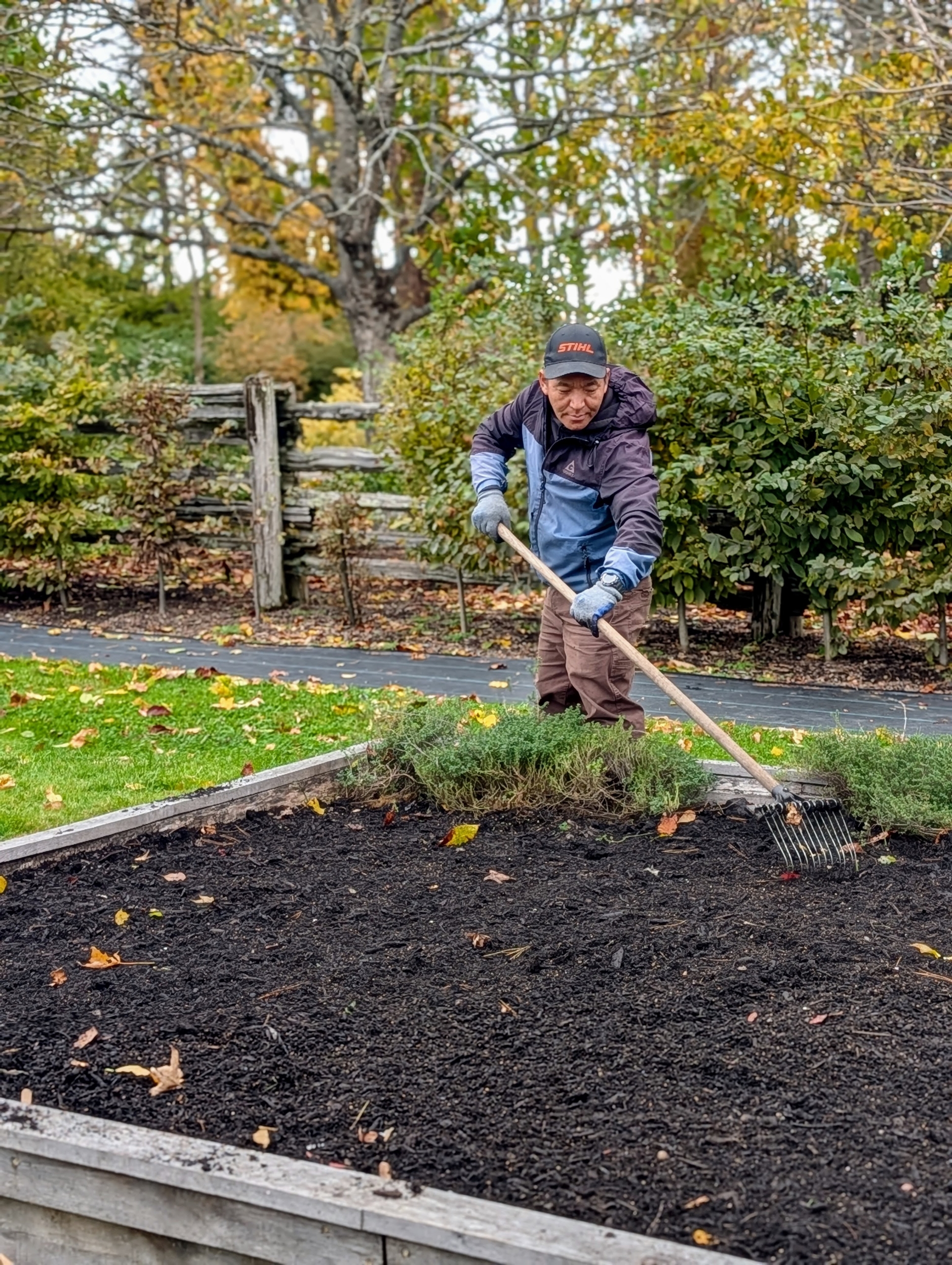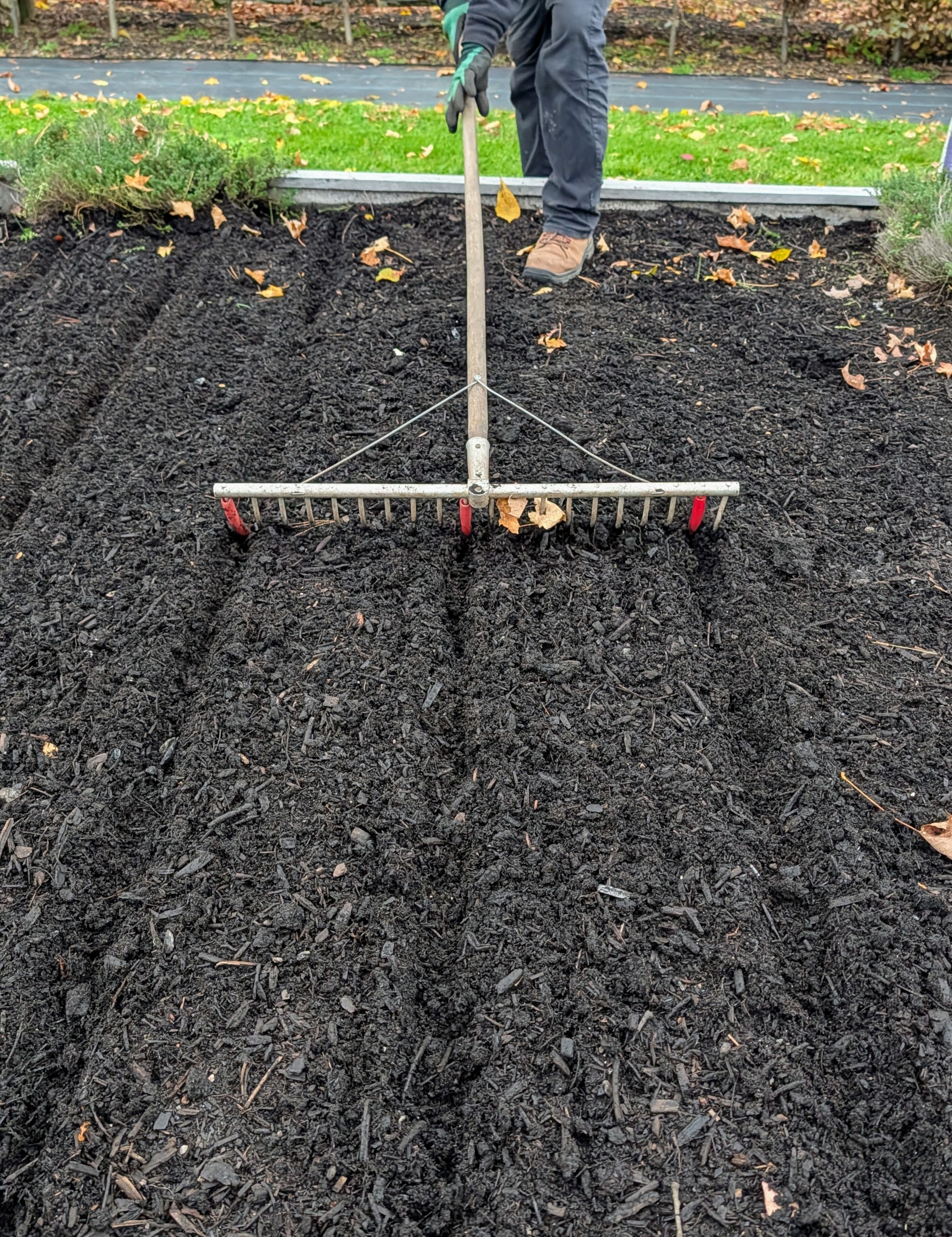 Once the soil is spread across the bed, Matthew rakes it, so it is level and smooth.