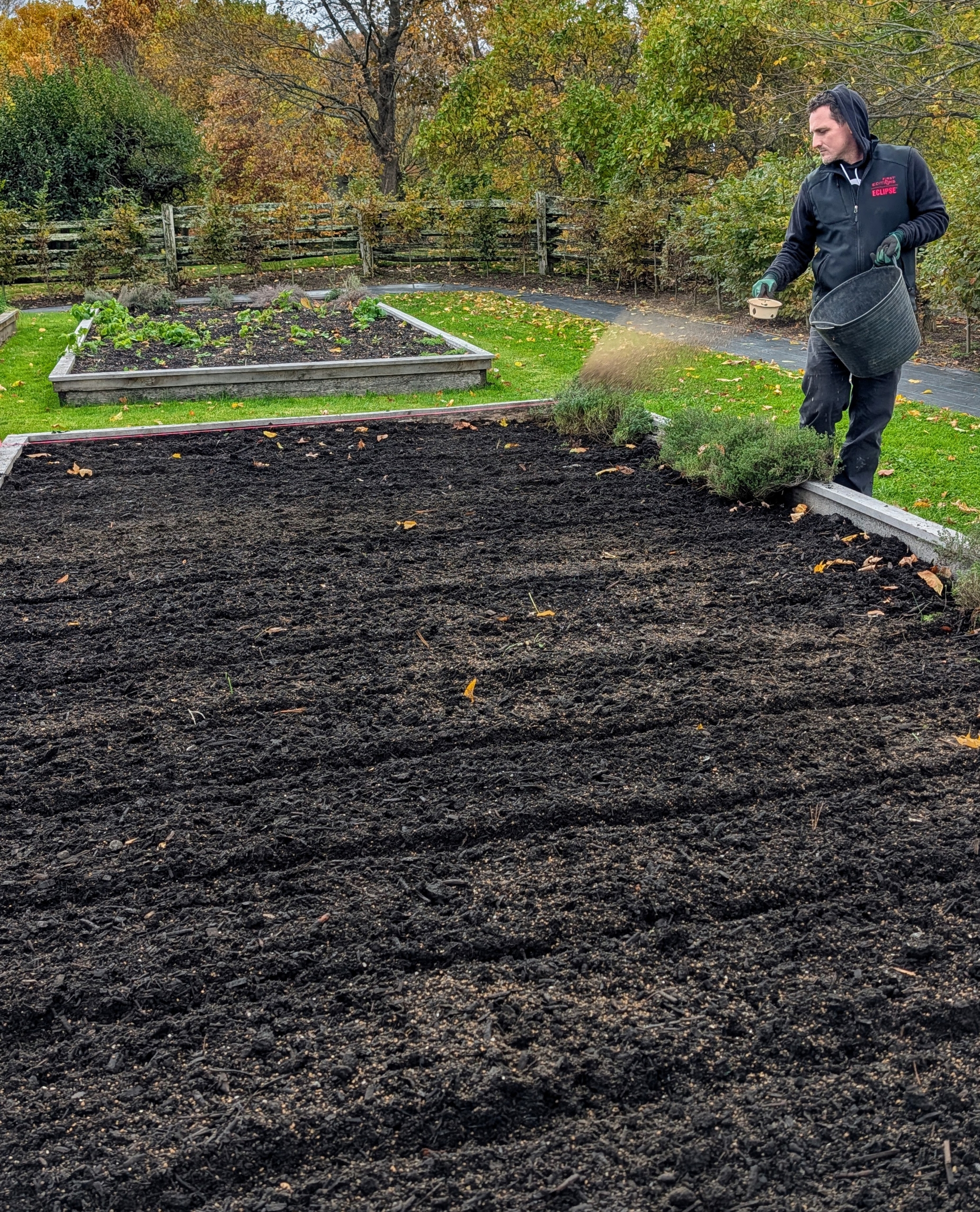 Using a scoop, Ryan broadcasts a generous amount of fertilizer over the beds.