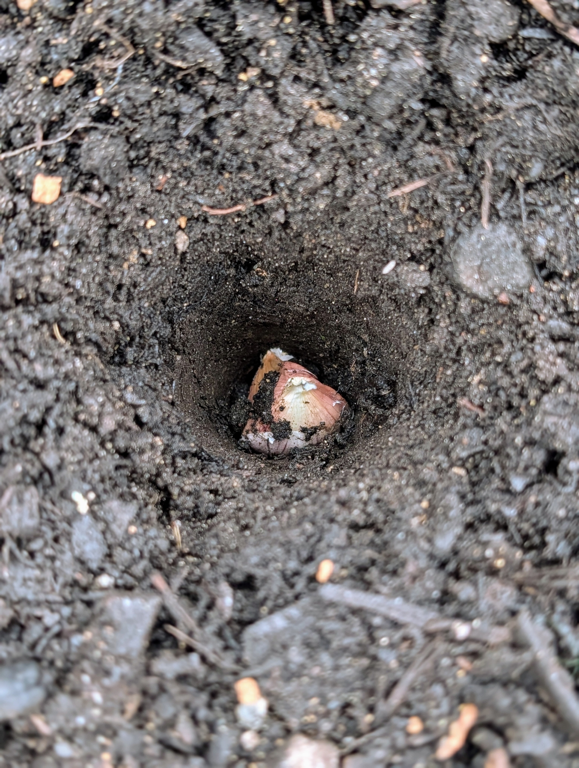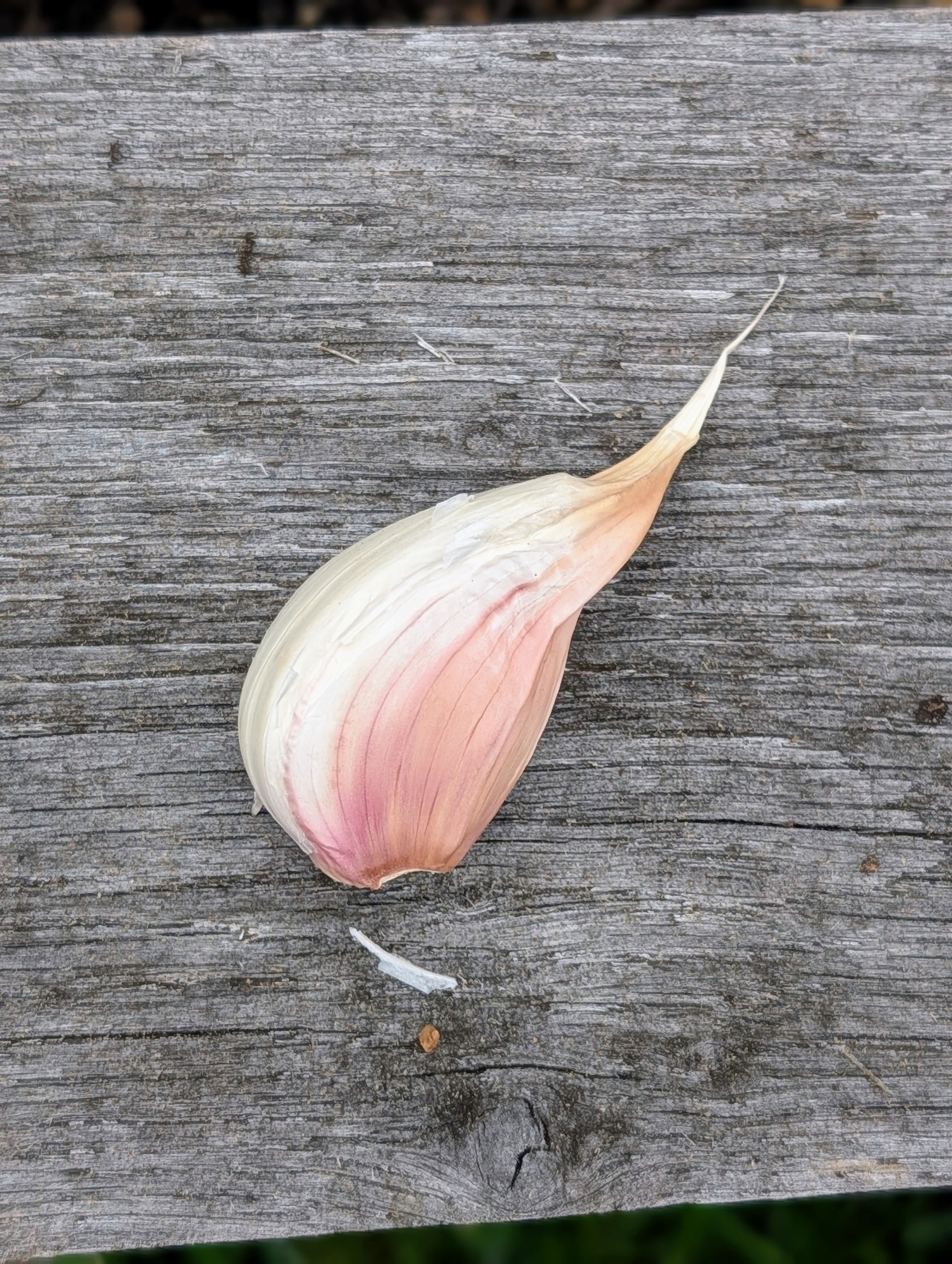 Here is a seed garlic clove. It is planted with the pointed end faced up. The majority of garlic in the US is planted from mid-October through November before the ground freezes.