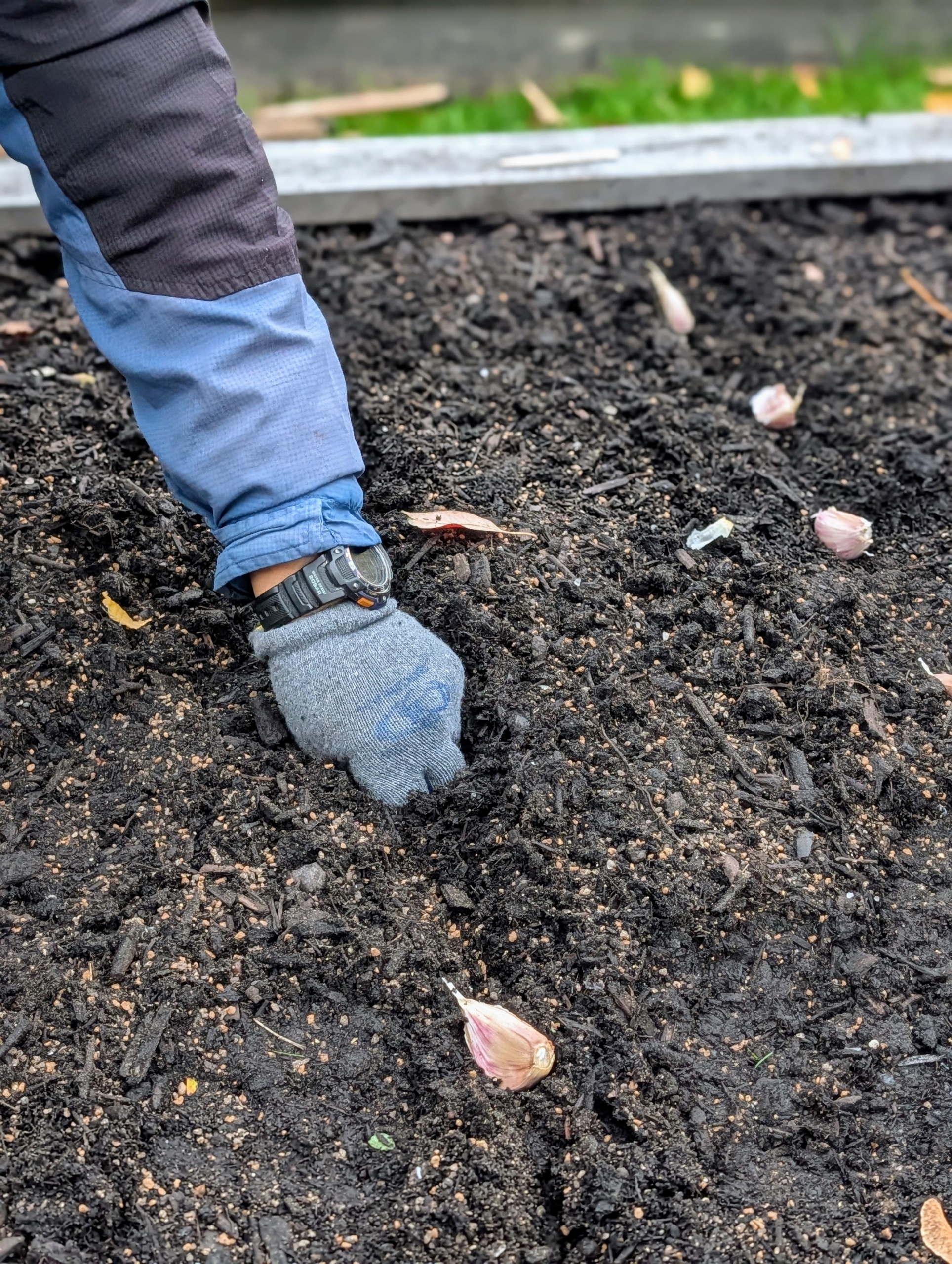 Ryan positions each clove. When planting multiple rows of garlic, be sure the rows are at least one-foot apart.