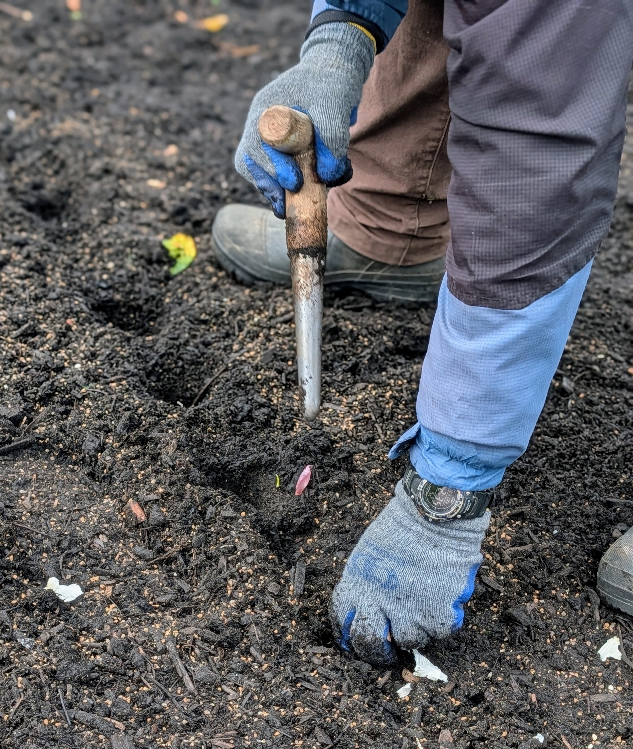 To make the holes for planting garlic, Phurba uses a dibble or a dibber. The T-grip on the dibber allows the planter to apply enough pressure to create a consistent depth for each hole.