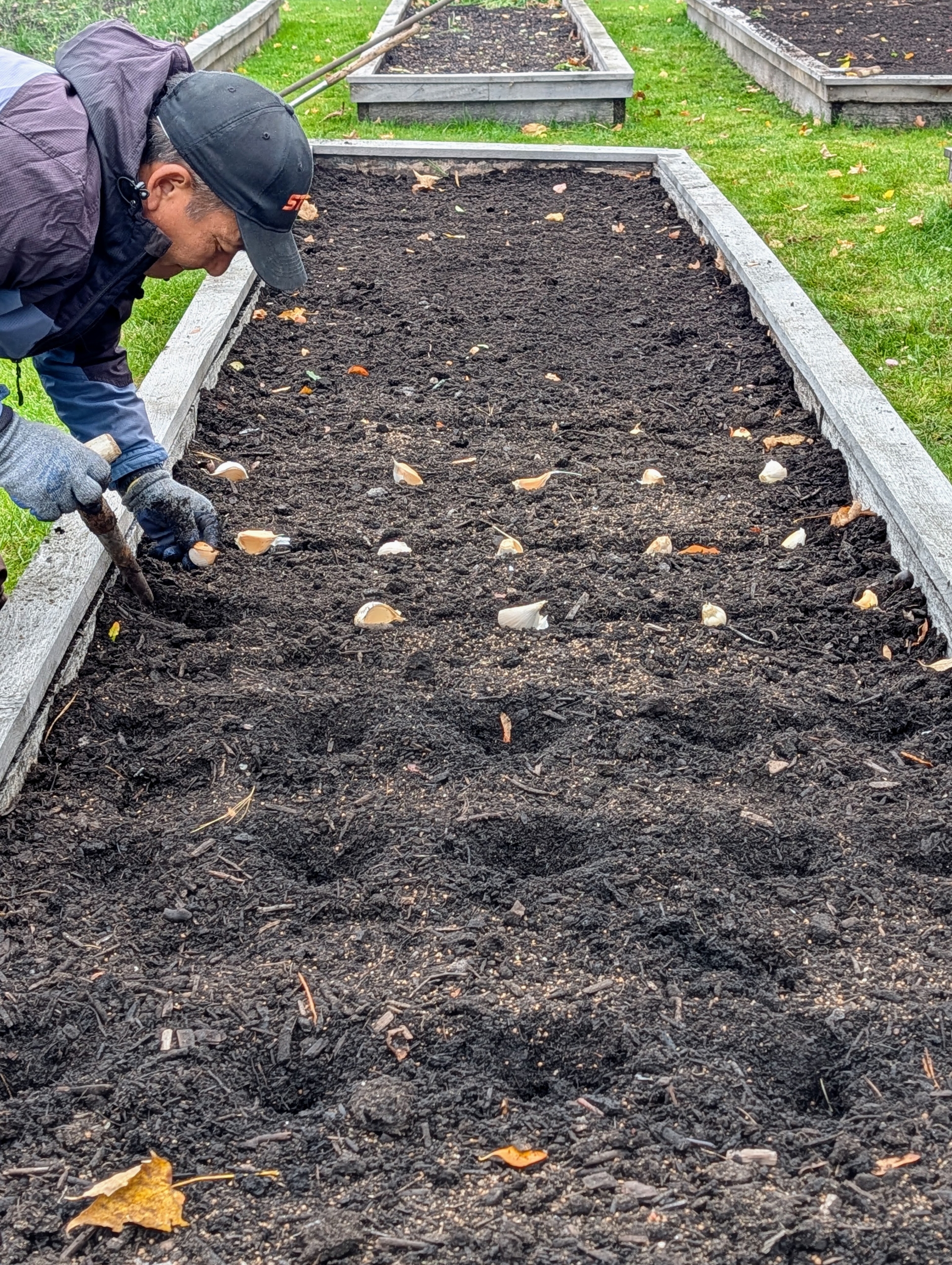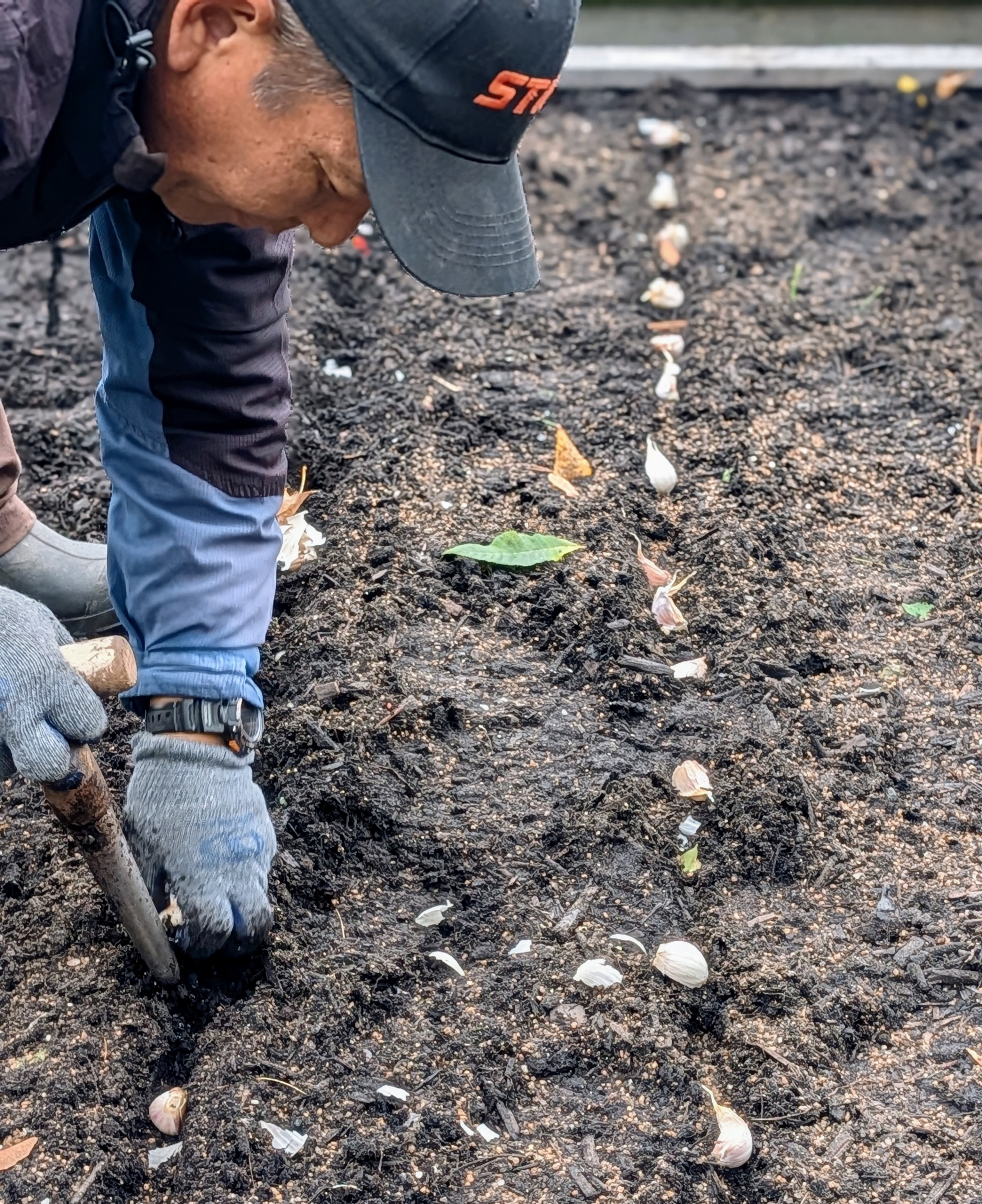 Ryan and Phurba work in tandem – as one places the seed garlic in the row, the other plants it. If the soil in the bed is well cultivated, this should be a fast and easy process.