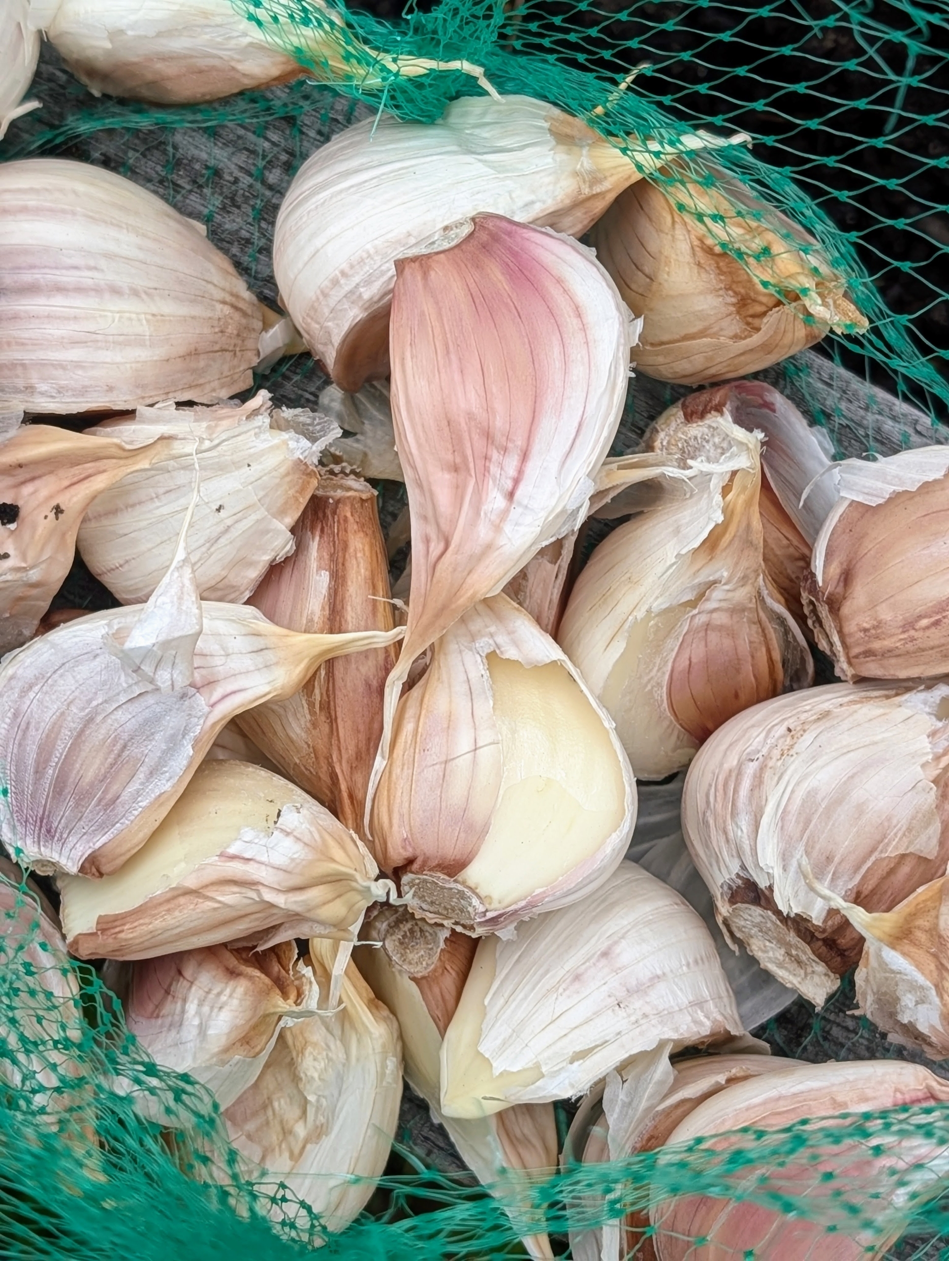 Once all the garlic is put through the preparation process, the cloves are returned to their mesh bags. One bulb is left whole and kept with its variety bag in case needed.