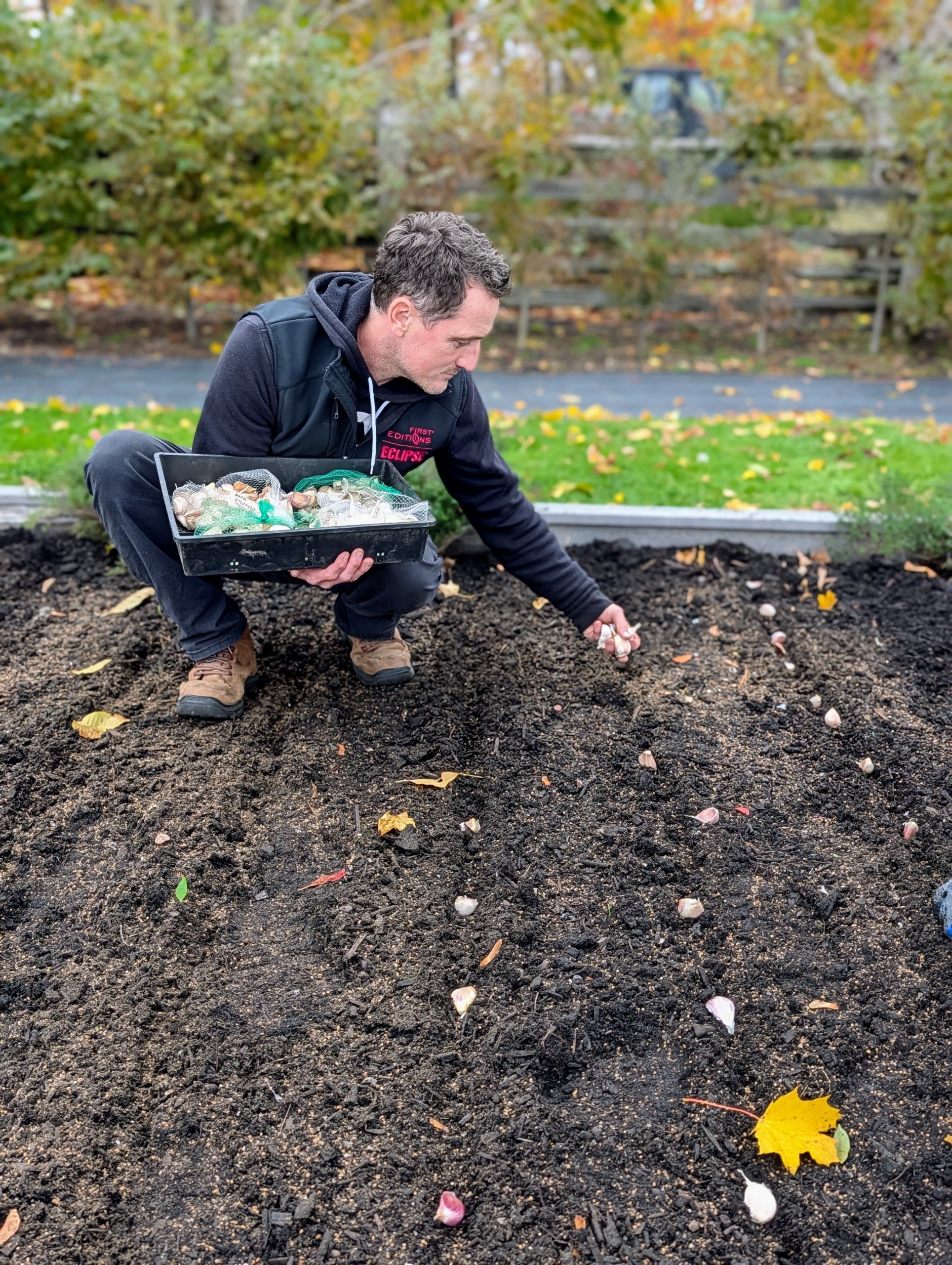 Although garlic can be planted in the spring as soon as the ground can be worked, fall planting is recommended for most gardeners. This allows extra time for the bulbs to grow and become more flavorful for the summer harvest. Every year, I plant a big crop of garlic from Keene Garlic, a family owned farm in Madison, Wisconsin. Yesterday, my head gardener Ryan McCallister prepared the garlic for planting.