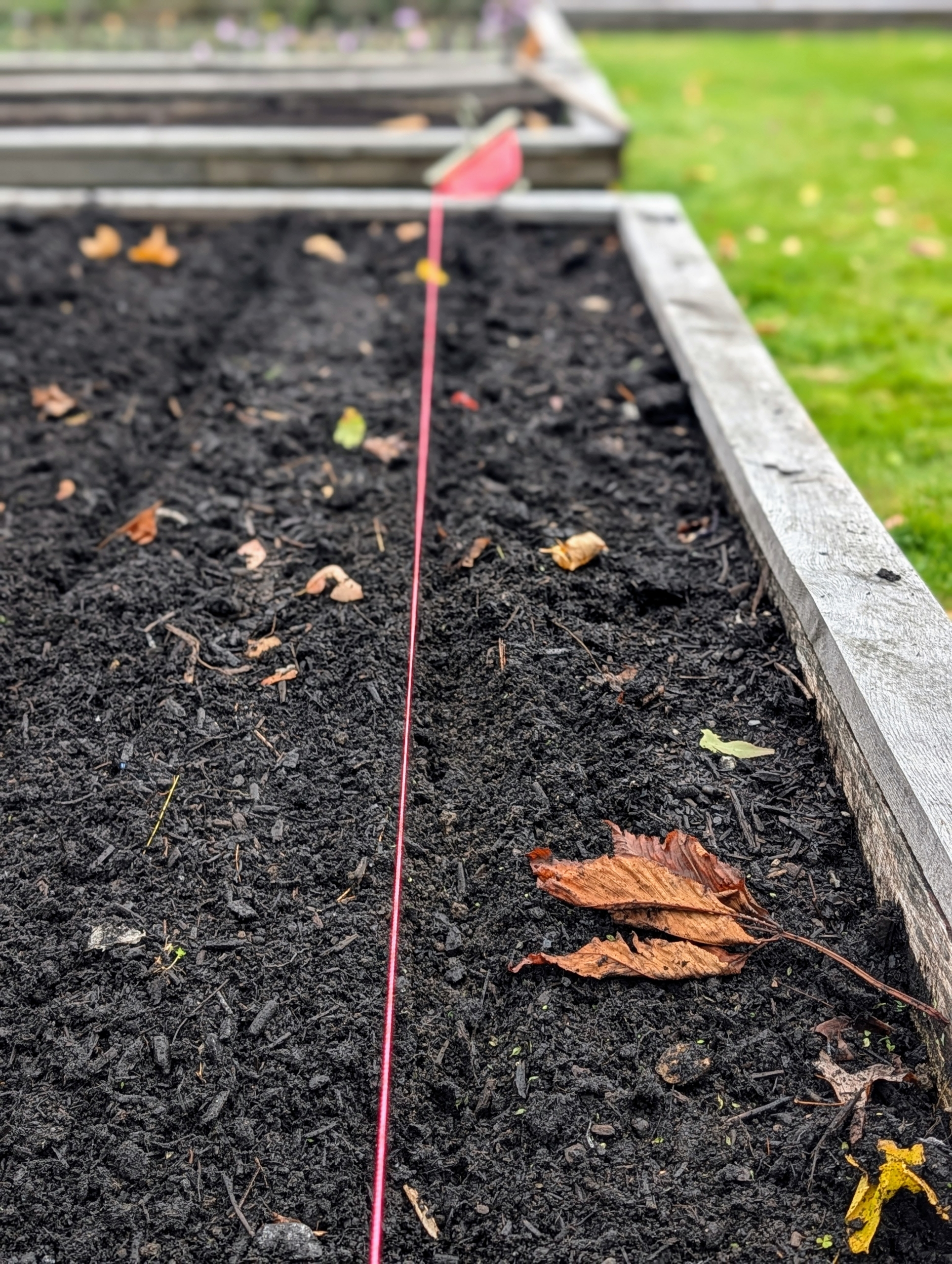 Landscape string is secured at one end to ensure the rows are perfectly straight. This is a guide for all the other rows in the bed. Ryan already determined how many rows would fit in this bed and how many garlic cloves would be planted in each row.