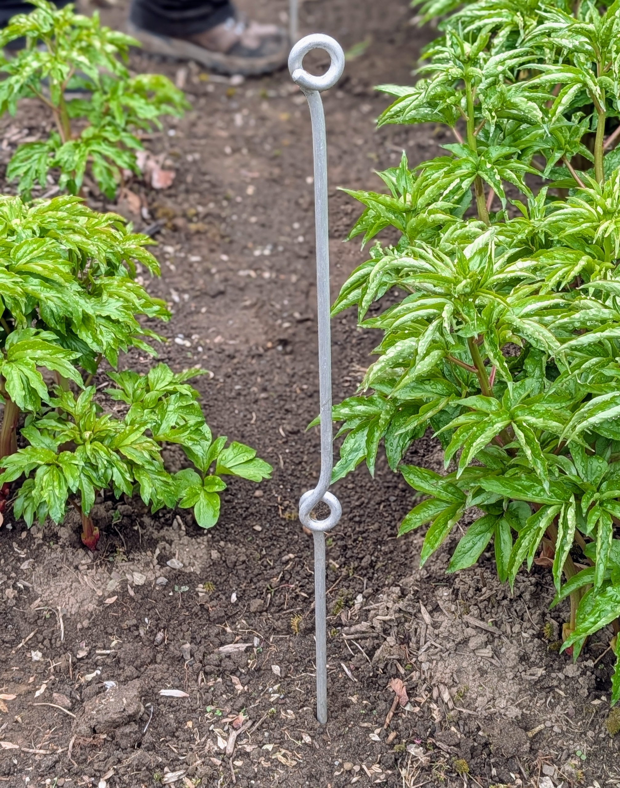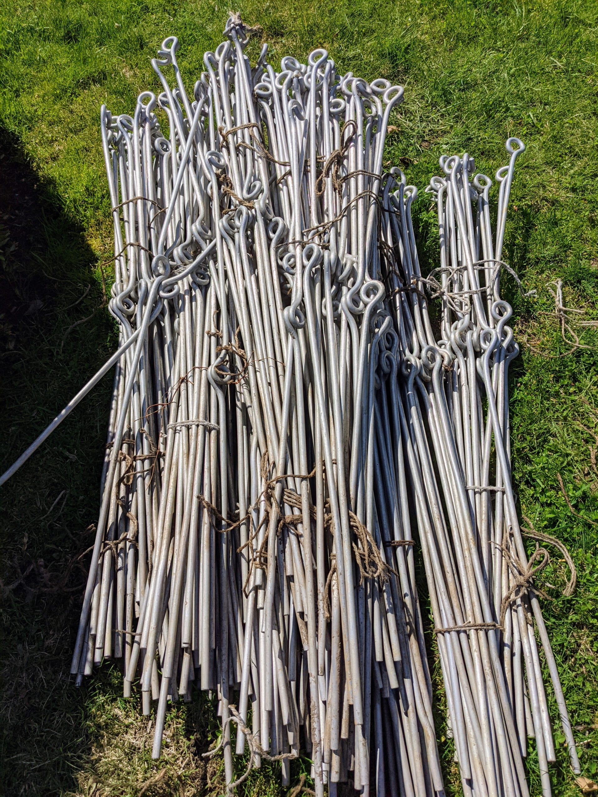 Each metal support has two eyes, one at the top and one in the middle. The stakes are about three feet tall.