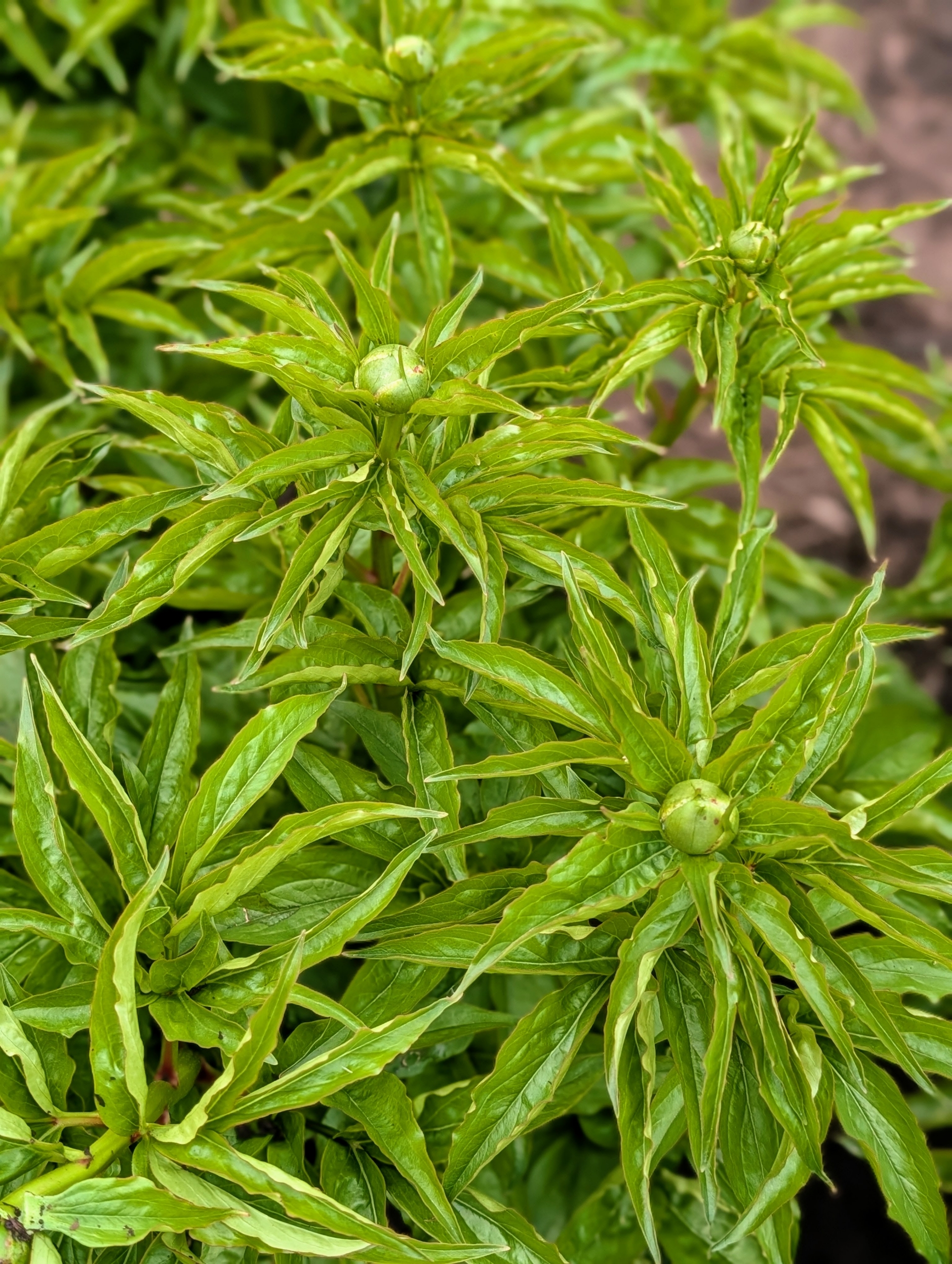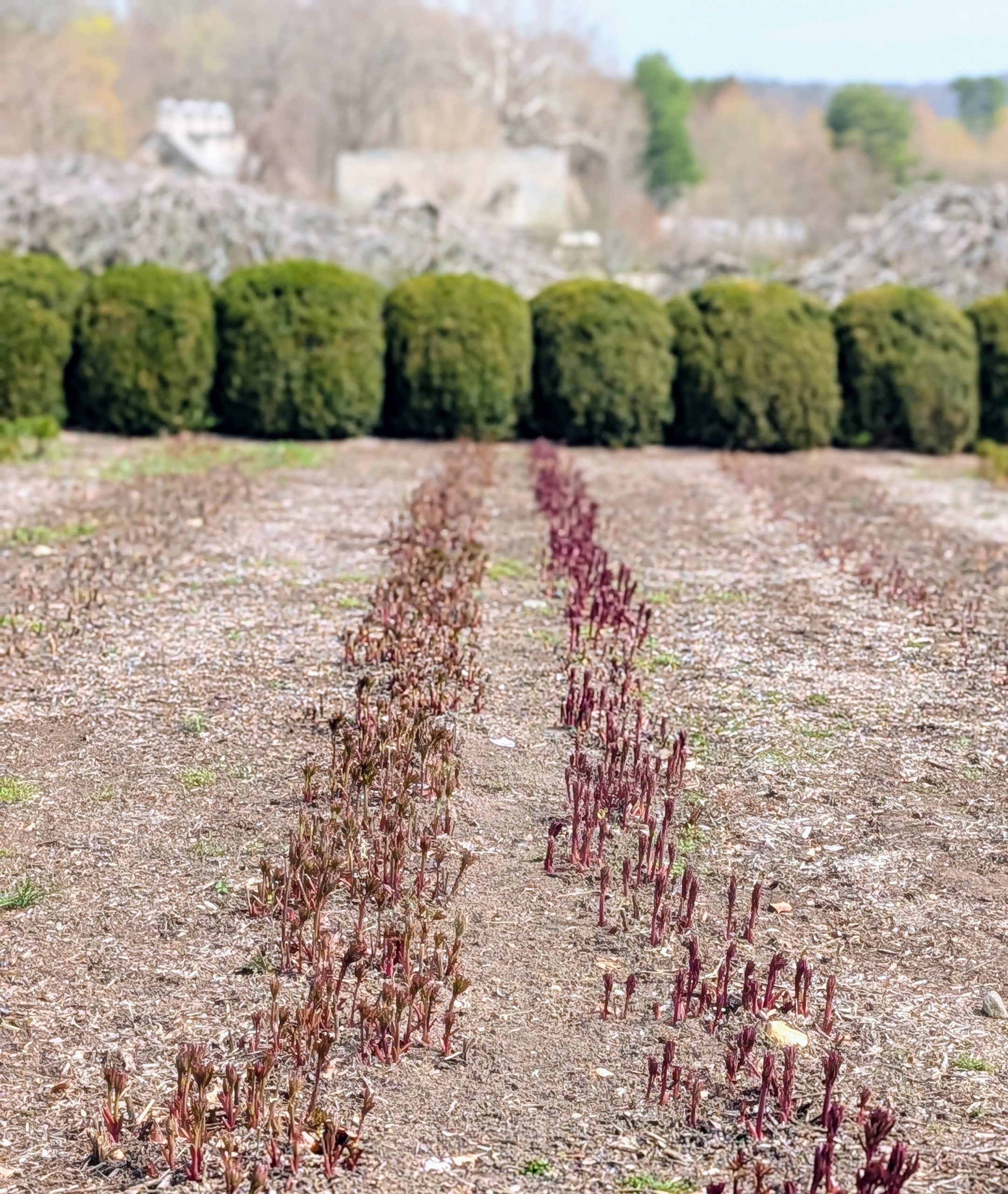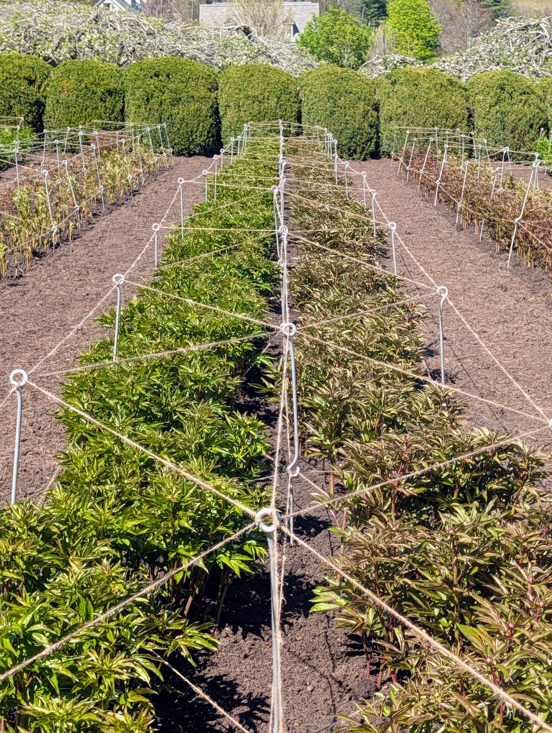 In April, the herbaceous peonies begin emerging from the ground, but they grow very quickly and need to be supported to protect the large heavy flowers. My peony garden is planted with 11 double rows of 22 herbaceous peony plants, 44 in each row of the same variety, all surrounded by a hedge of rounded boxwood shrubs, making it a focal point on the property.