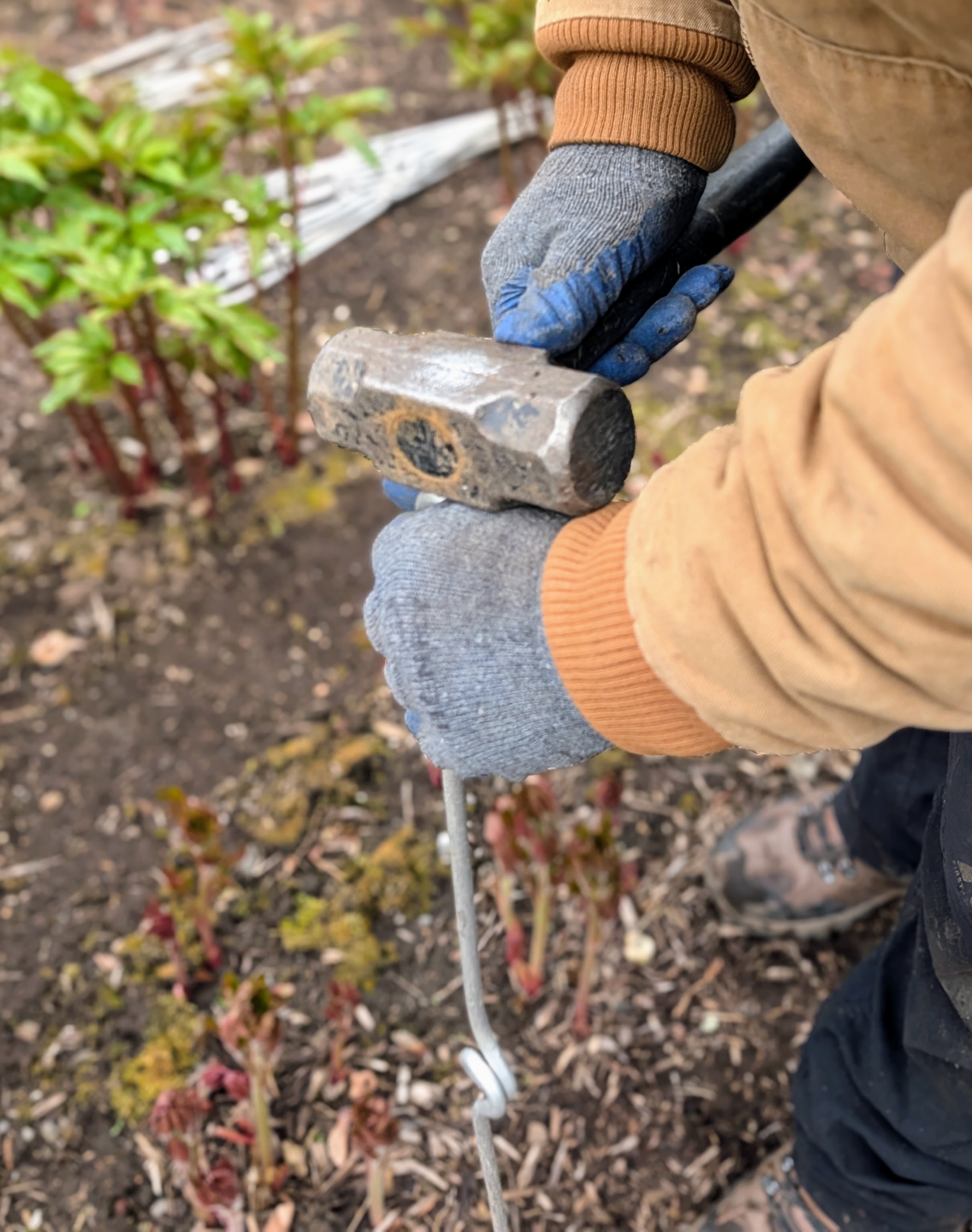 Instead of rings that are available at many garden centers, I use these metal stakes I designed myself for my own farm.