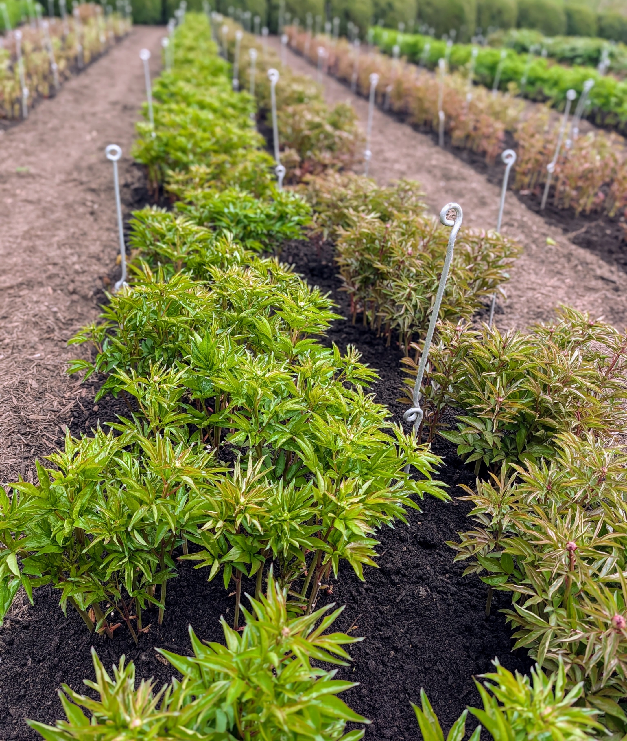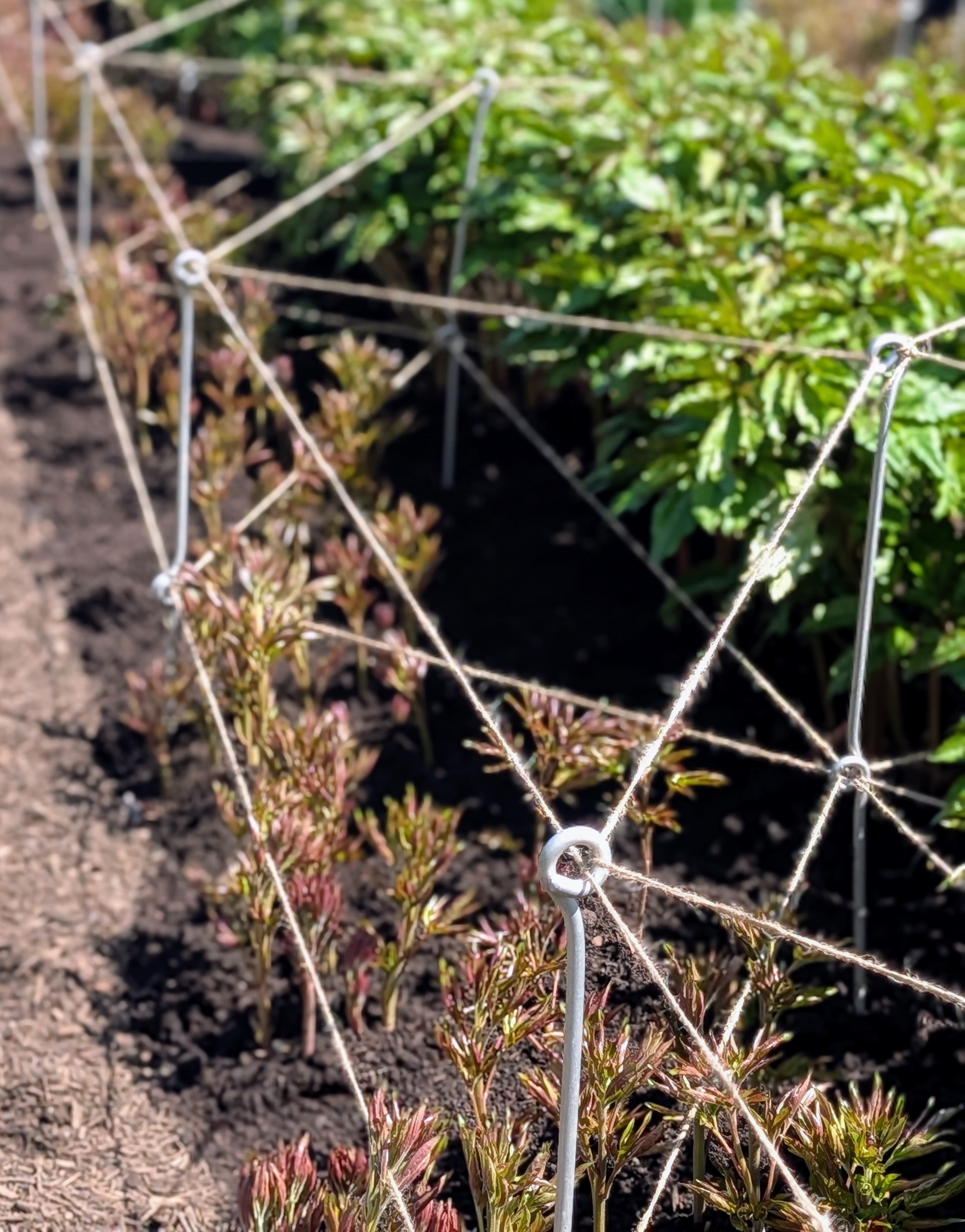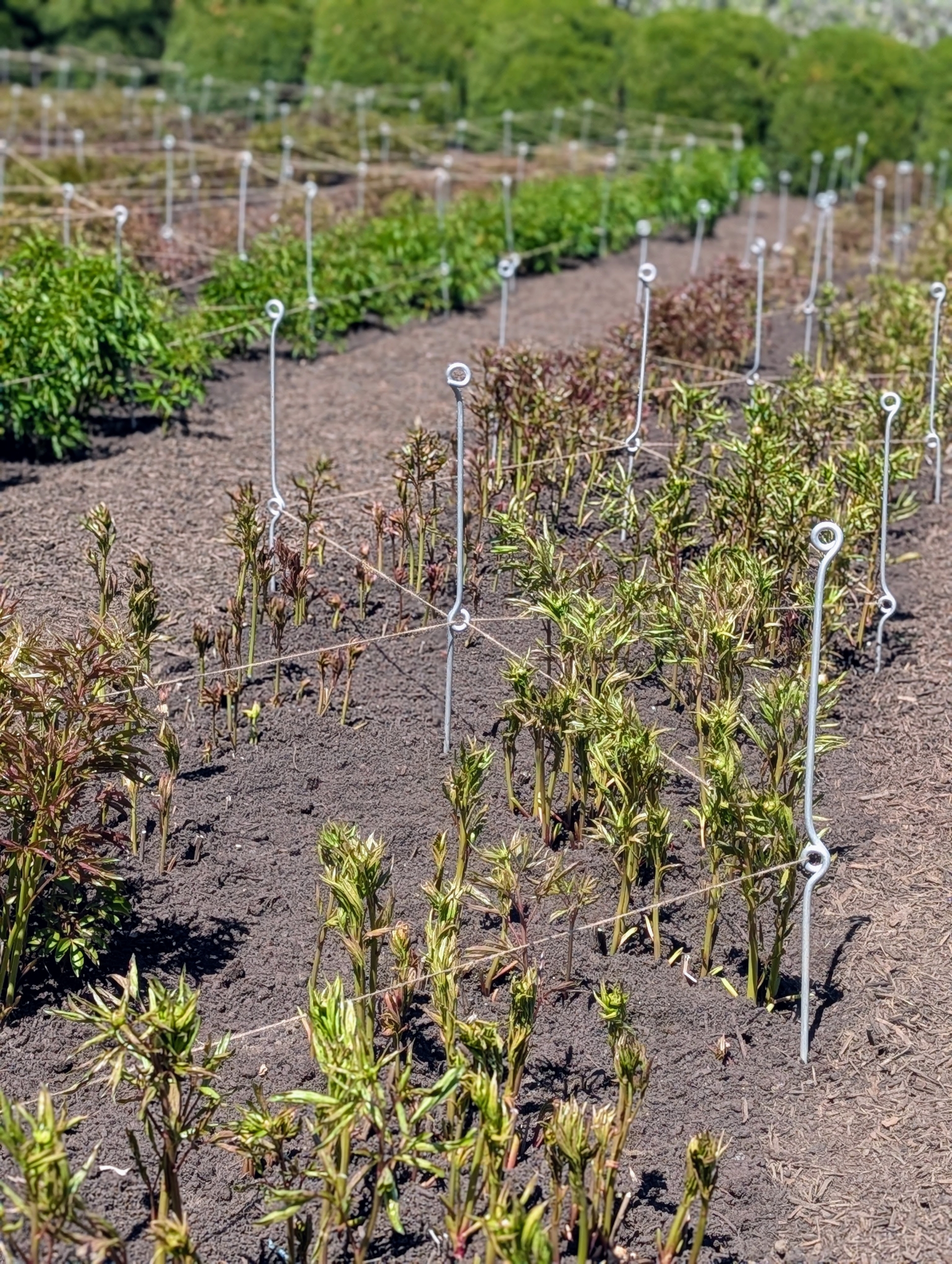 Here is what a row looks like all done – very neat and tidy, and every peony plant supported by twine. The stakes and twine create such an artistic and geometric pattern. In just about five to six weeks, rows and rows of stunning pink and white herbaceous peonies will be flowering here at my farm.