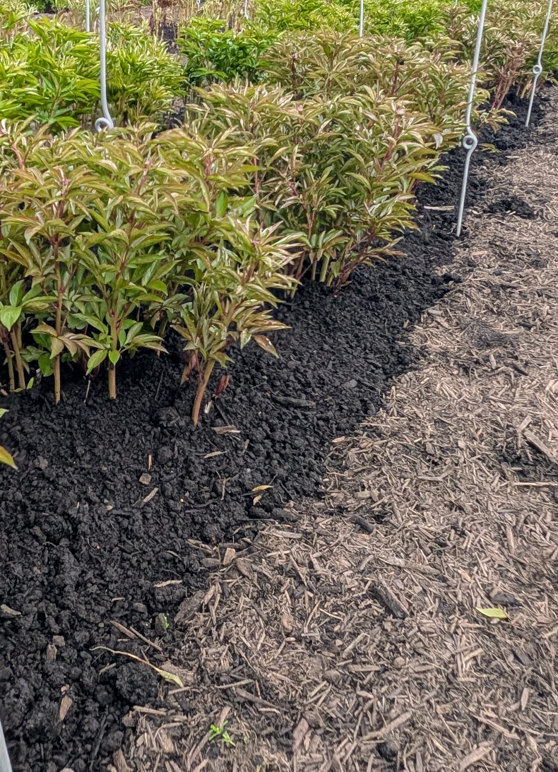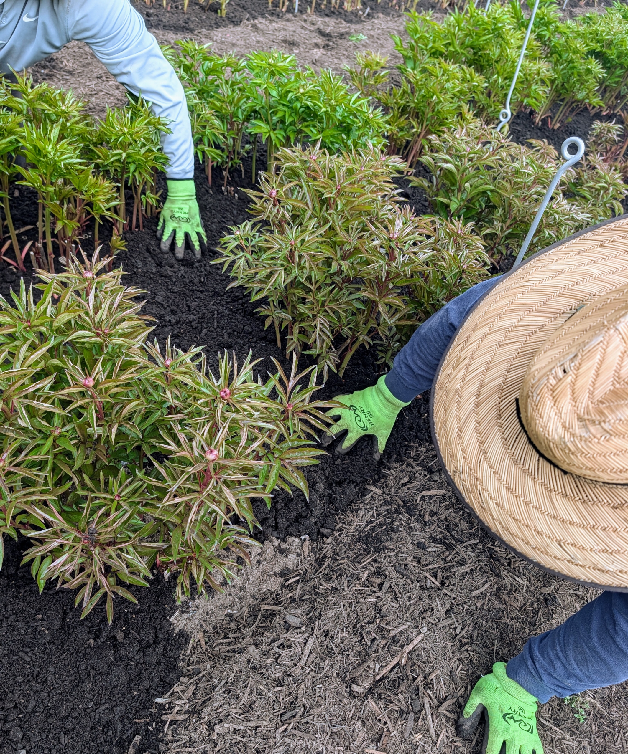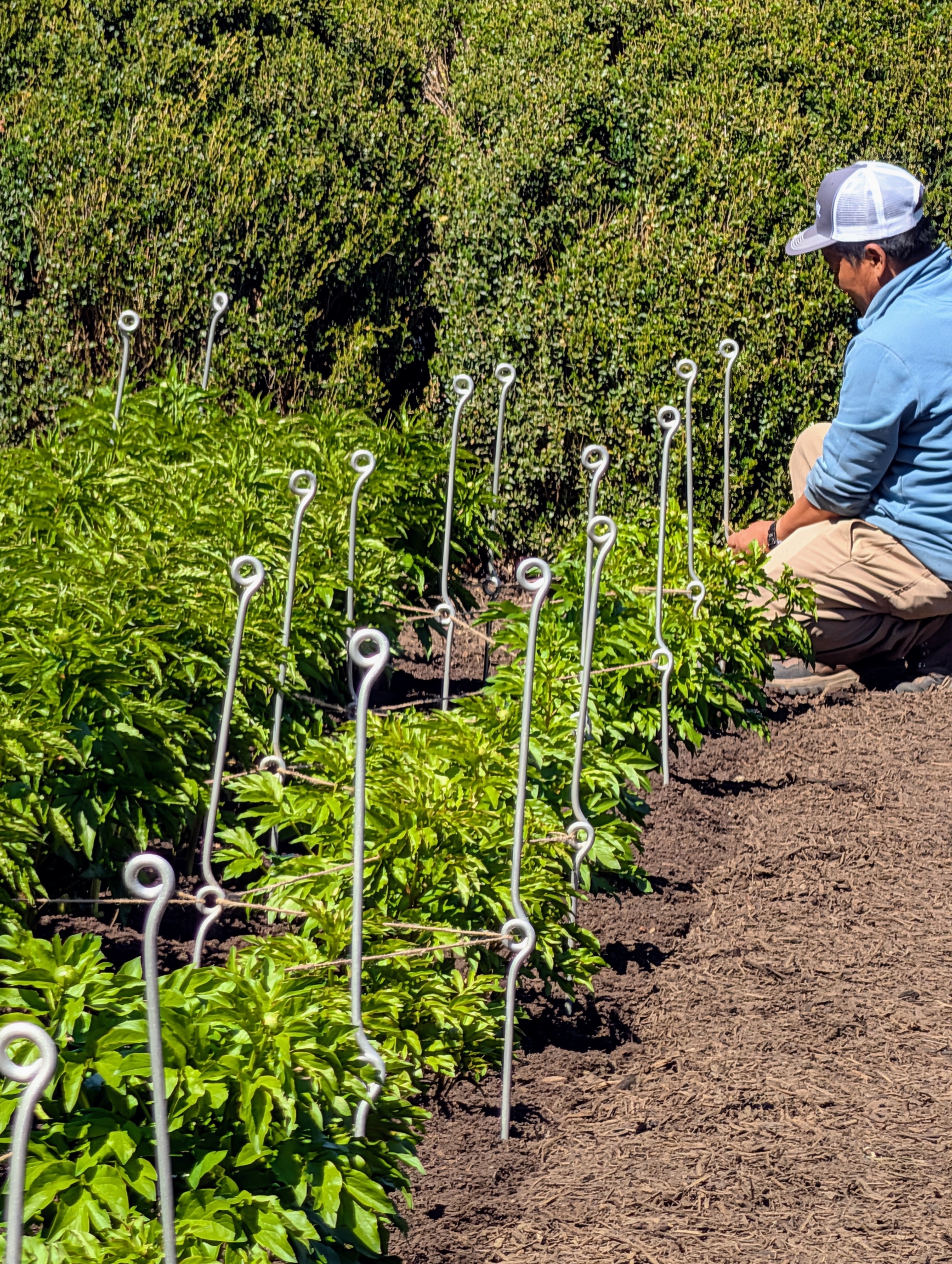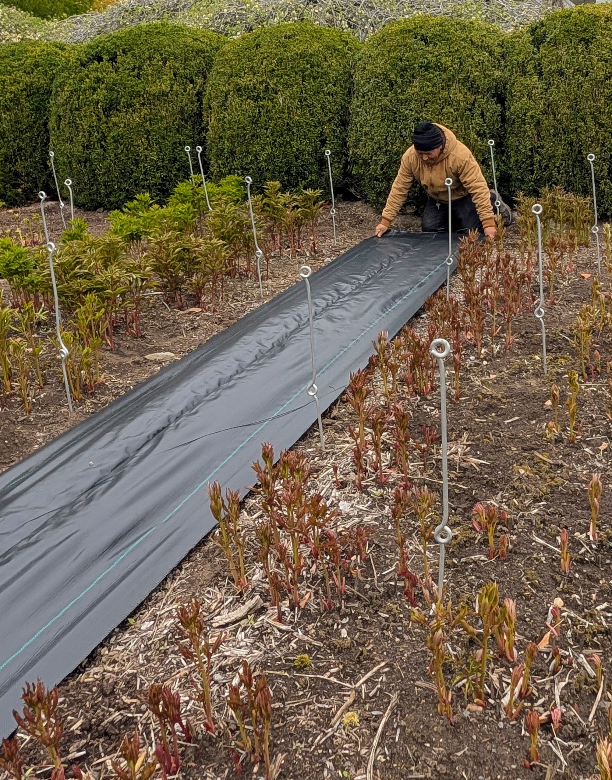 Here is what a row looks like all done – very neat and tidy, and every peony plant supported by twine. The stakes and twine create such an artistic and geometric pattern. In just about five to six weeks, rows and rows of stunning pink and white herbaceous peonies will be flowering here at my farm.