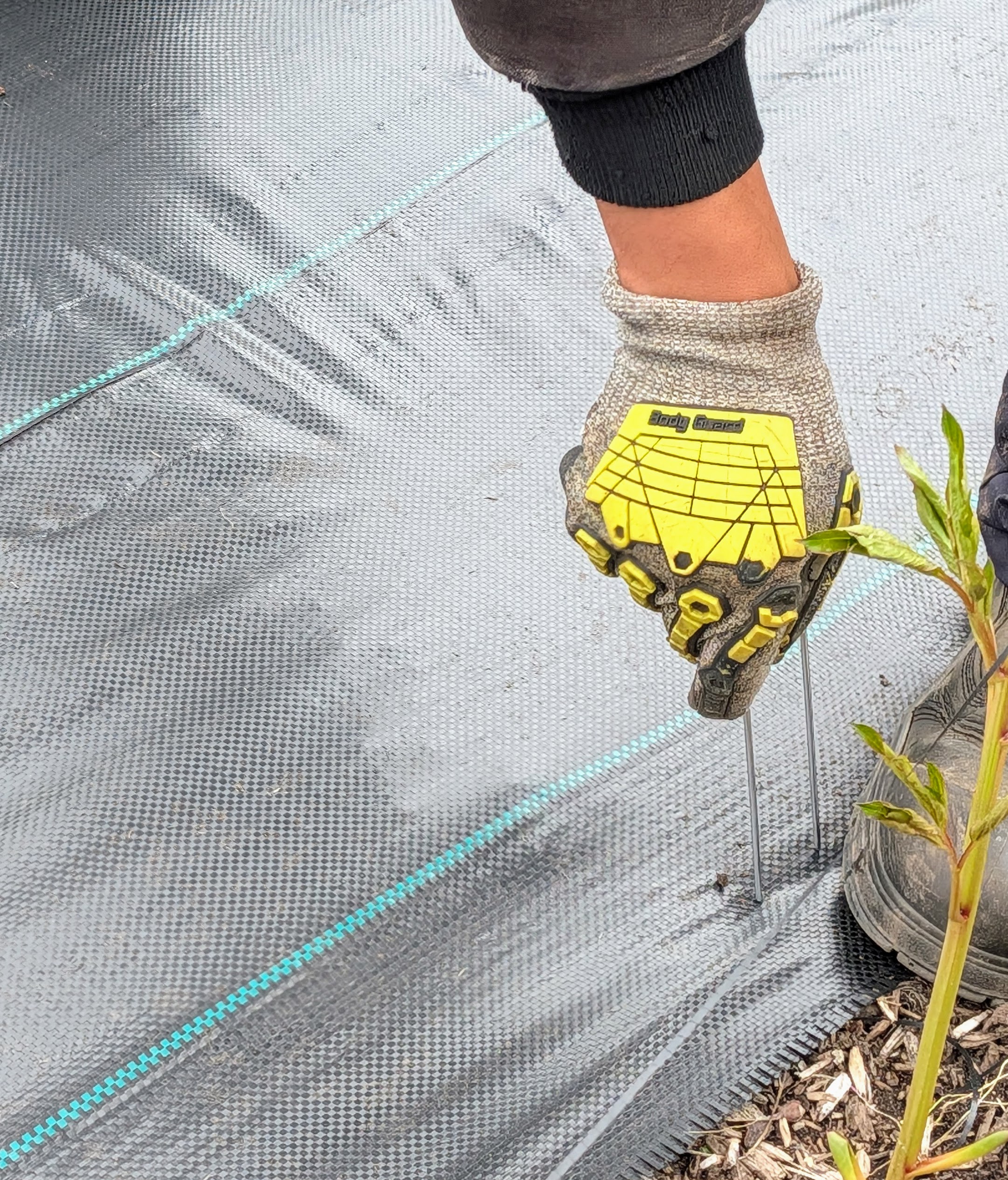 As the weed cloth is unrolled and positioned in the space, Matthew inserts a garden staple. These are placed every couple of feet on the edges and in the center to ensure the fabric stays in place.