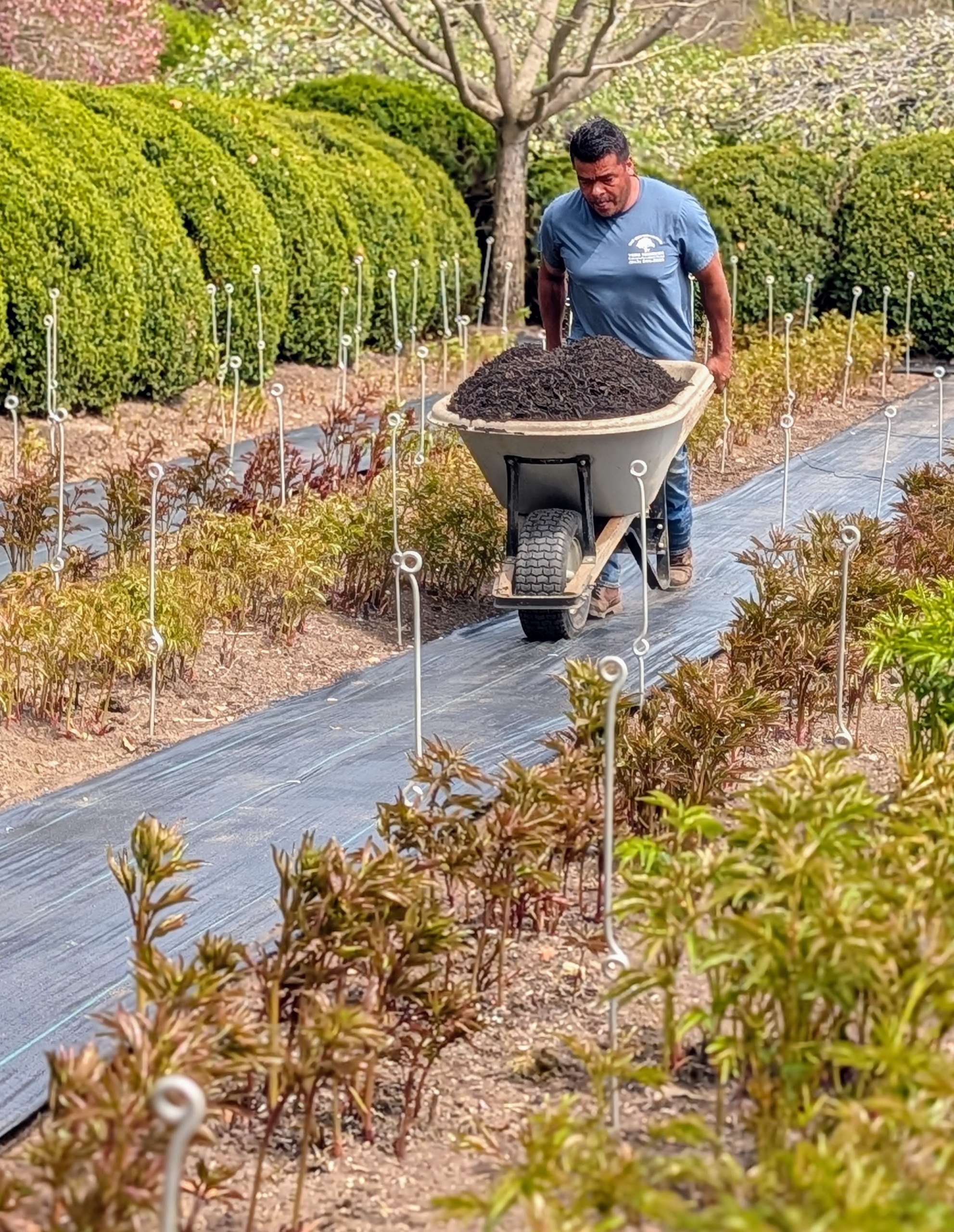 After the weed cloth is put down, wheelbarrows of mulch are brought into the garden.