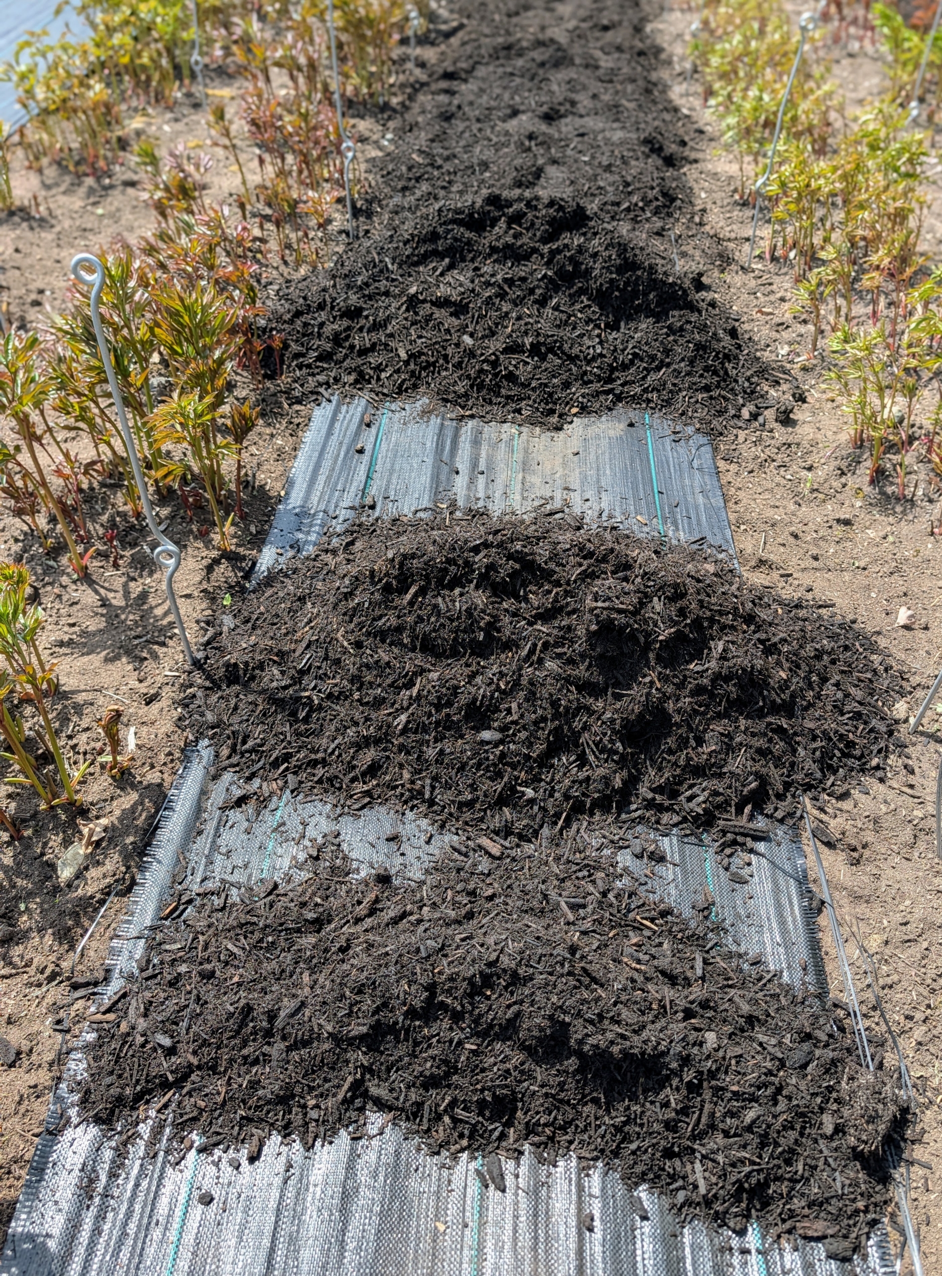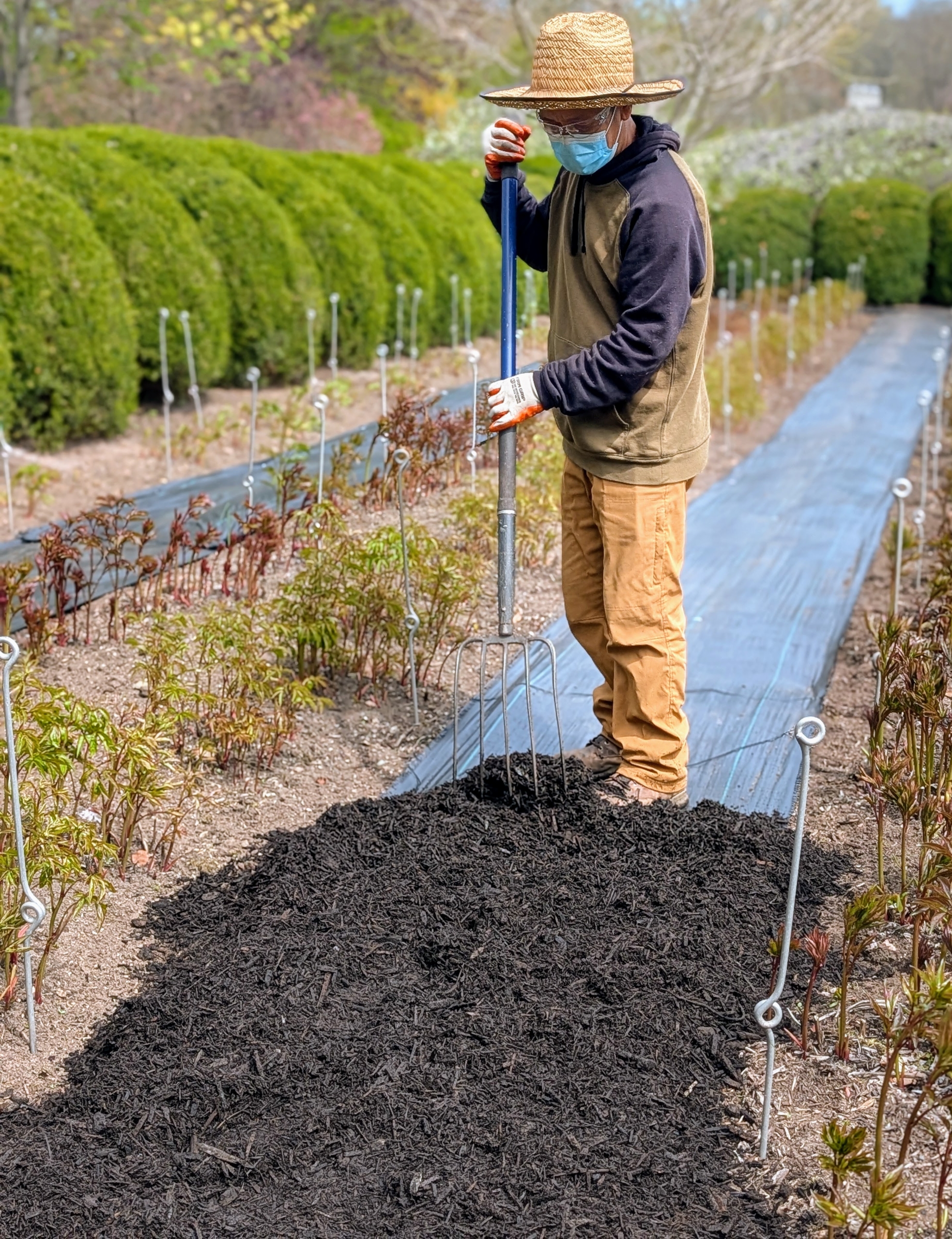 Arnold drops manageable mounds of mulch in each row.