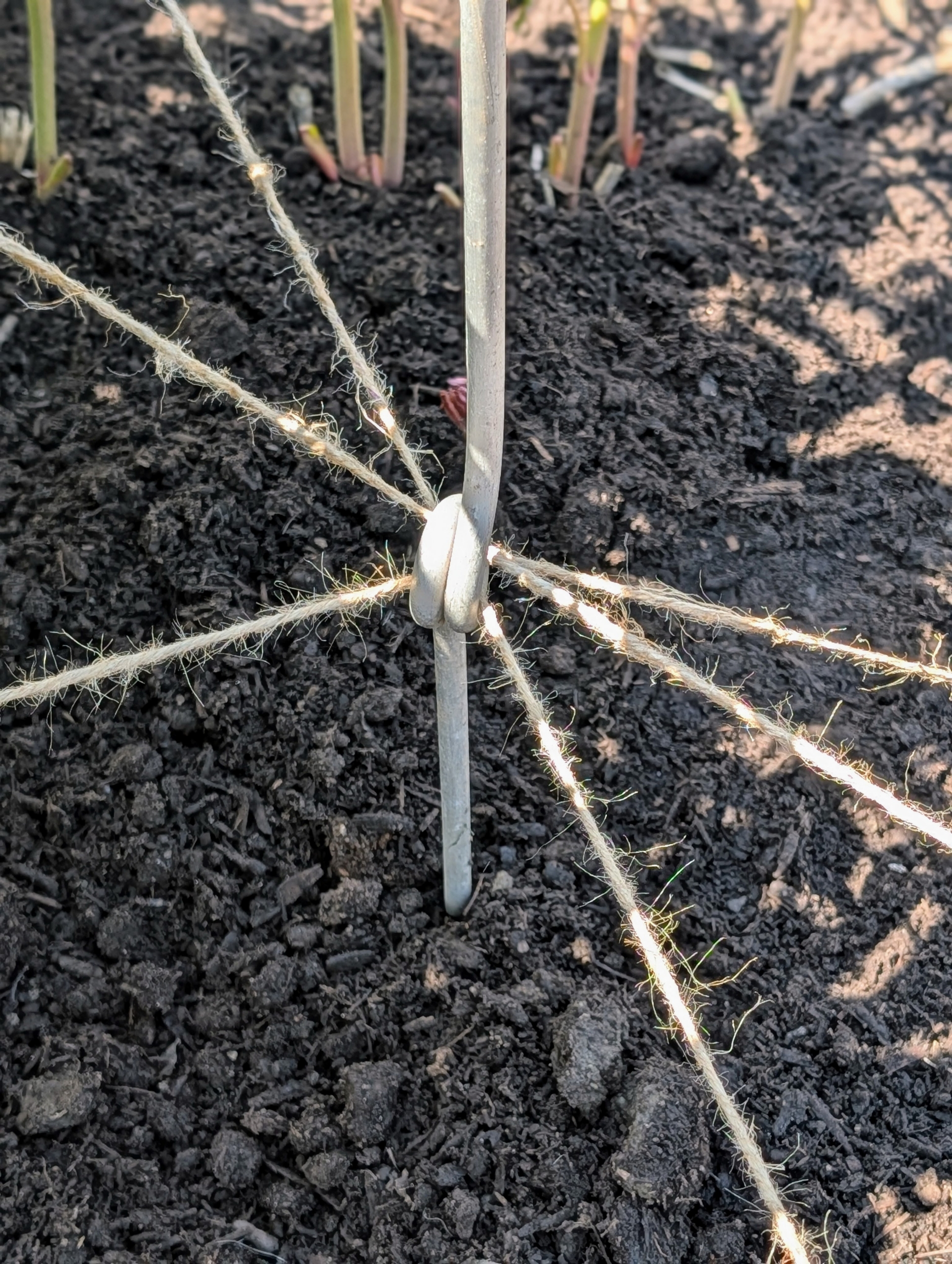 Twine is threaded through all the top holes following the same pattern. Here, one can see there is about a foot of space in between the top and middle eyes – enough room to support the stems at different levels.