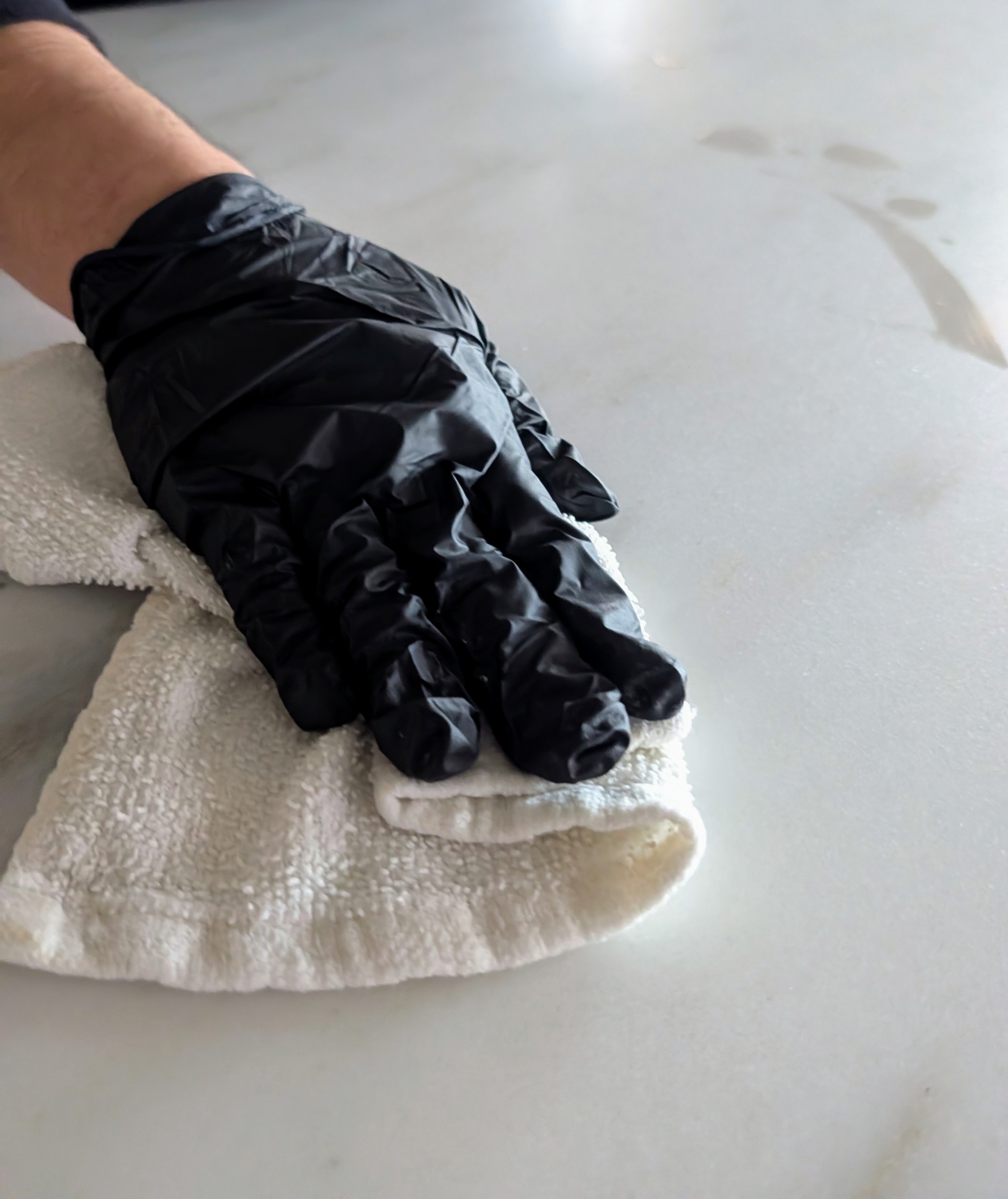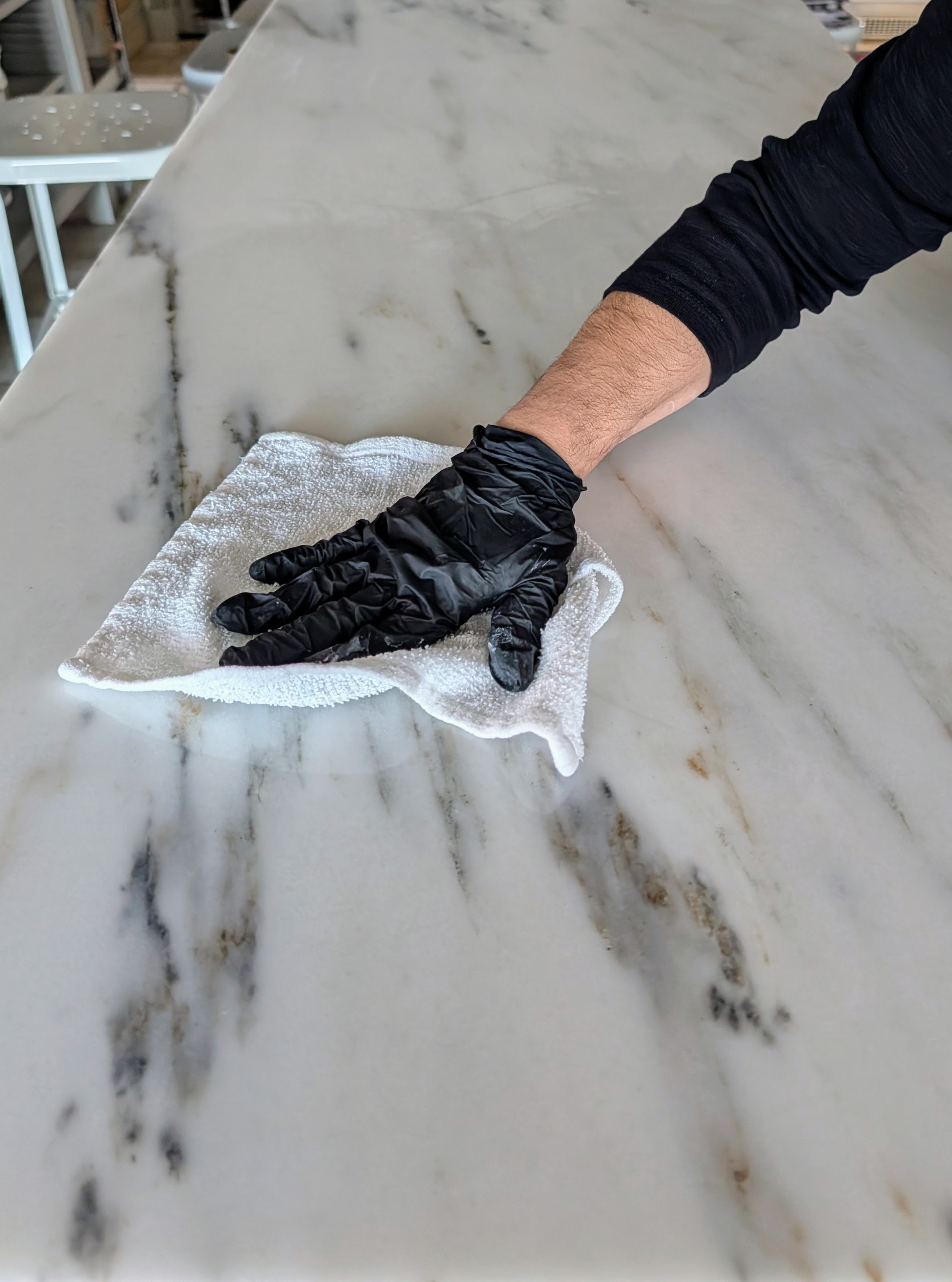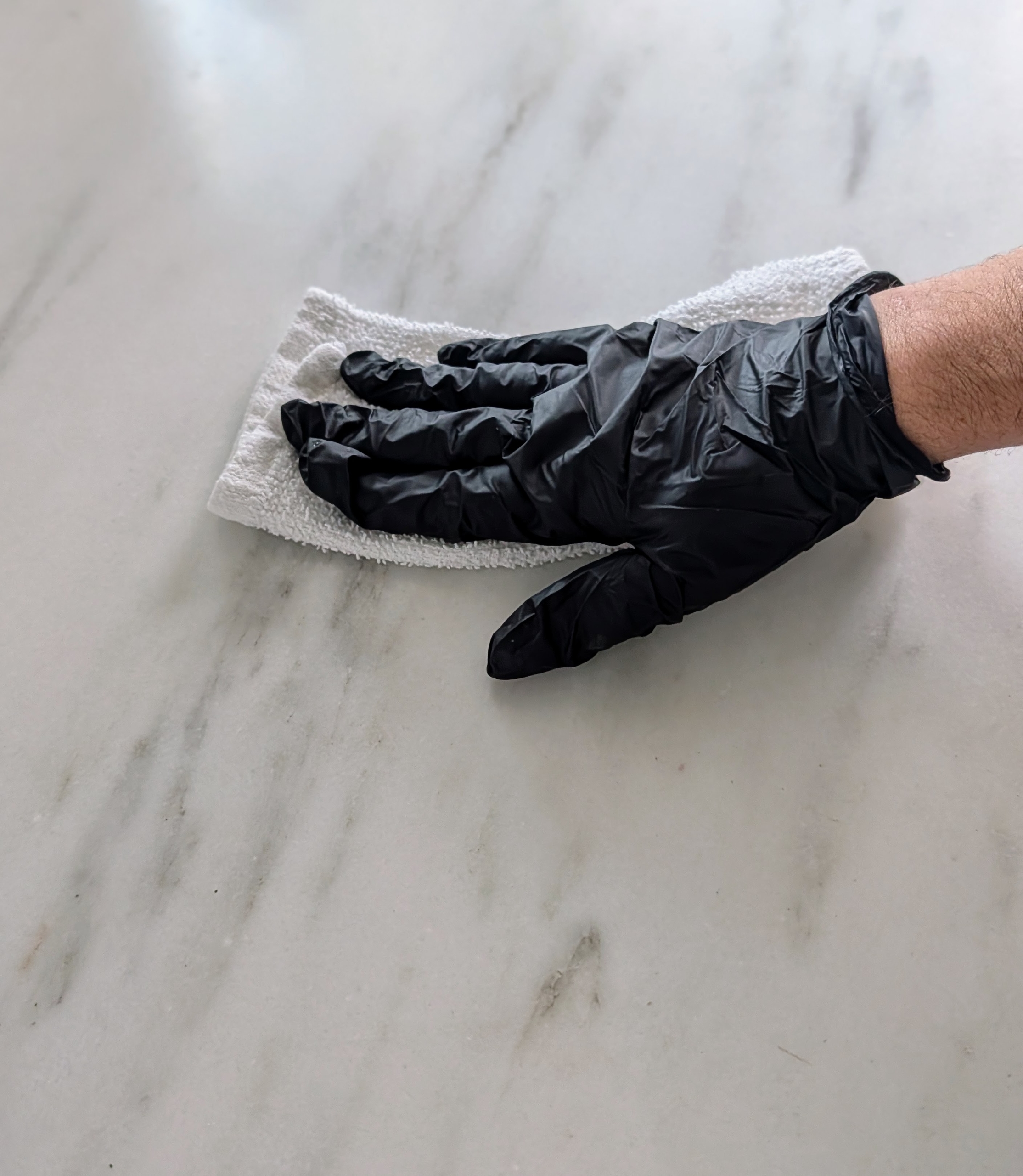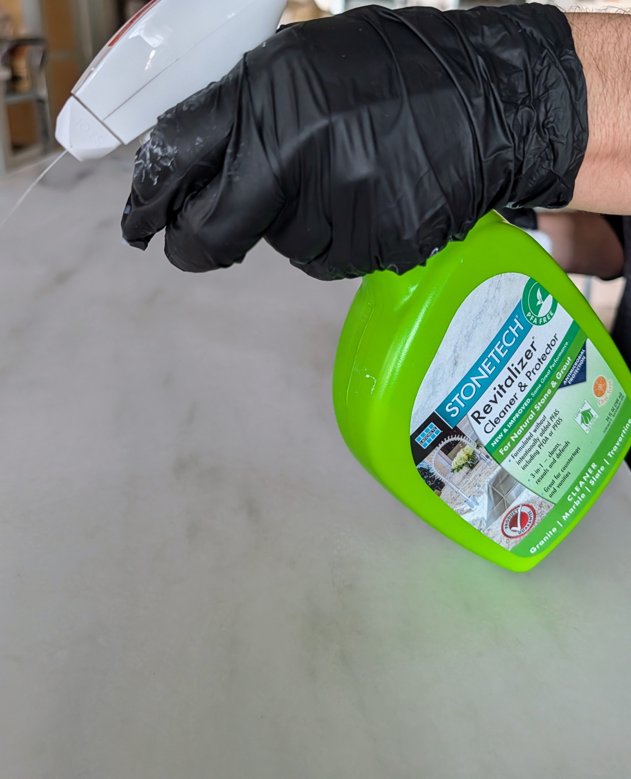 Like many of you, my kitchen is the main "hub" of my home. It's where I eat meals, meet with staff, and do a lot of my paperwork - all on my marble kitchen counters. And while they get cleaned frequently every day, after time they do get marks and rings typically caused by acidic substances that react with the calcium carbonate in the marble. Cleaning them with the right products was the next big chore on my list.