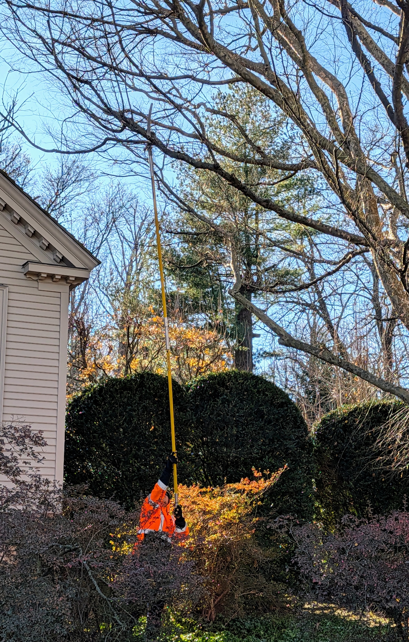 Branches closer to the ground are cut with a telescopic long reach pruner.
