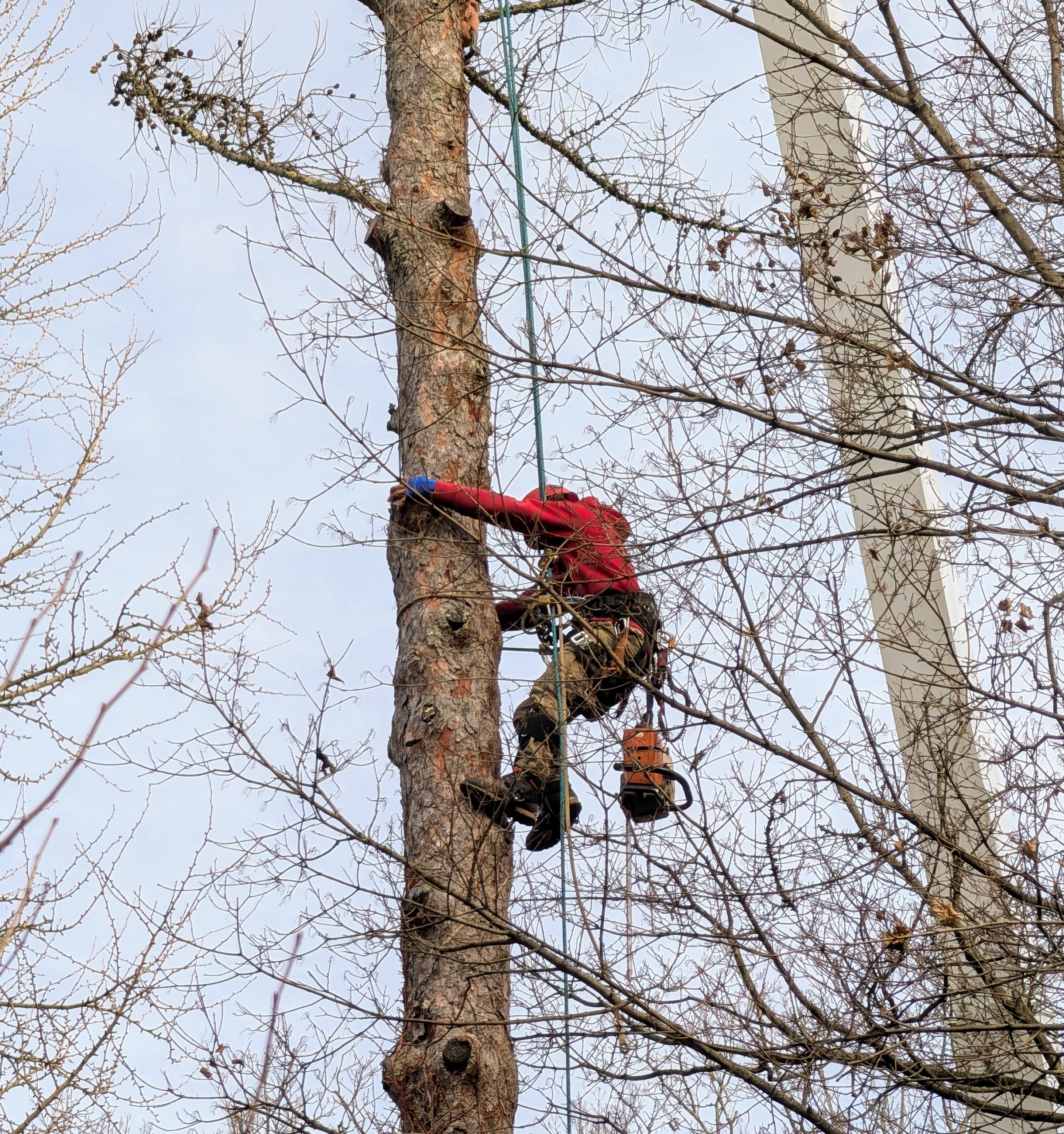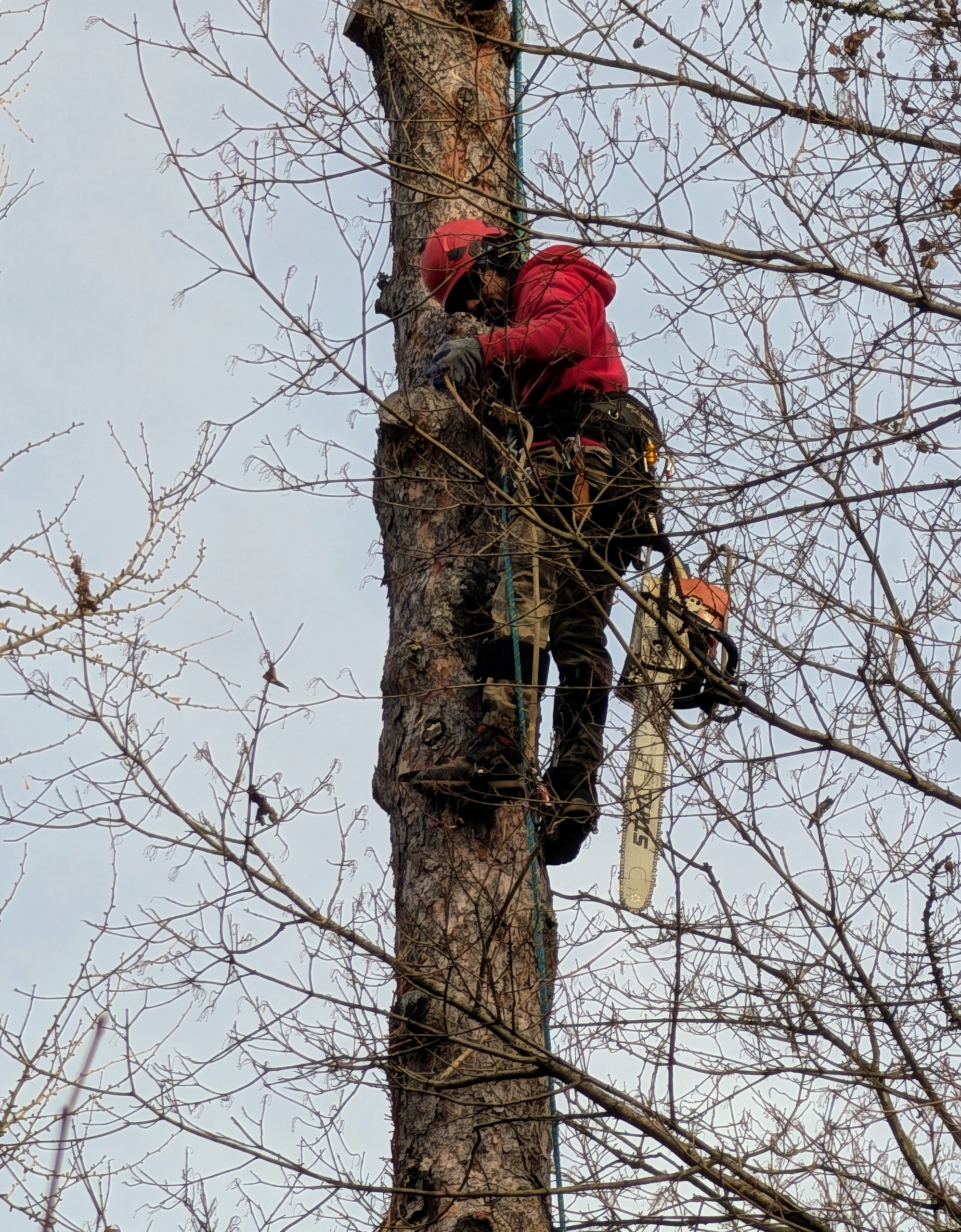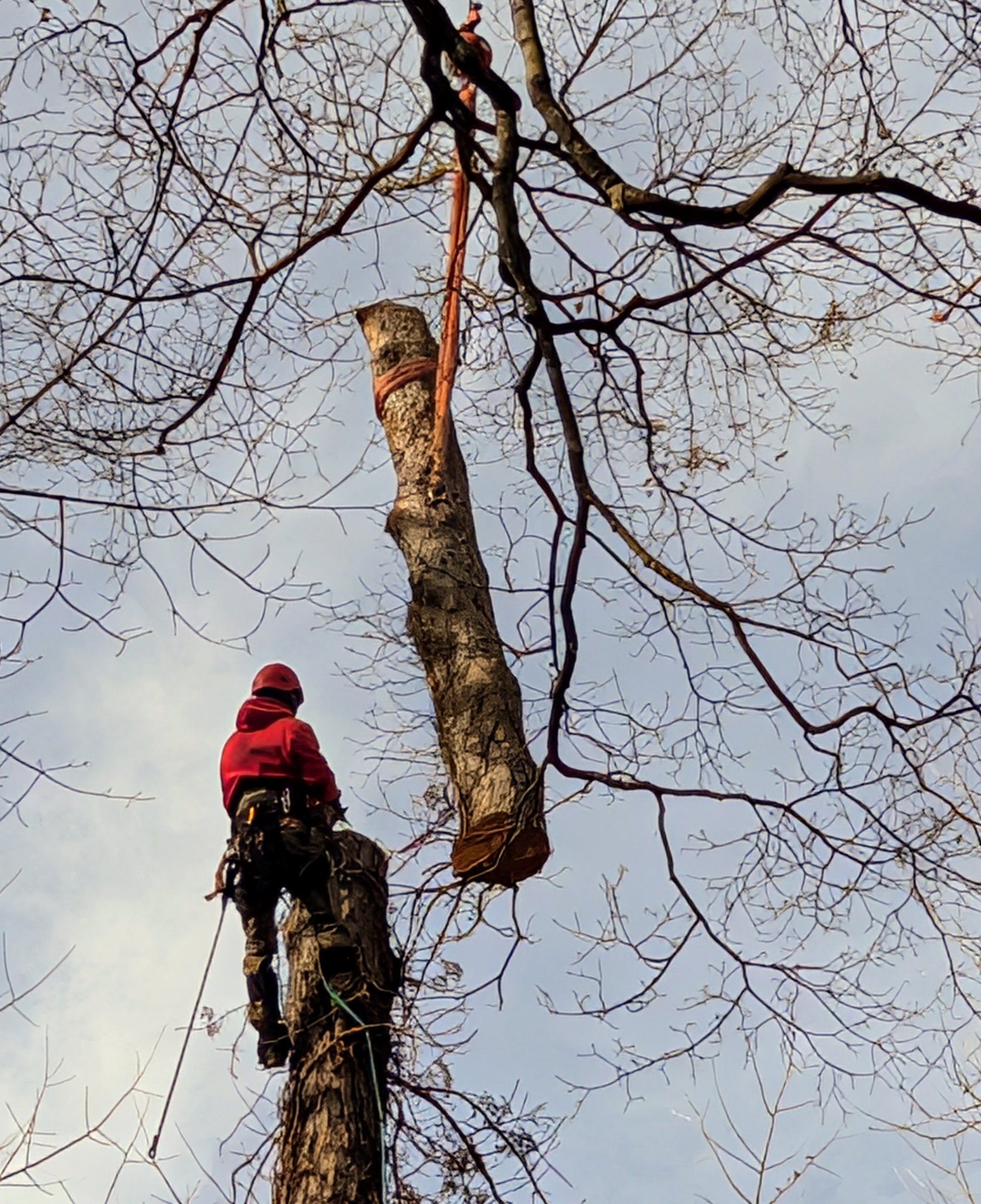 Ray, the arborist, secures the sling to the top and then works his way downward to cut off the next section. Arborists wear climbing spurs designed with spikes to ascend trees by penetrating the tree trunk.