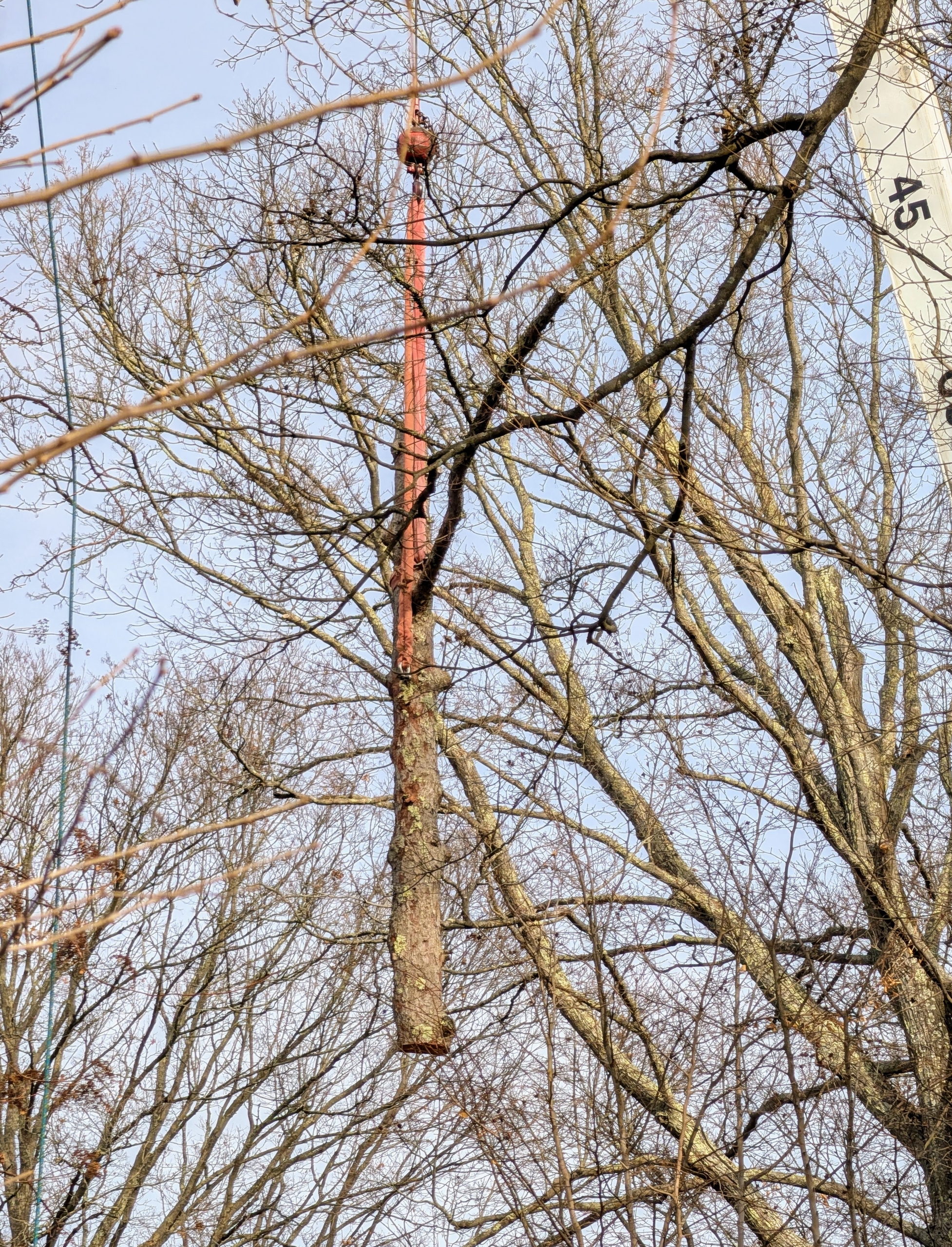 Here is another section of tree on its way down. The crane is maneuvered a good distance from any other trees, structures, or people.